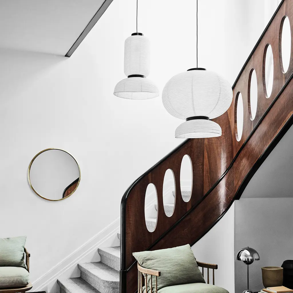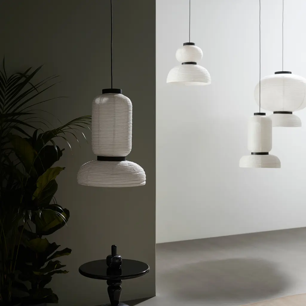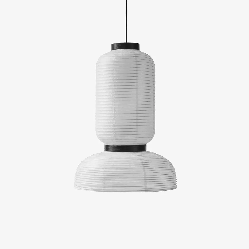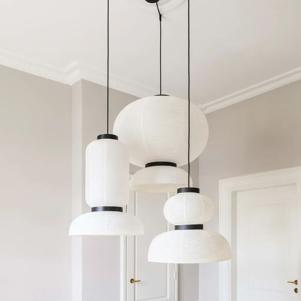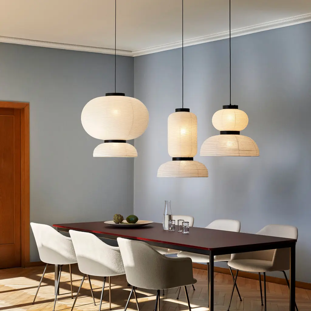 Discover the Formakami Pendant JH3, a mesmerizing part of the Formakami collection designed by Jaime Hayon for &tradition. This ethereal lamp, crafted from hand-made rice paper, delivers a diffused, warm glow that instantly elevates any space. Suspended from the ceiling, the lamp adds a touch of elegance and tranquility, effortlessly merging functionality with aesthetics. The JH3 Pendant doesn’t merely light up a room; it transforms the atmosphere with its soft, welcoming radiance. The shade is elegantly framed by black lacquered oak veneer brackets, adding an understated touch of contrast to the luminous white. Equipped with two E26 sockets and a maximum capacity of 60 watts each, this pendant ensures optimum illumination while providing an ambiance of intimate warmth. While bulbs are not included, the JH3 offers the flexibility to incorporate your choice of lighting to suit your personal aesthetic.