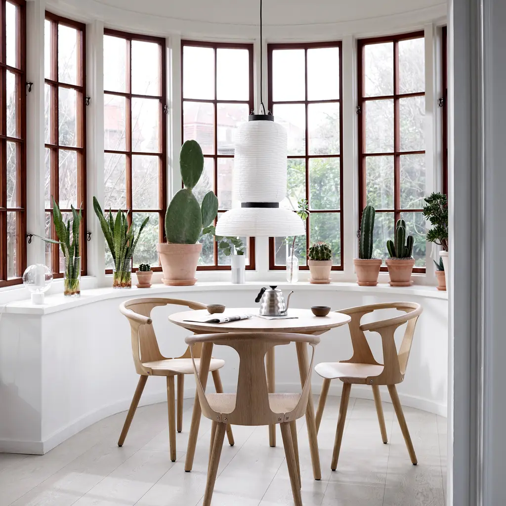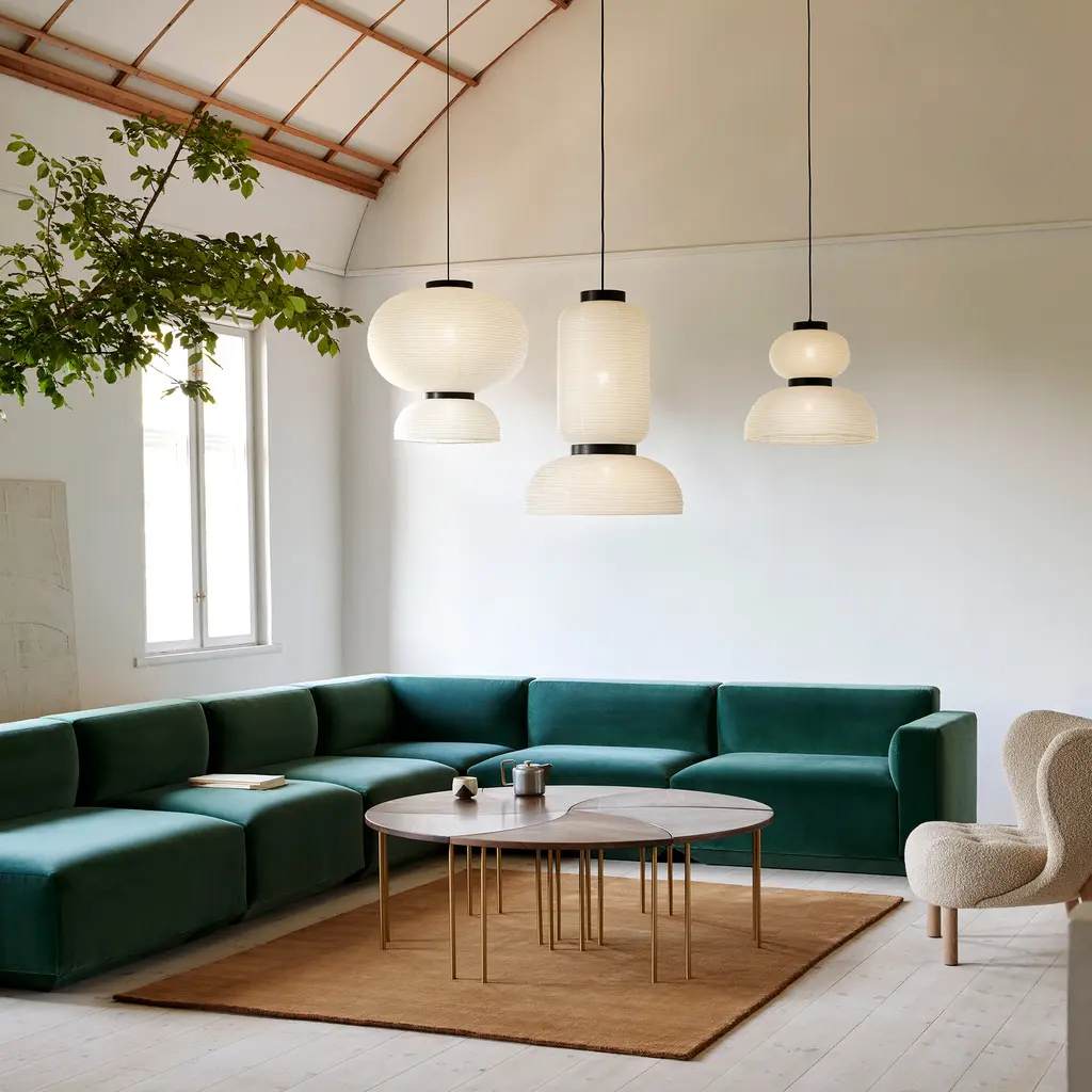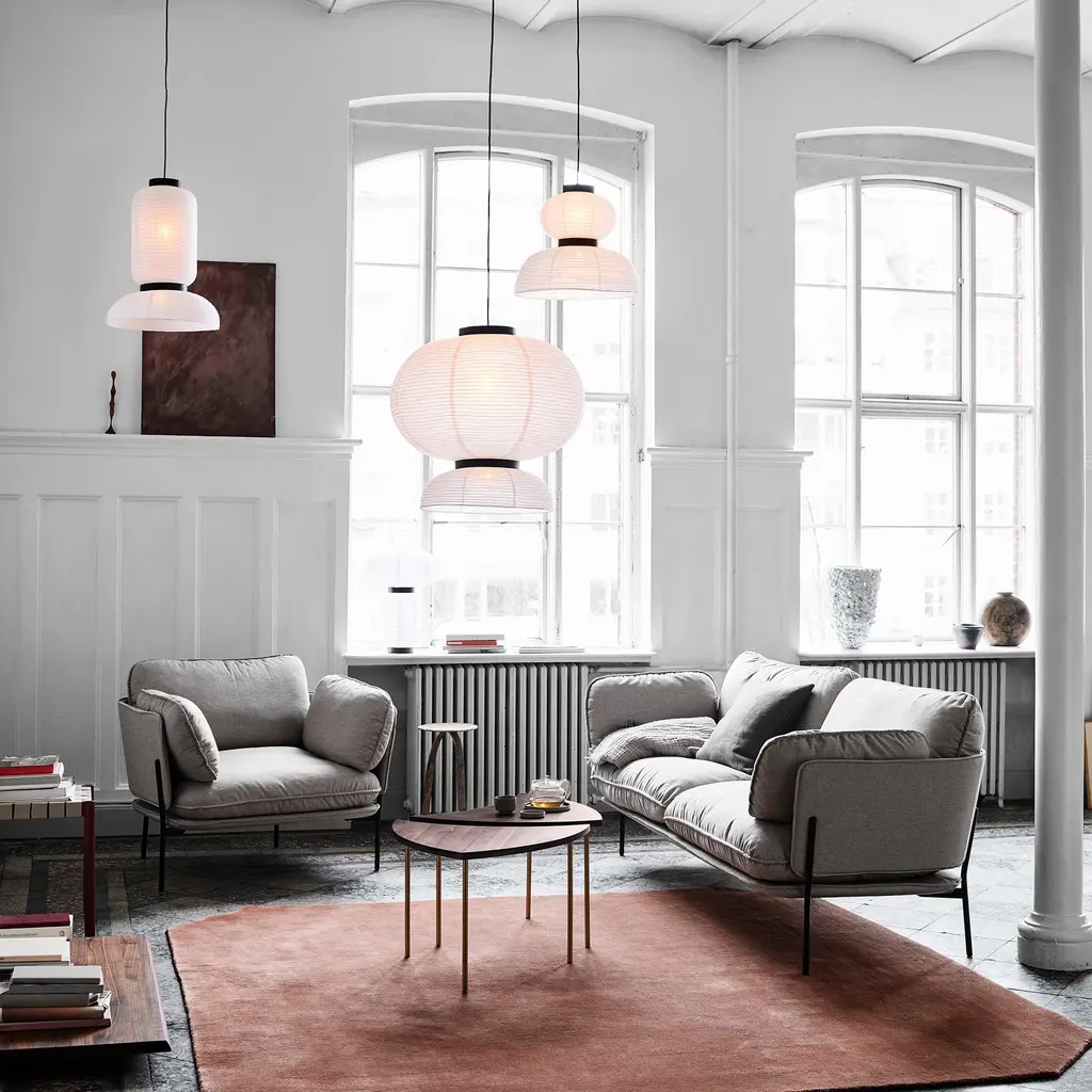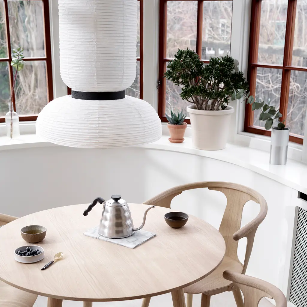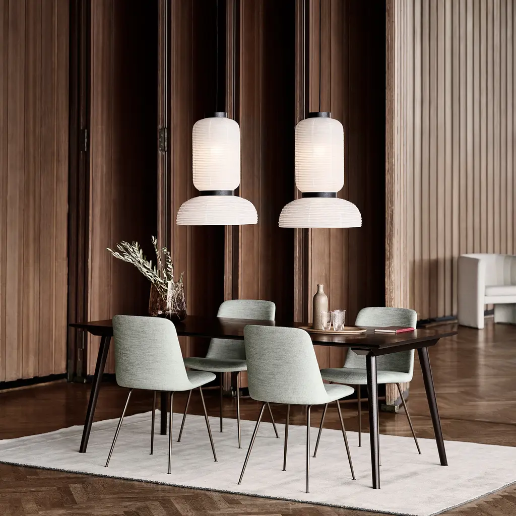 Discover the Formakami Pendant JH3, a mesmerizing part of the Formakami collection designed by Jaime Hayon for &tradition. This ethereal lamp, crafted from hand-made rice paper, delivers a diffused, warm glow that instantly elevates any space. Suspended from the ceiling, the lamp adds a touch of elegance and tranquility, effortlessly merging functionality with aesthetics. The JH3 Pendant doesn’t merely light up a room; it transforms the atmosphere with its soft, welcoming radiance. The shade is elegantly framed by black lacquered oak veneer brackets, adding an understated touch of contrast to the luminous white. Equipped with two E26 sockets and a maximum capacity of 60 watts each, this pendant ensures optimum illumination while providing an ambiance of intimate warmth. While bulbs are not included, the JH3 offers the flexibility to incorporate your choice of lighting to suit your personal aesthetic.