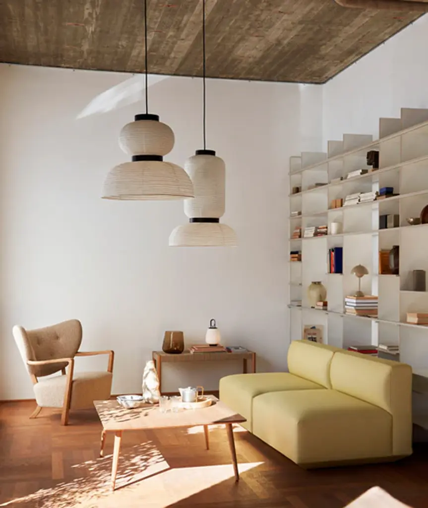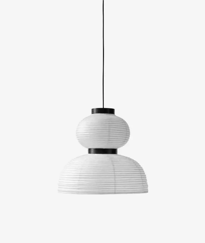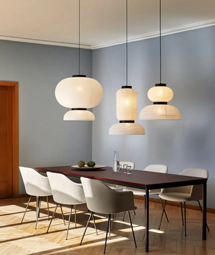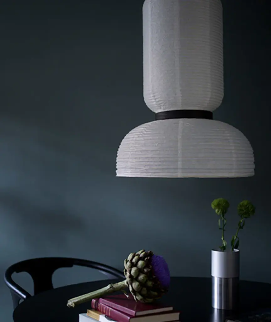 East meets West in Jaime Hayon’s playful tweak of a traditional Asian lantern in contemporary expression. Dating back centuries, paper lanterns have featured in Asia amongst the privileged and the poor, where different colors, shapes, and sizes connote different meanings. Here Hayon has dispensed with cultural formalities to create a series of lamps all in white. Hand crafted with rice paper merging various sizes and shapes together. The series is comprised of three different lantern versions and a table lamp in ivory white rice paper with black stained oak accents.