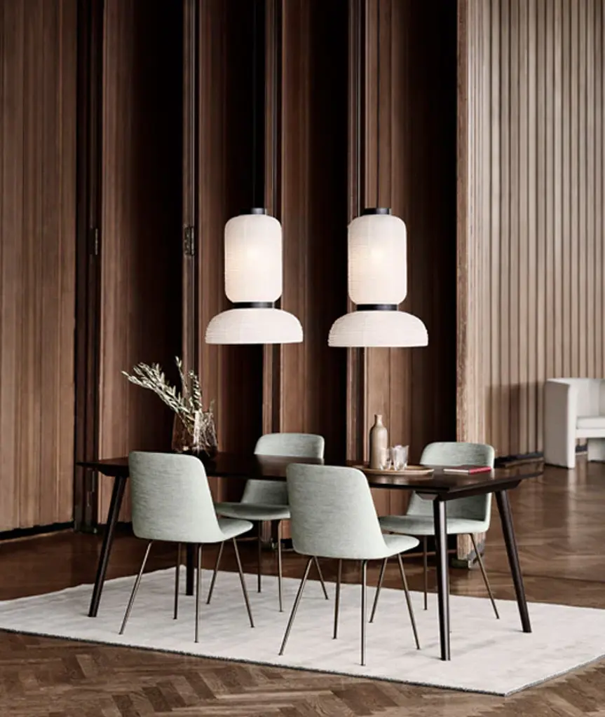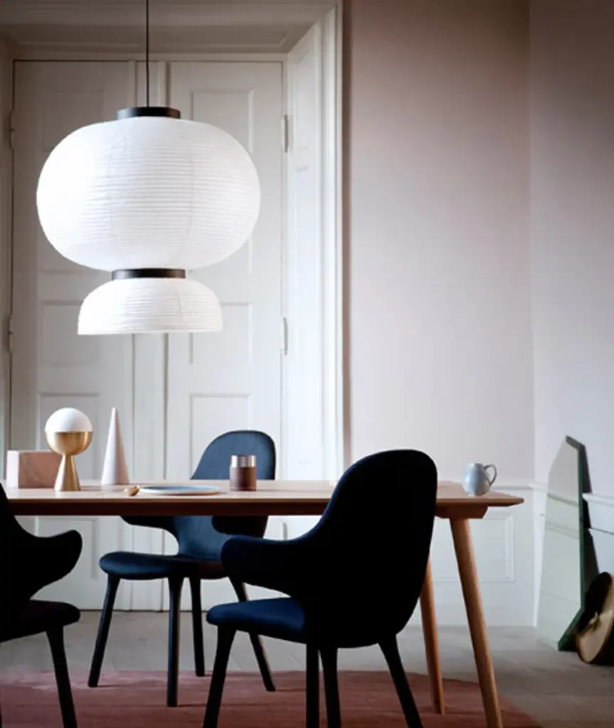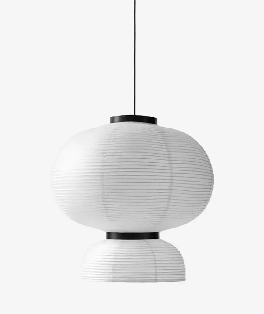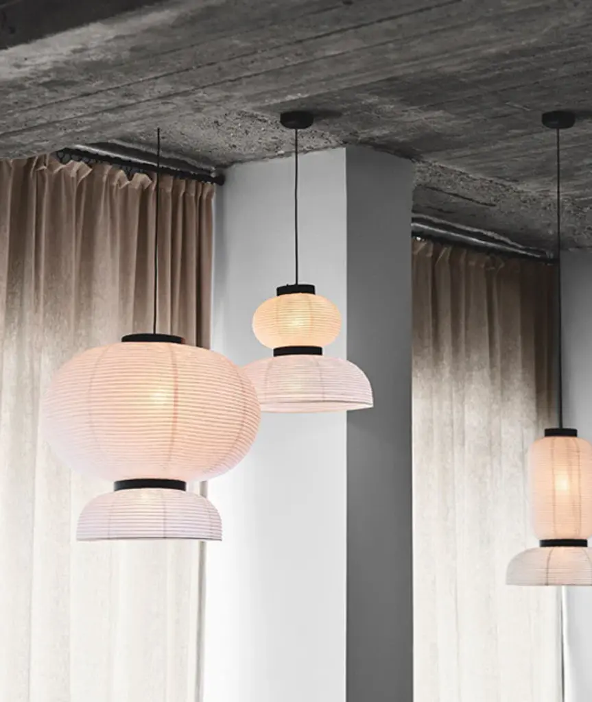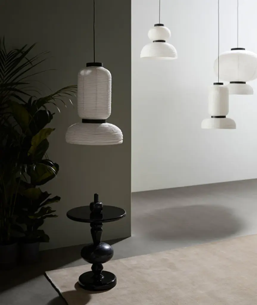 East meets West in Jaime Hayon’s playful tweak of a traditional Asian lantern in contemporary expression. Dating back centuries, paper lanterns have featured in Asia amongst the privileged and the poor, where different colors, shapes, and sizes connote different meanings. Here Hayon has dispensed with cultural formalities to create a series of lamps all in white. Hand crafted with rice paper merging various sizes and shapes together. The series is comprised of three different lantern versions and a table lamp in ivory white rice paper with black stained oak accents.