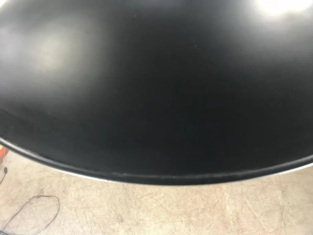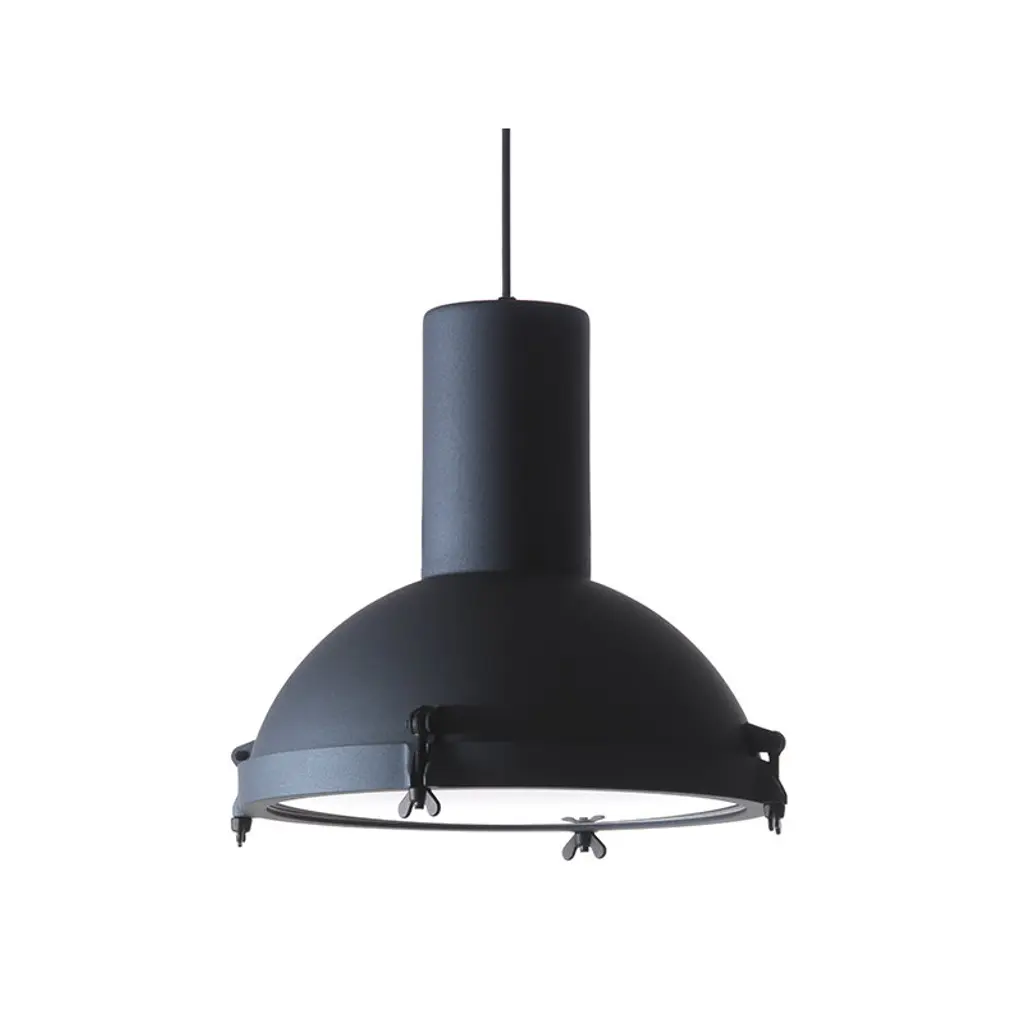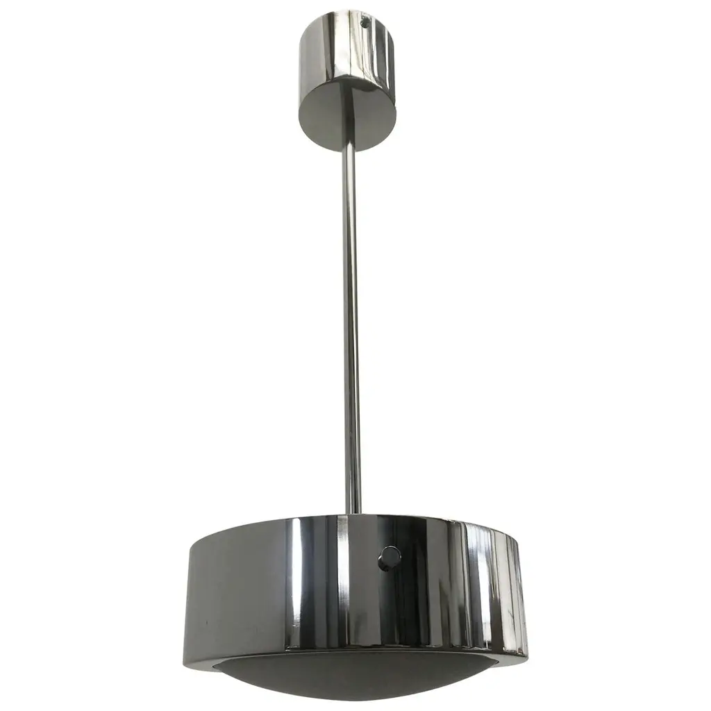 Matched set of four aluminum hanging pendant chandeliers by Lightcraft. Classic modernist, simple yet elegant design, featuring four up lights which reflect onto large aluminum dish, 30" aluminum dome painted matte white interior and matte black matte exterior.