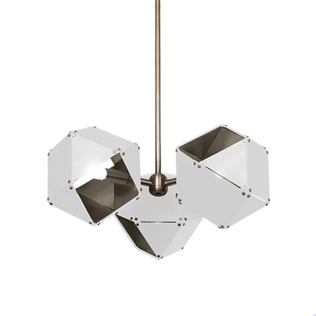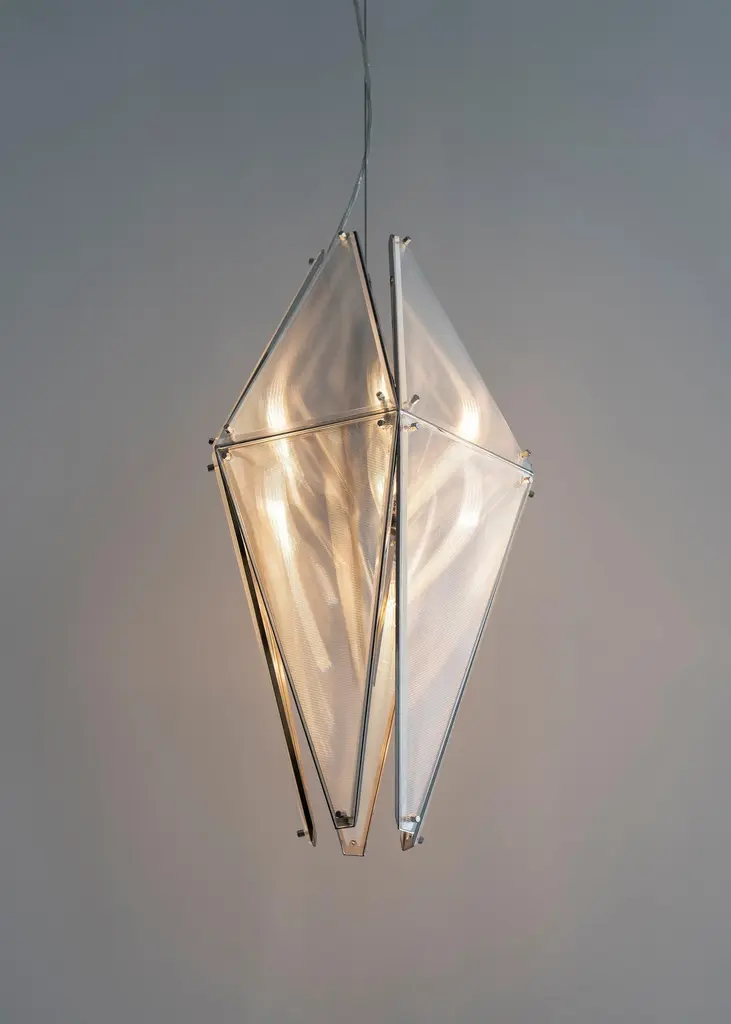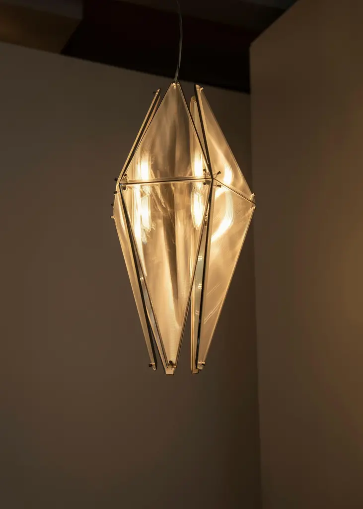 Fragment 08 pendant light by Sing Chan Dimensions: D 35.5 x H 70.5 cmMaterials: Stainless steel, glass.All our lamps can be wired according to each country. If sold to the USA it will be wired for the USA for instance.The past and the future are never disconnected. In this multifarious world, things are full of connections. Maybe we have to be reckless, maybe we can turn a blind eye, maybe we can be voracious, and maybe we can be casual, the time is.It has been two years since the last lamp creation, and this presentation will continue the past, complementing the Fragment series and expressing some ideas that have not been realized. The new collection was inspired by I.M. Pei's Louvre Pyramid, which was heavily criticized by Parisian society for being too avant-garde and out of place in the Classic Louvre. It seems to be the same as Fragment series, seeking a balance point between the avant-garde and the classical. The glass is attached to the metal to wrap the light, and the light travels through the tight structure, sometimes hitting the wall, sometimes being free, extending infinitely in the limited space.Although inspired by the Louvre Pyramid, but different in light efficiency. In the initial test, only the four sides of the glass were tested without fixed light effect. Staggered light was born to form a unique cross light effect, and further derived a new way of refraction. Physics is such simple, unpredictable and beautiful.Sing Chan ( Chinese: ???/Xingyu Chen) , the founder of SINGCHAN DESIGN, was born in 1990, and graduated from the Department of Industrial Design in Guangzhou University in 2013. He served as the Design Director for Bentu Design in 2016.Founded his own design studio in 2020, Sing specializes in discovering new revelations from different civilizations and eras, reconstructing them through design methods, and shaping new objects that link the past and the present.Panyu, Guangzhou, China, where Sing grew up, is a small town with a rich history along the Pearl River. In the early years, thanks to the developed waterway transportation, the port of the town has a very close relationship with Hong Kong, the imported cultures, utensils, and values meet and fuse here.It was not until he had been in the design industry for more than ten years that he realized that his understanding of native culture was shallow. He is confused about this, and experience tells him that the truly valuable objects are not groundless and pieced together, but based on historical inspection and adaptation of the times. Sing hopes that his design can be like a story that is worth telling in a lyric way, affecting the present across time..