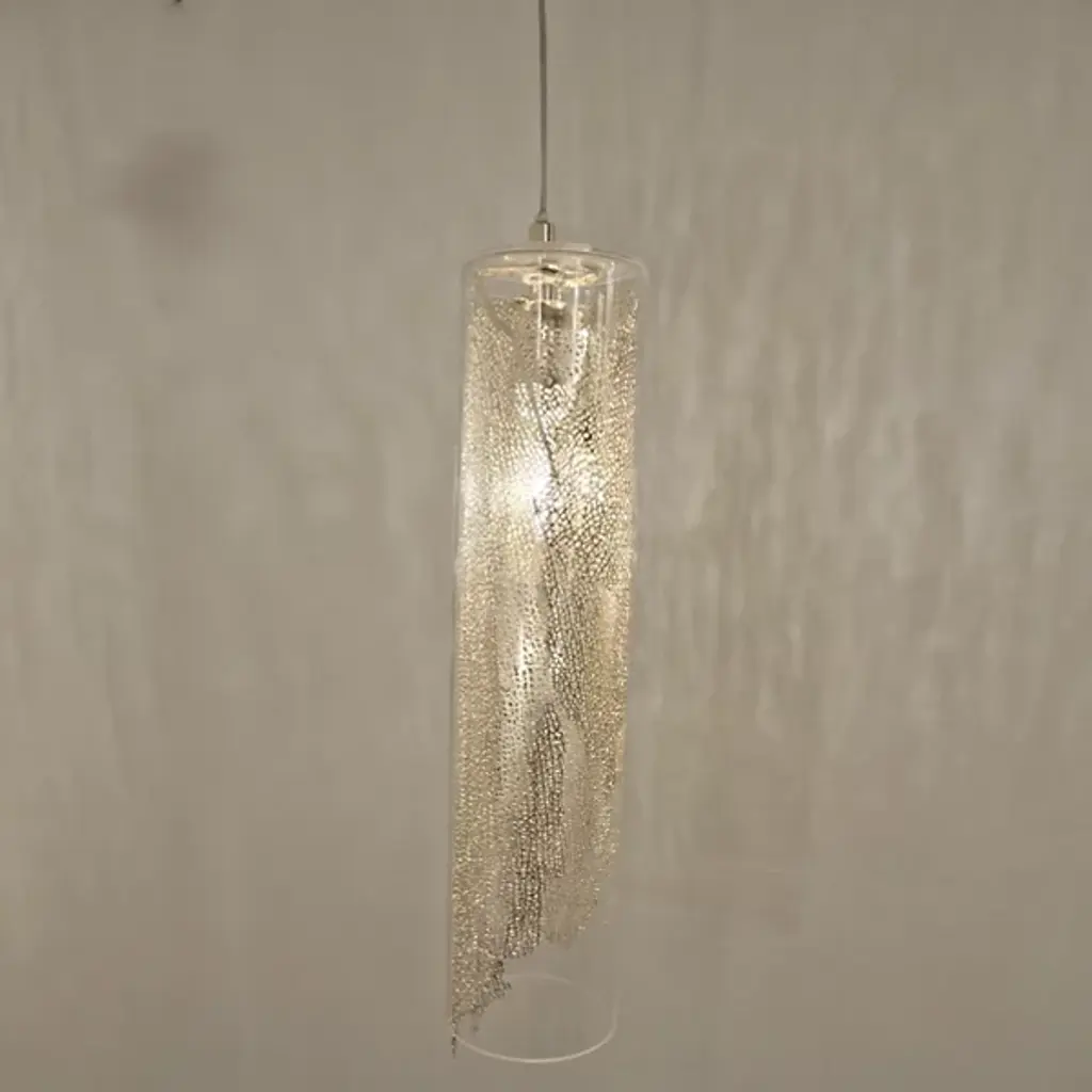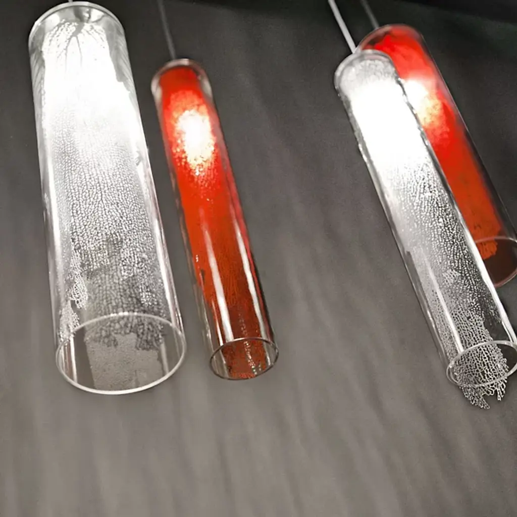 The Terzani Frame Cylindrical Mini Pendant cases and nurtures a coral motif within a glass display, emitting a lively interplay of organic and controlled light. Capturing the intricacies of coral, the etched metal is left in an uneven shape, as if continuing to grow and escape from the slender glass. Once illuminated, light permeates through the interior pattern, providing an enigmatic ambience as well as a concentrated light below.