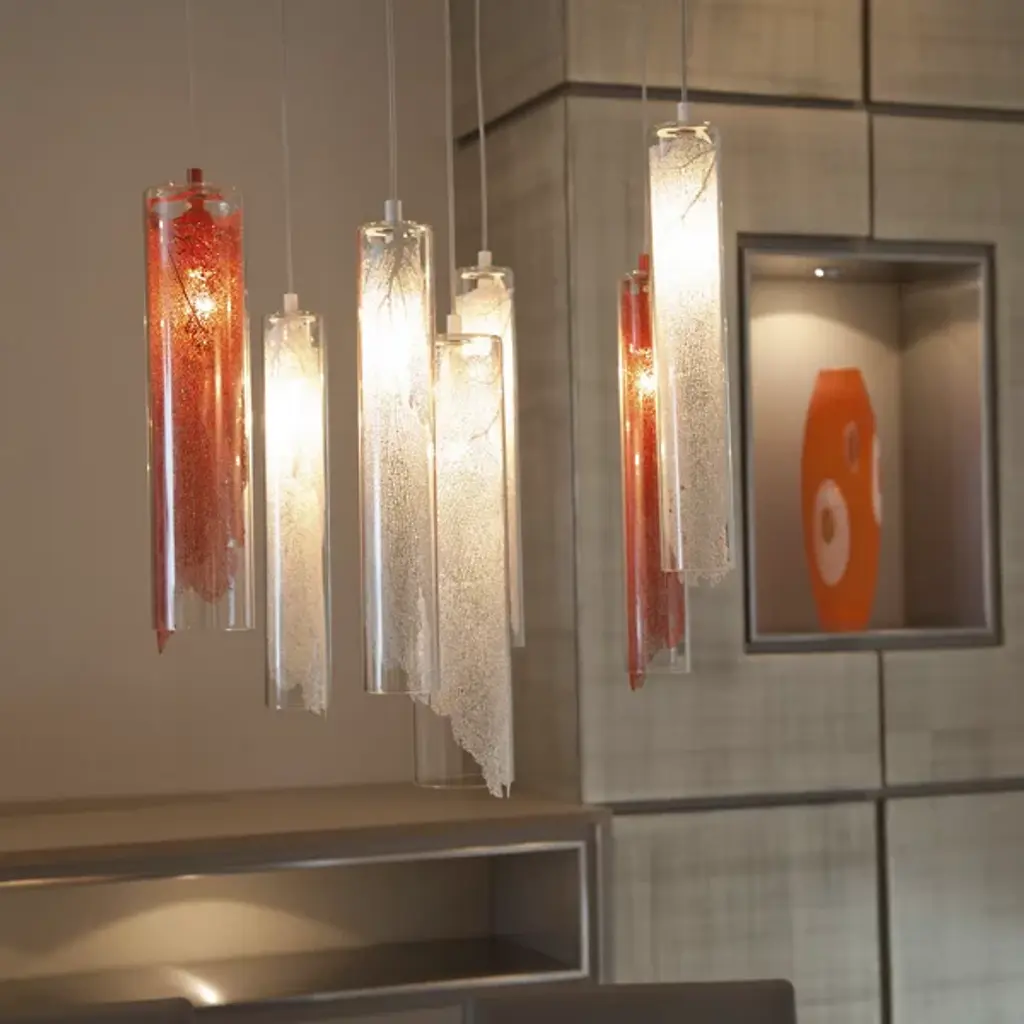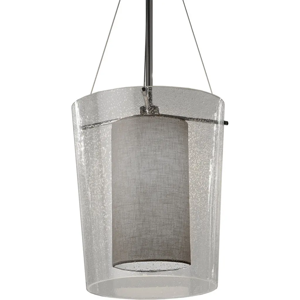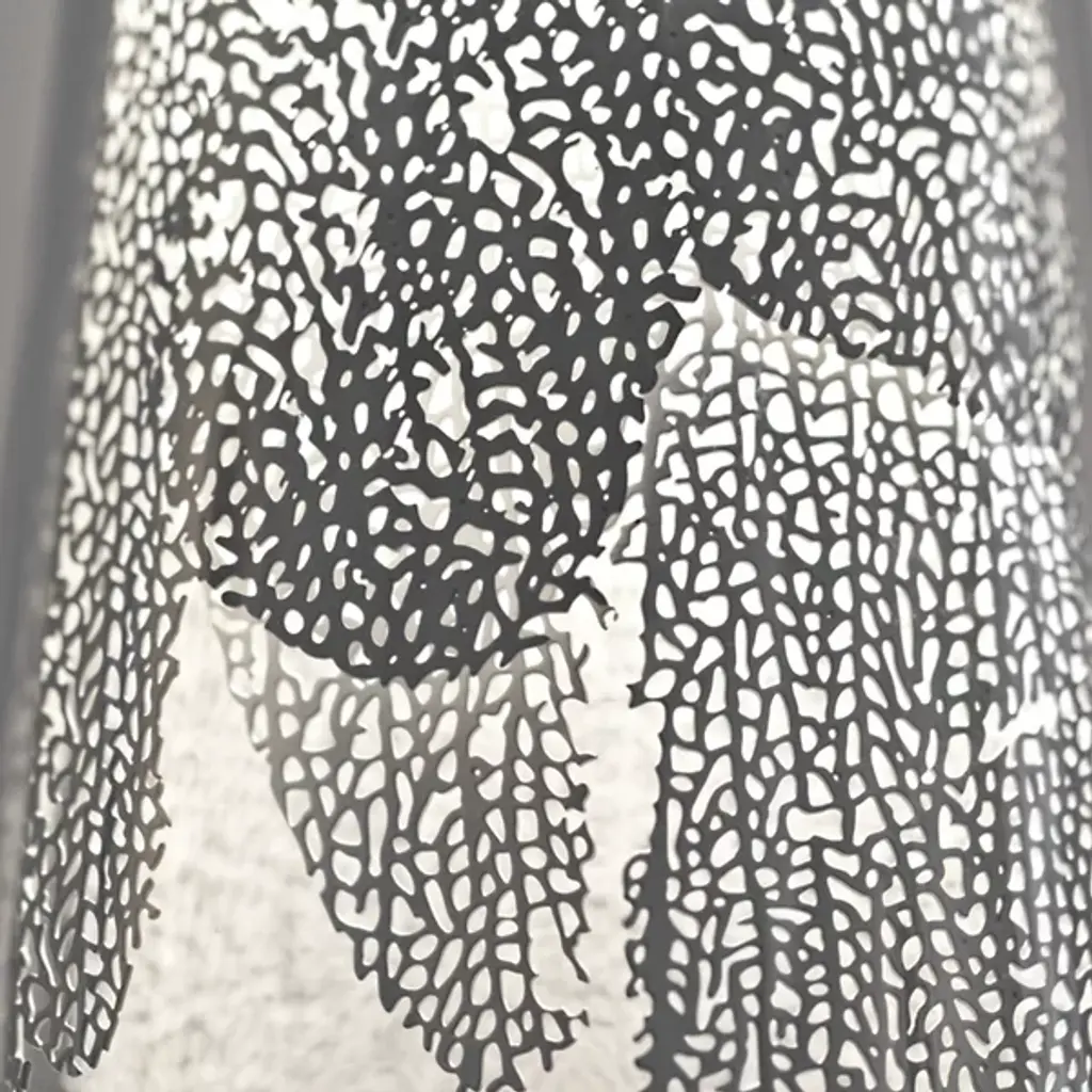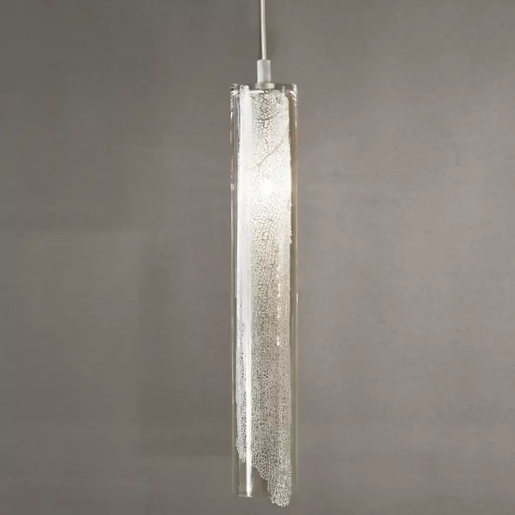 The Terzani Frame Cylindrical Mini Pendant cases and nurtures a coral motif within a glass display, emitting a lively interplay of organic and controlled light. Capturing the intricacies of coral, the etched metal is left in an uneven shape, as if continuing to grow and escape from the slender glass. Once illuminated, light permeates through the interior pattern, providing an enigmatic ambience as well as a concentrated light below.