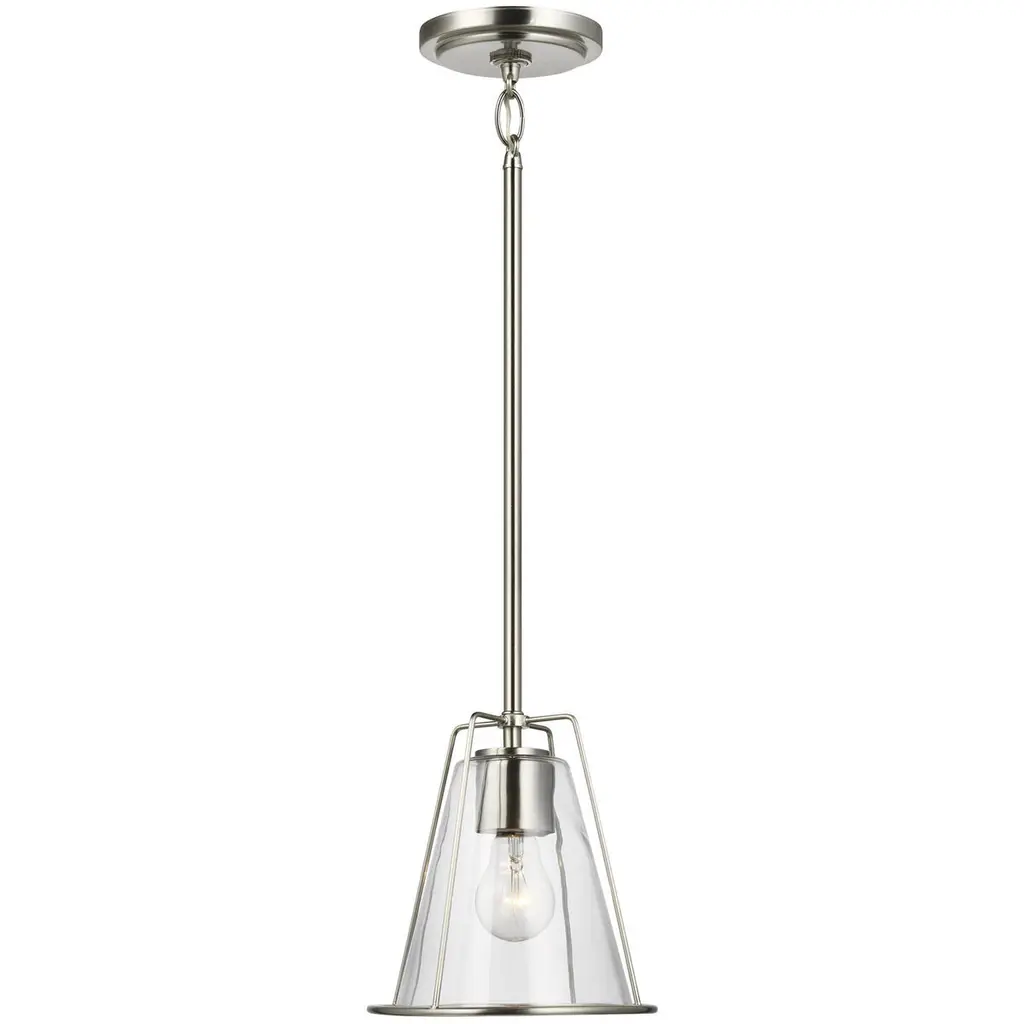 The Framework one light indoor pendant is offered in Brushed Nickel, Matte White and Midnight Black. Crafted of metal with a flared silhouette and clear glass shade. Can be used in multiples above a kitchen island or long dining table for added impact. Both incandescent lamping and ENERGY STAR-qualified LED lamping are available; all fixtures are California Title 24 compliant.