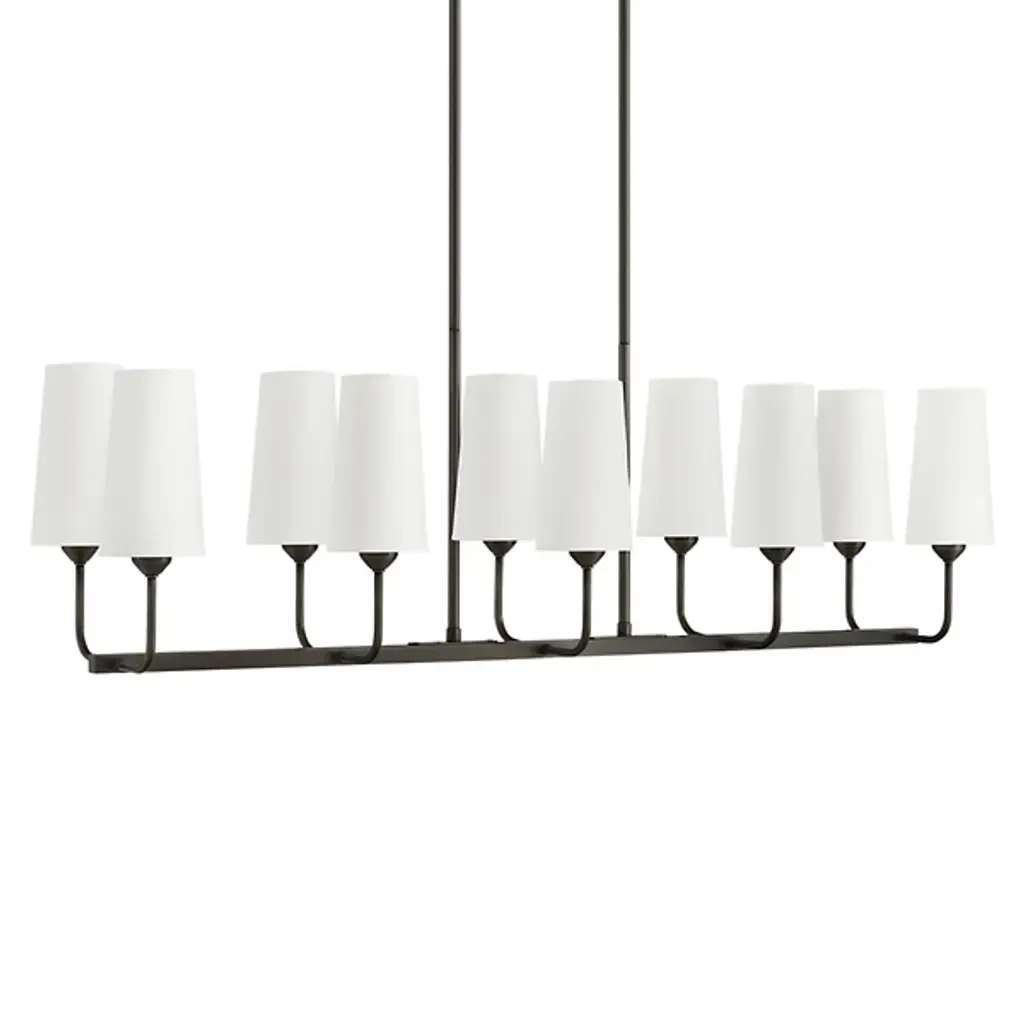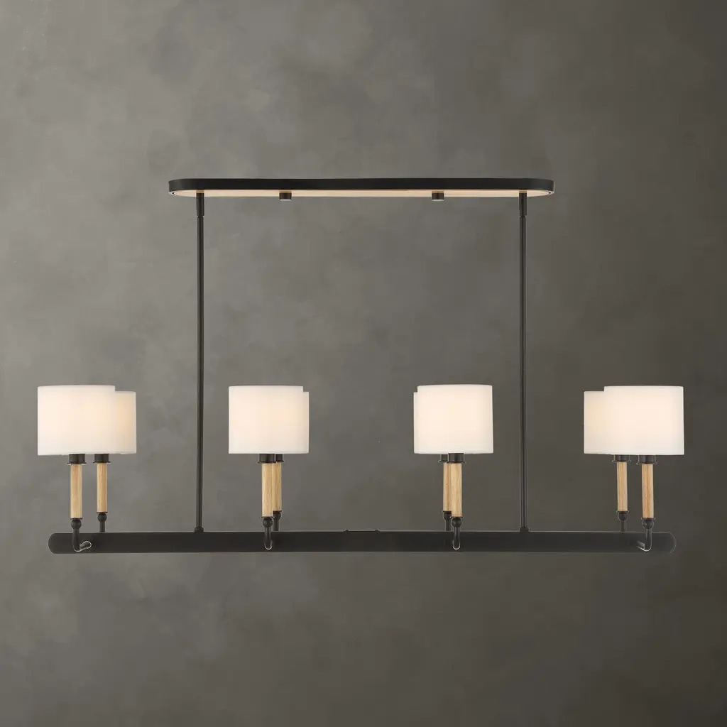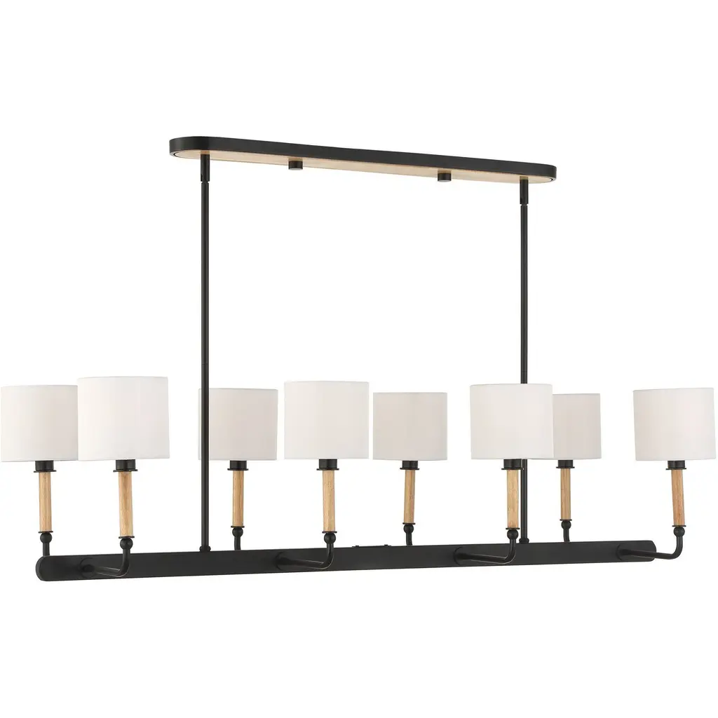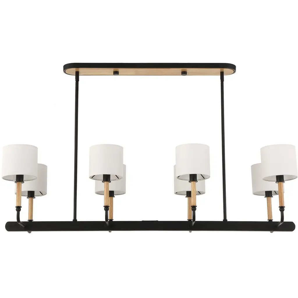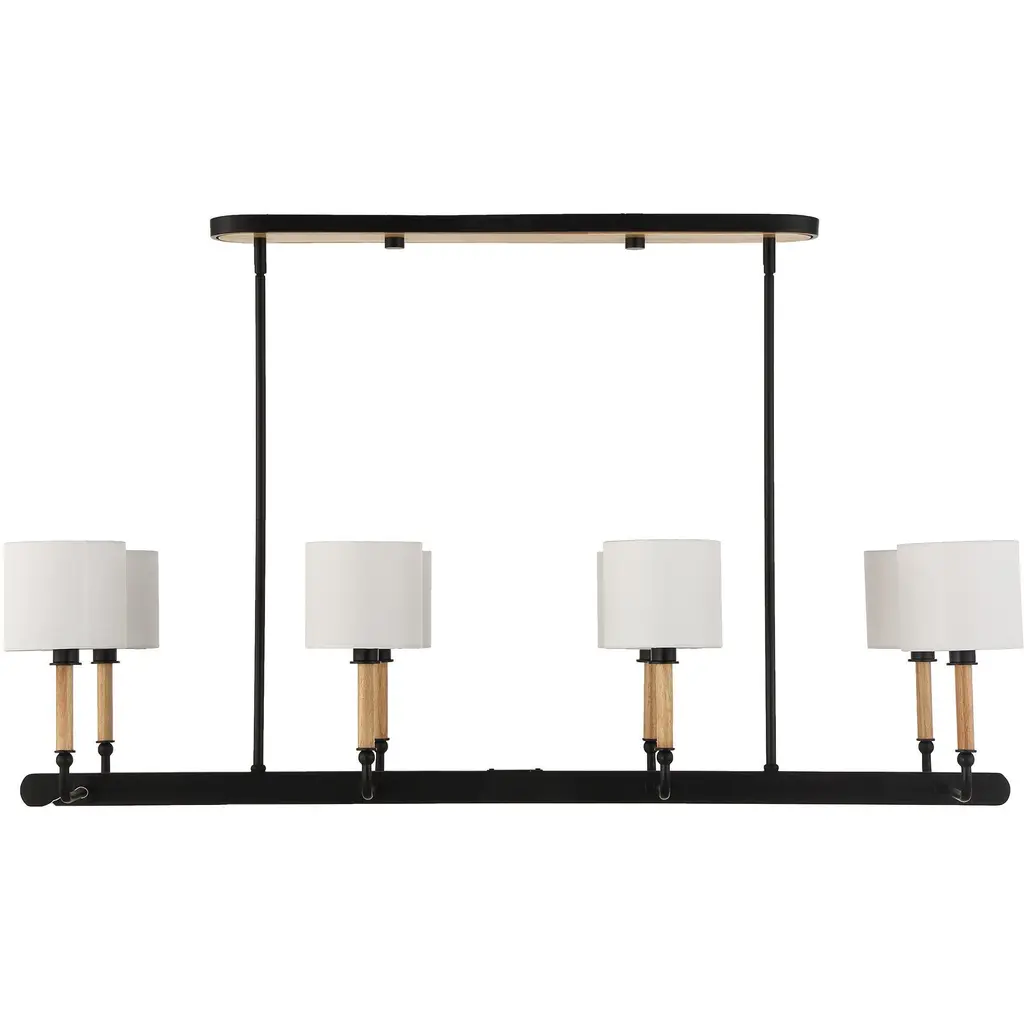This Casual 8 Light Linear Pendant Blends Into Any Style With Classic Lines, Earthy Blond Wood Accents And A Matte Black Finish. All Topped With A White Linen Fabric Shades. 8-25 Watt Max Candelabra Sockets. Bulbs Not Included. Supplied With 15' Wire, 6-12" Stems And 2-6" Stem For Adjustable Installation.