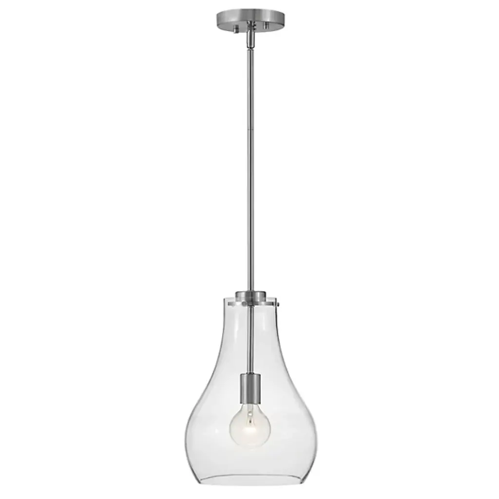 Enhance inside ceilings with the effervescent elegance of the Frankie Pendant from Lark. This tasteful transitional design sweeps down from a sleek circular ceiling rose, ending in a single downward-facing socket set inside a flaring, curving shade of clear glass. An excellent choice for high-ceilinged spaces, the fixture calls to mind a tall, ornate wineglass, casting a focused downlight below, accompanied by a warmer ambiance that passes through the sleek, clear shade.