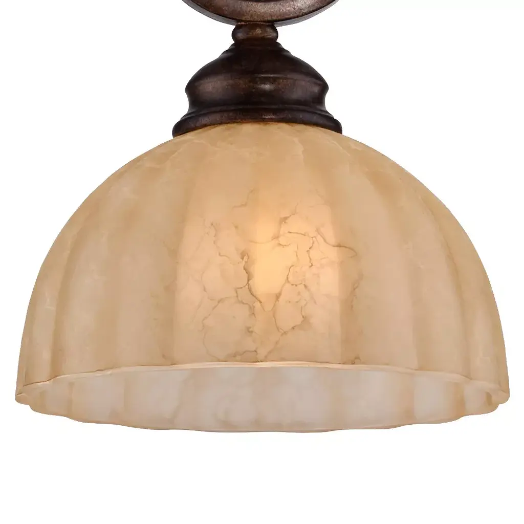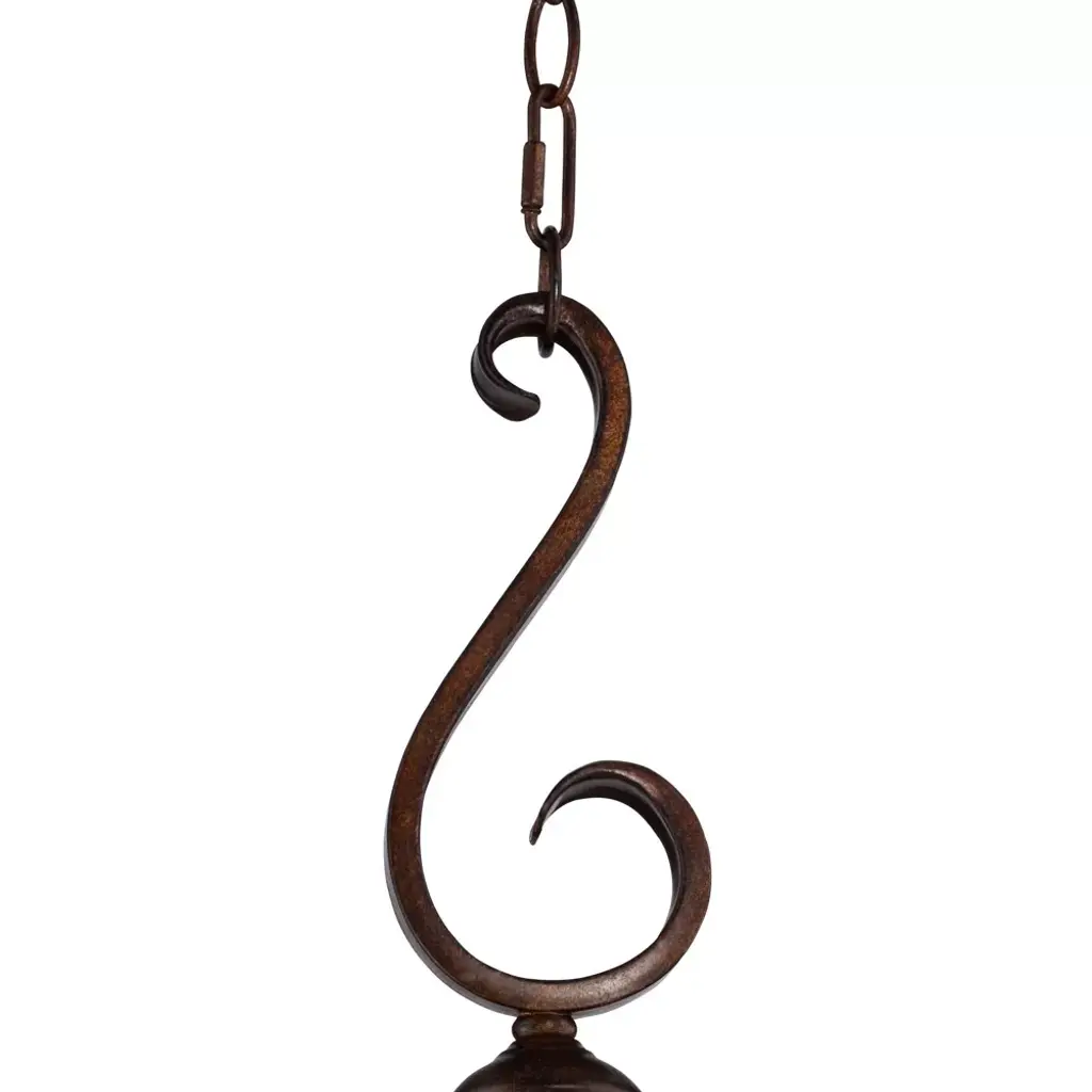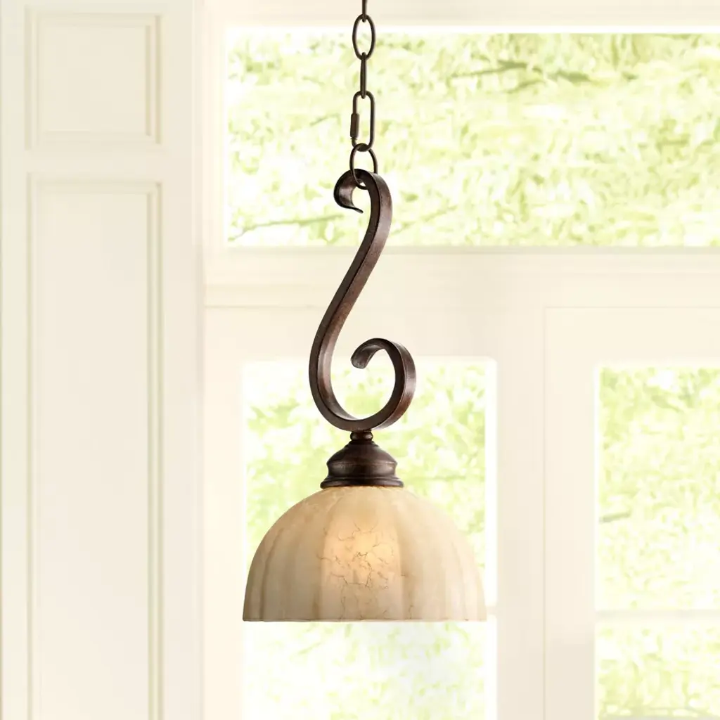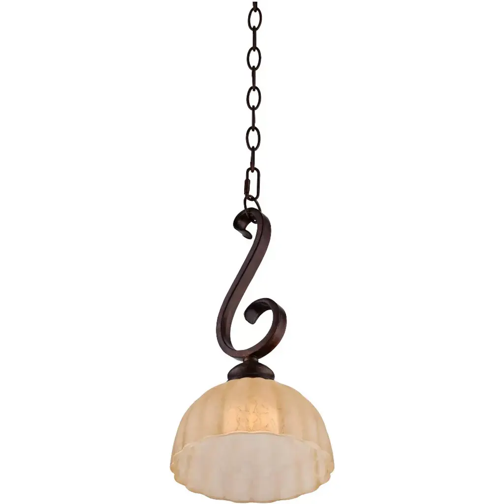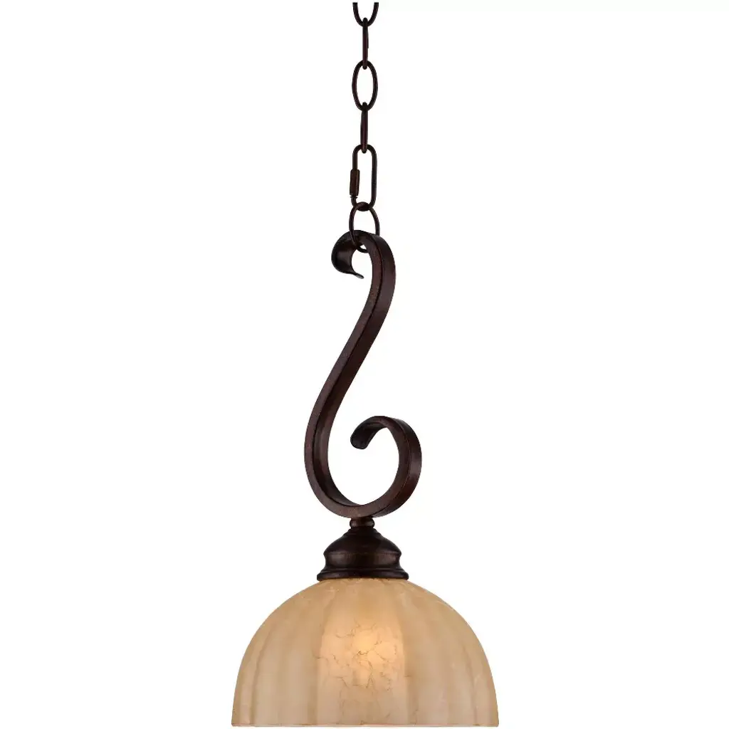A simple iron scroll hangs from a chain in this delightful mini pendant light. A scalloped amber glass shade creates a warm glow that will bath your room in elegance. Included length of chain and ceiling canopy in iron finish complete this divine home accent.