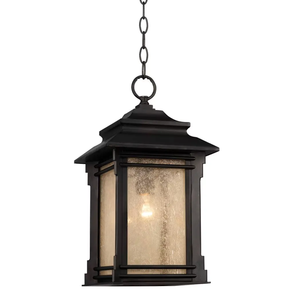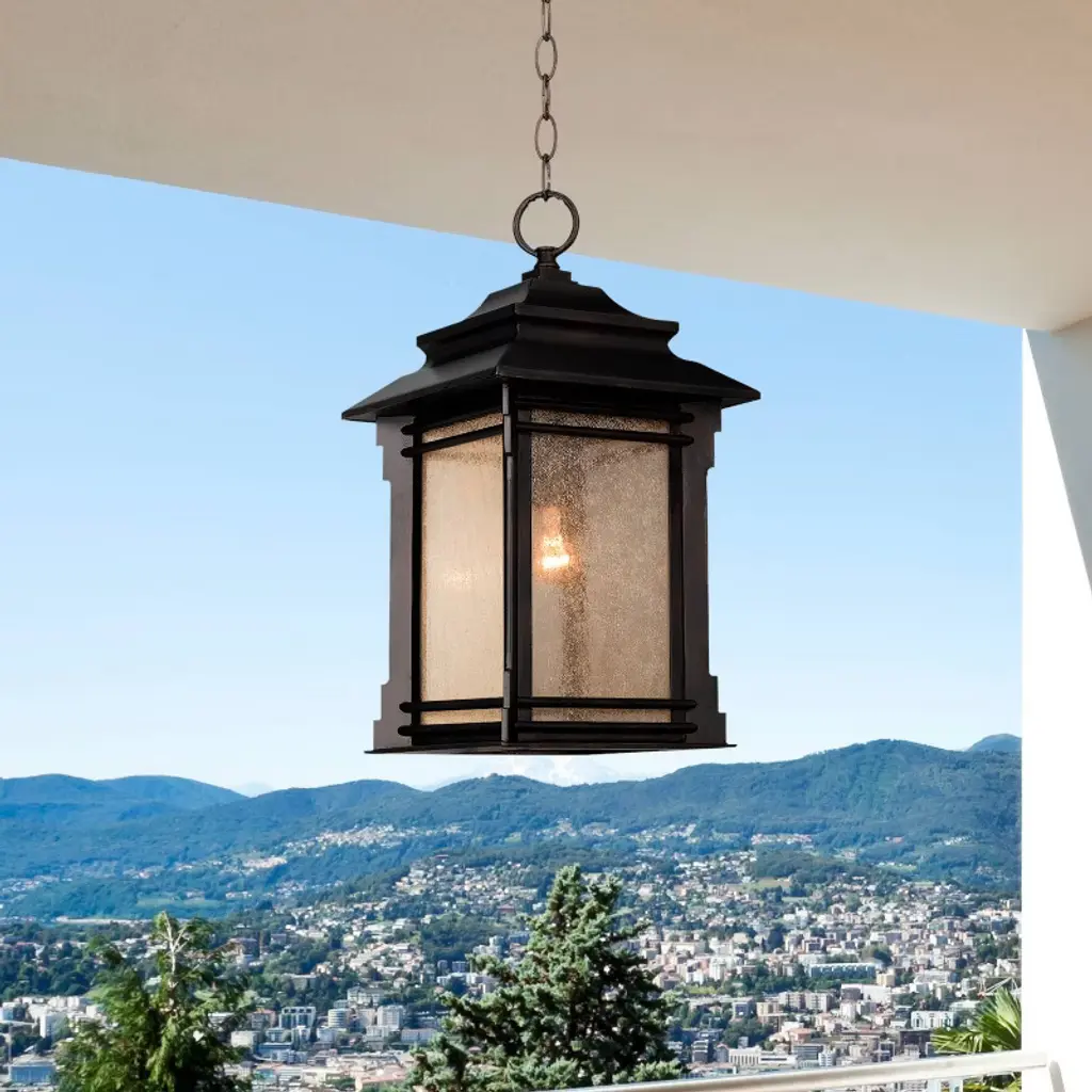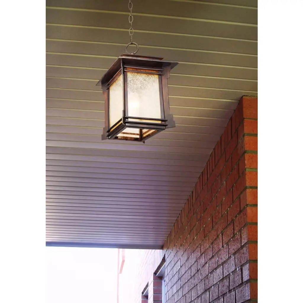 Inspired by traditional Mission Arts and Crafts styles, this outdoor hanging light is a beautiful addition to a foyer or entryway area. This classic design consists of a straight-lined frame, with a tiered top for a lovely architectural look. A walnut bronze finish adds a handsome touch, while textured frosted cream glass panels provide a warm and welcoming glow.