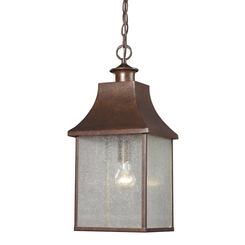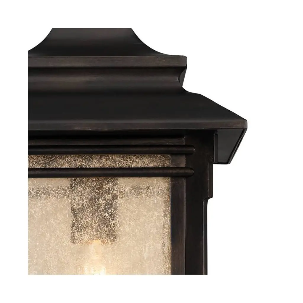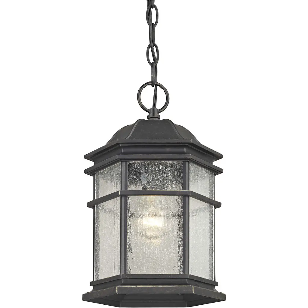 Inspired by traditional Mission Arts and Crafts styles, this outdoor hanging light is a beautiful addition to a foyer or entryway area. This classic design consists of a straight-lined frame, with a tiered top for a lovely architectural look. A walnut bronze finish adds a handsome touch, while textured frosted cream glass panels provide a warm and welcoming glow.