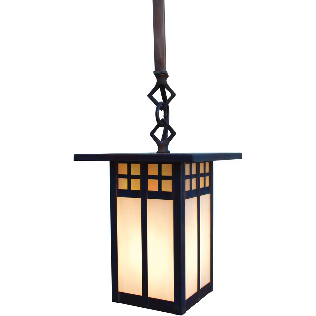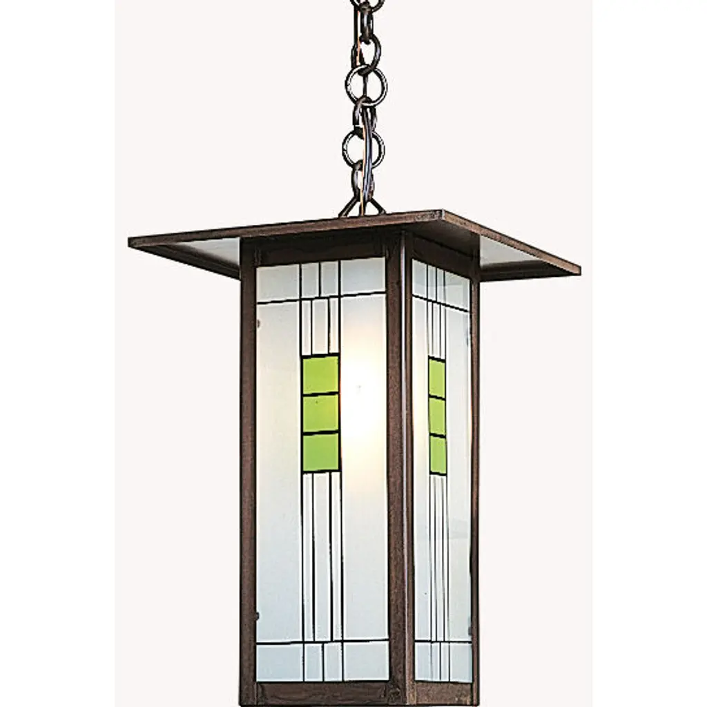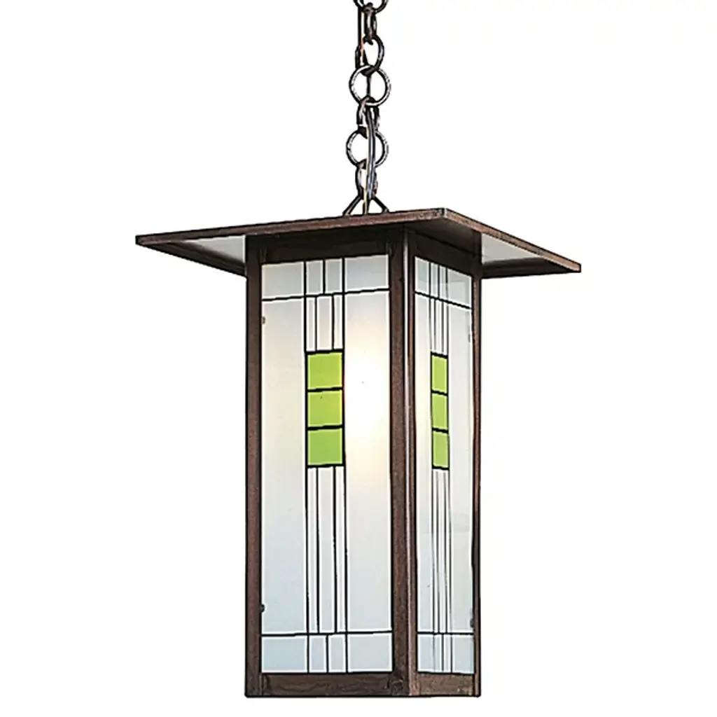 A striking look whether turned on or off, the Arroyo Craftsman Franklin Outdoor Pendant features a handsome balance of geometry and color in its unique glass panels, secured together by bands of brass that will naturally patina over time. Part of the Franklin Outdoor Collection.