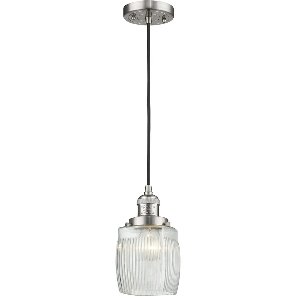 The Colton 1 Light Mini Pendant is part of the Franklin Restoration Collection. Includes 10 Feet Black Textured Cord