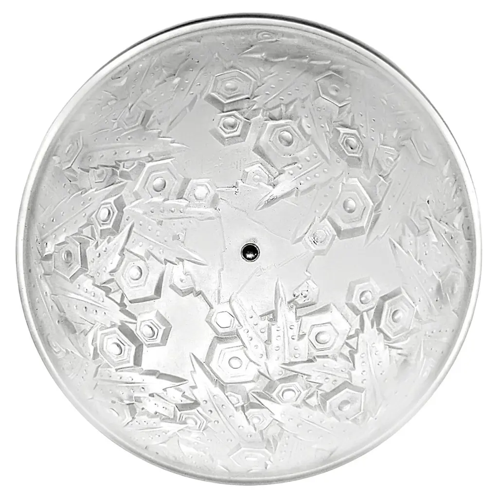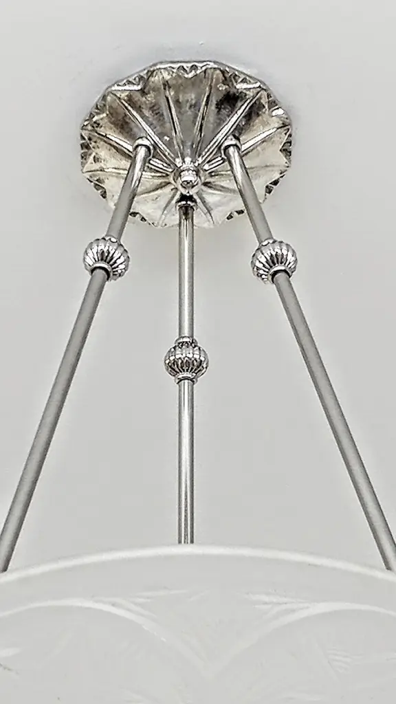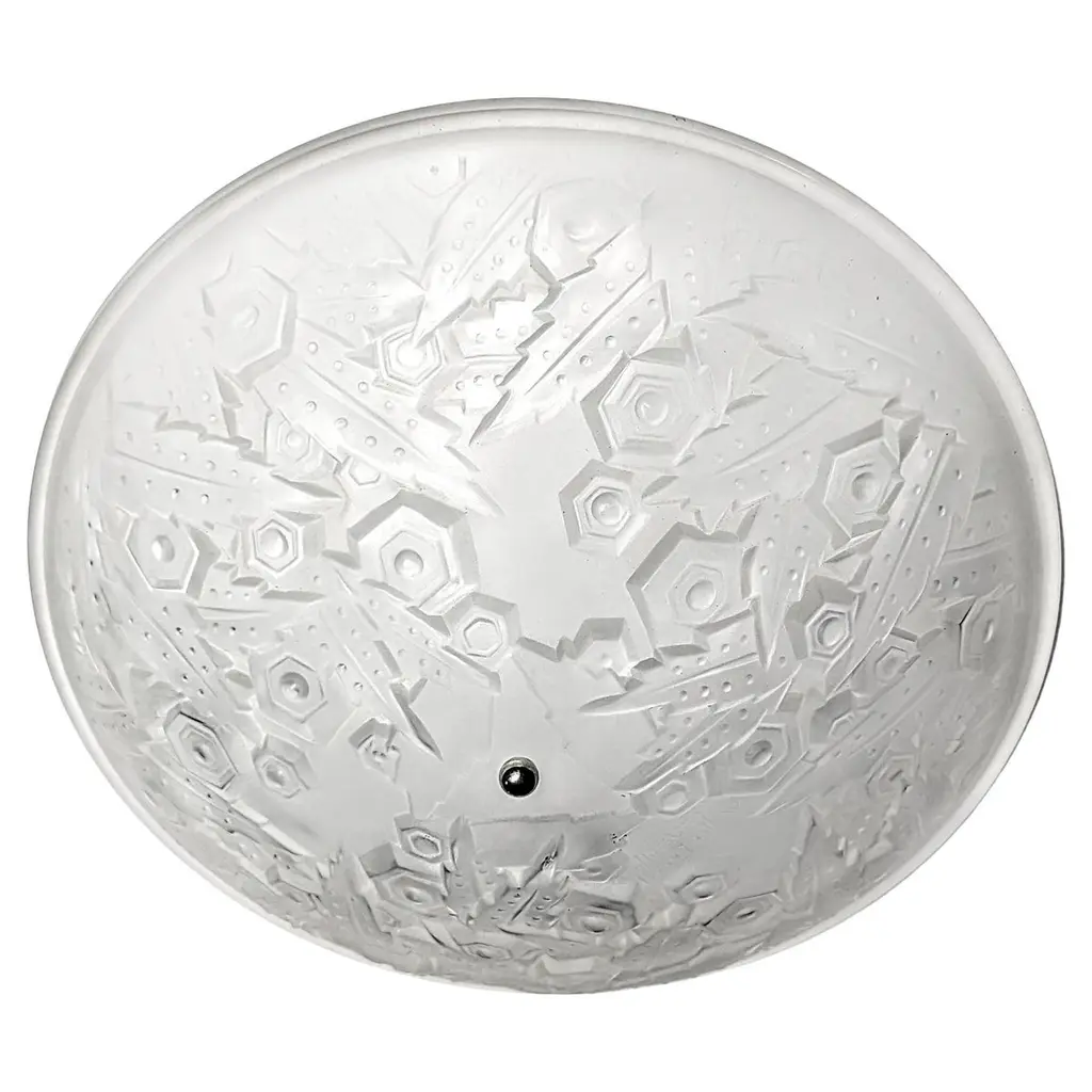 Holiday Sale...!A French Art Deco clear concave dome glass shade with intricate flower motif in frosted finish polish details with a center nickel ball as a flush mount in great condition. It can be turned into a pendant chandelier by adding three rods connecting to a decorative canopy (as shown in the last photo). The flush mount has been rewired for U.S. standards. Accommodates 2 candelabra bulbs (total of 160 watts max.) Custom drop and re-plating in different finishes upon request. Pair available. We are the rare source that has specialized exclusively in French Art Deco for over three decades, since 1991 with restoration, repair and plaiting for any lighting period located in Long Island City, N.Y. If you are searching for an item not currently listed, we have additional inventory in our collections that may fit your needs. Please feel free to ask any questions by pressing the " ASK THE SELLER " button so we may assist you in finding a wonderful piece that's just right for you.