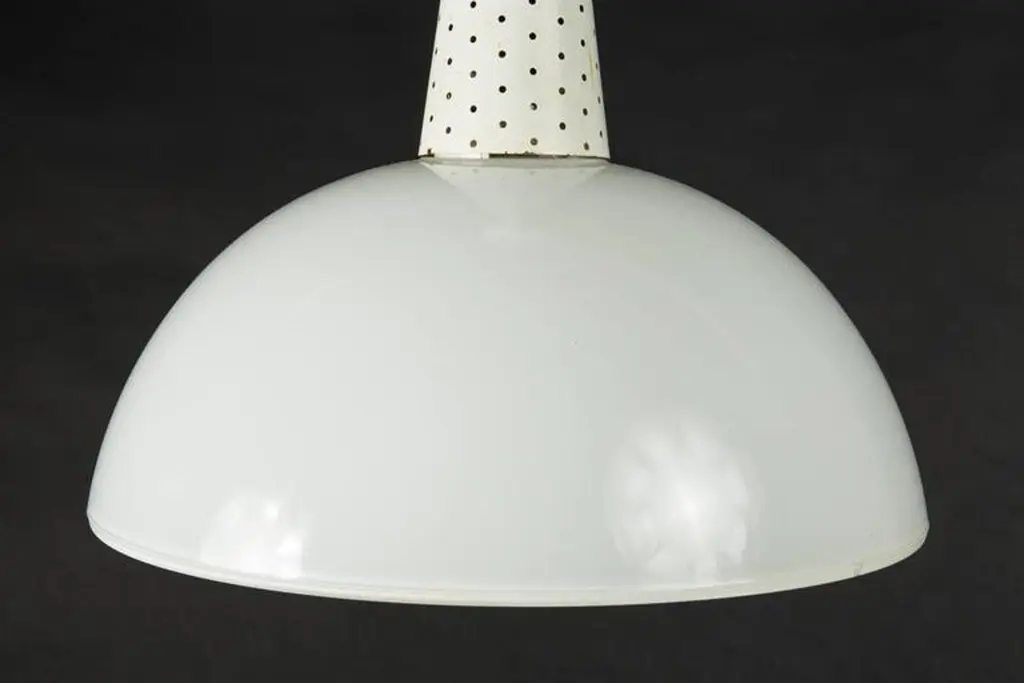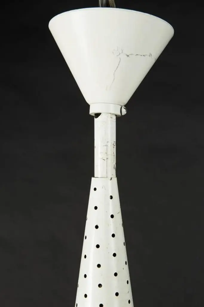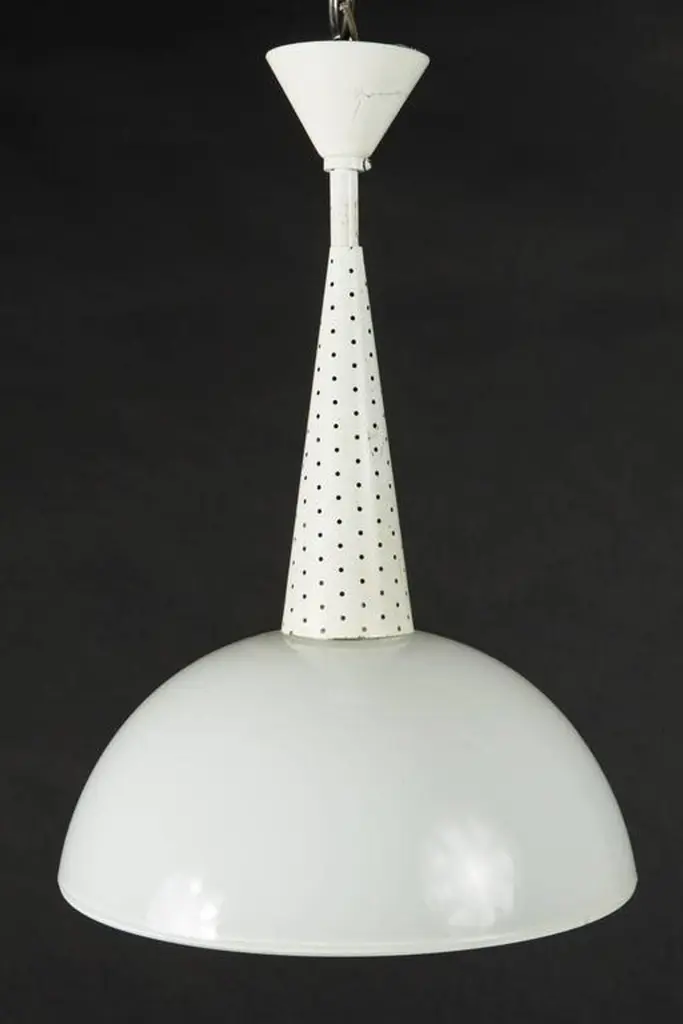 Mid-Century pendant attributed by French designer Mathieu Mategot designed in the late 1940 or early 1950sPerforated metal conical shaped down rod opaline glass shade.The total on request customised.Up to six pieces available.