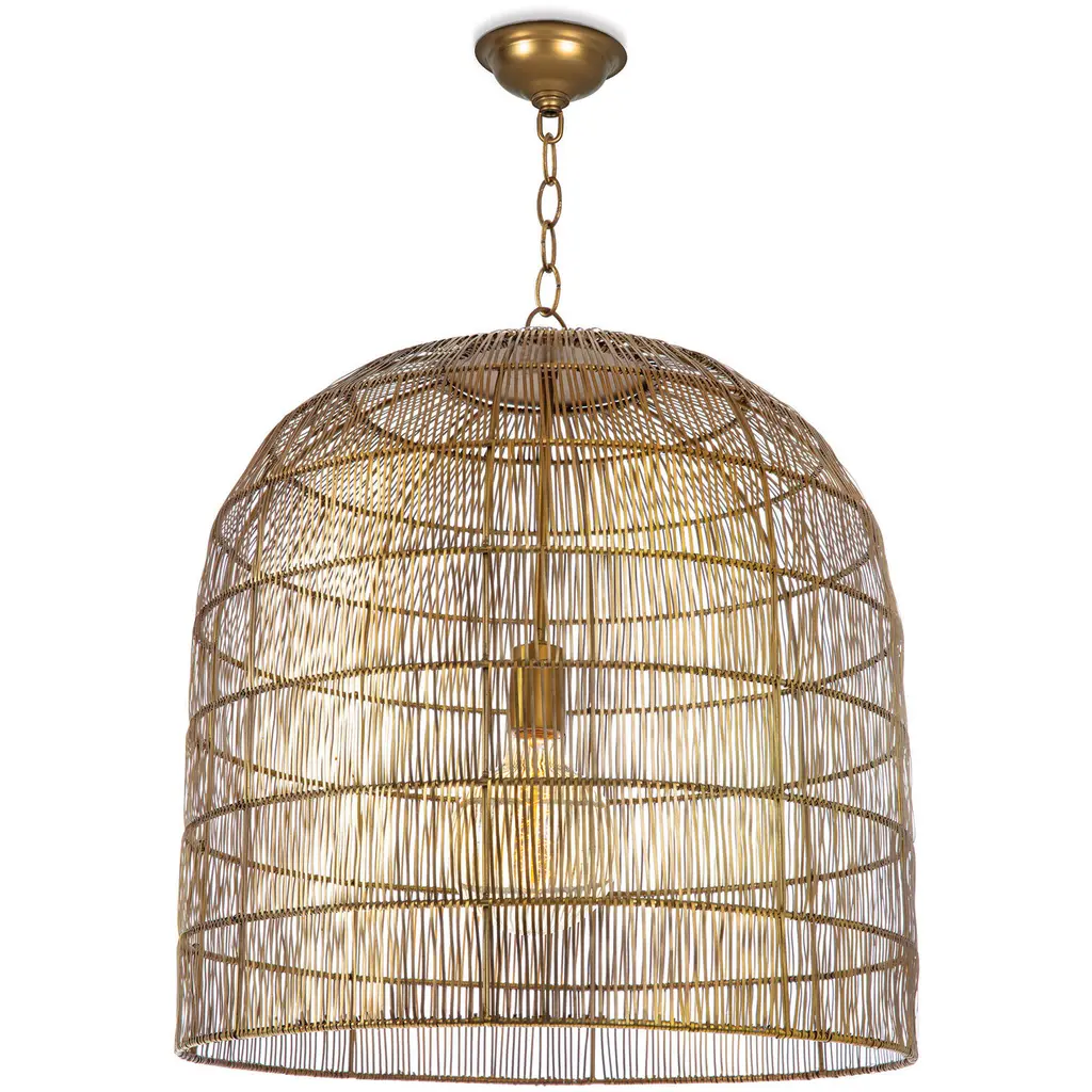 The Fresco Metal Pendant is fabricated of iron that has been expertly fashioned to give a light and airy appearance. The woven metal basket creates interesting light play when lit and functions as a lovely sculptural piece when not. Place this fixture over a dining table or kitchen island, or accent a corner of a living room or bedroom with the warm glow of this organic beauty.