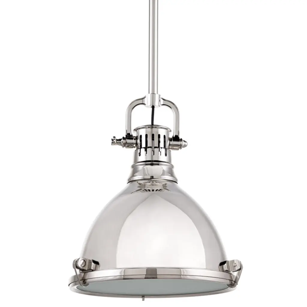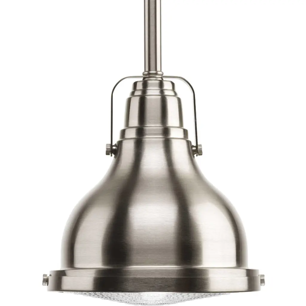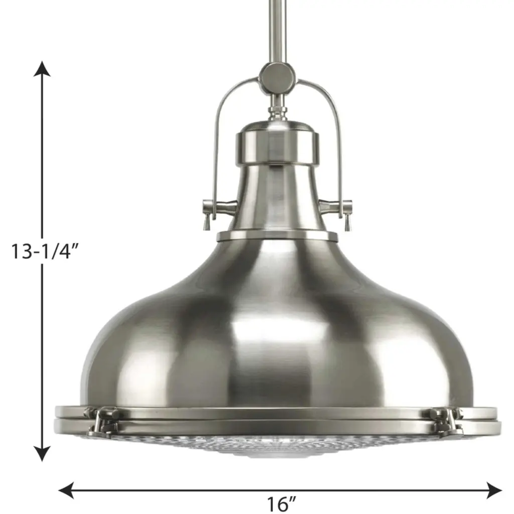 The one-light 16" pendant features industrial roots in both form and function. The Brushed Nickel finish highlight the high-quality prismatic glass which adds to the historical aesthetic. Antique style fixture includes a hinge-locking nautical design allowing for easy bulb changes. Perfect above a kitchen island in pairs or threes, use for additional ambience or task lighting in, breakfast nooks, islands, offices, and dining rooms or anywhere a pendant light can be placed.
