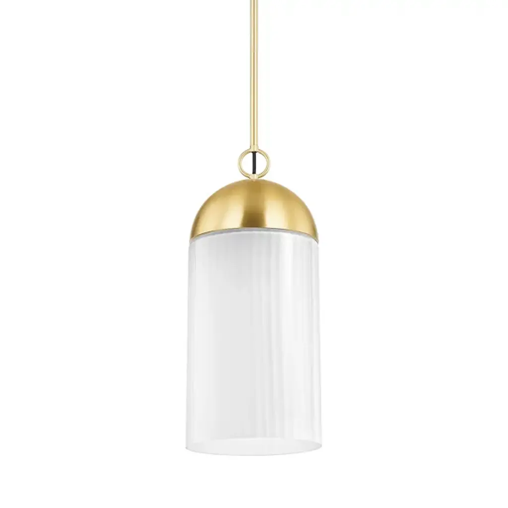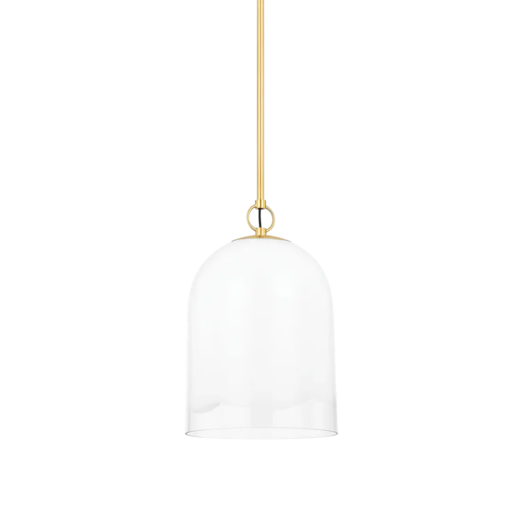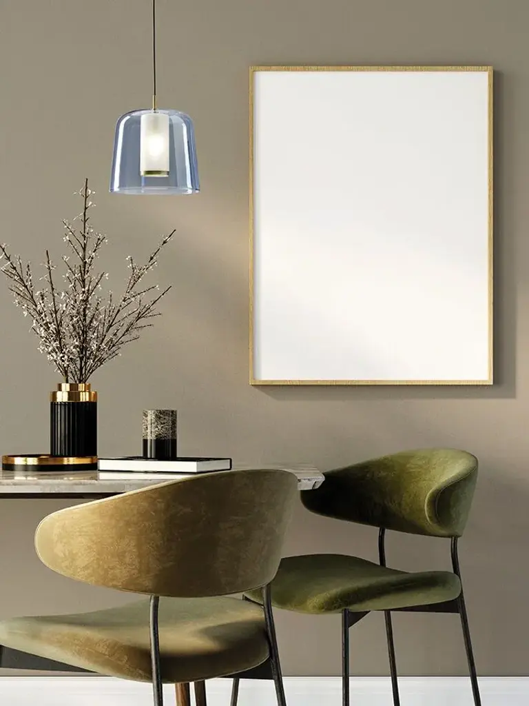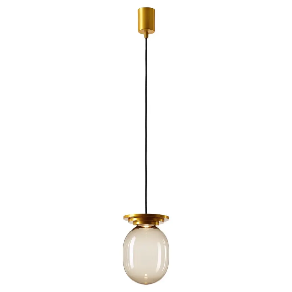 FRIDA is a borosilicate glass suspension lamp available in field green, sky blue or sand. Internal frosted borosilicate glass diffuser. Brushed gold lamp stem and ceiling cover. Black 200 cm power supply cord. Compatible with G9 LED light bulbs. Source G9 LED | Power 1 x max 10w