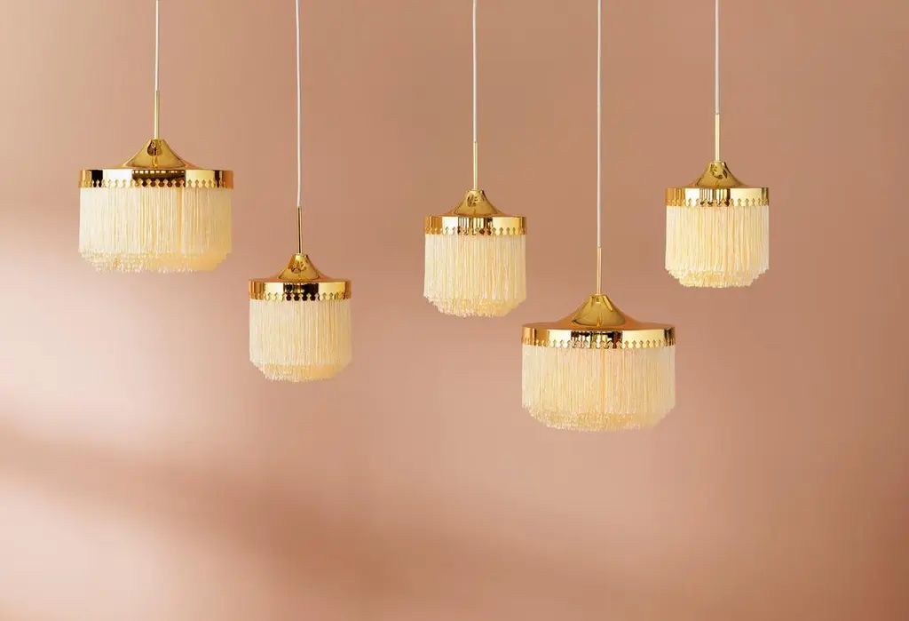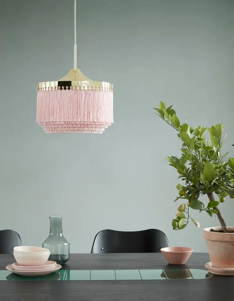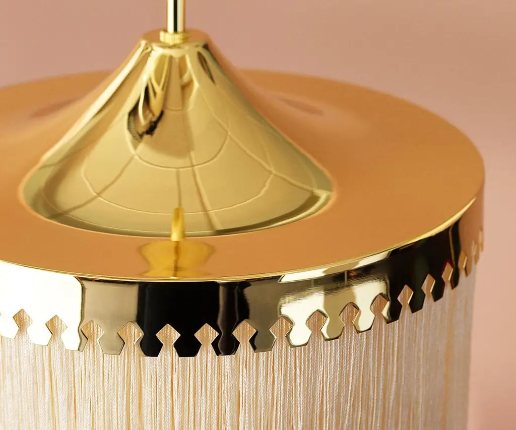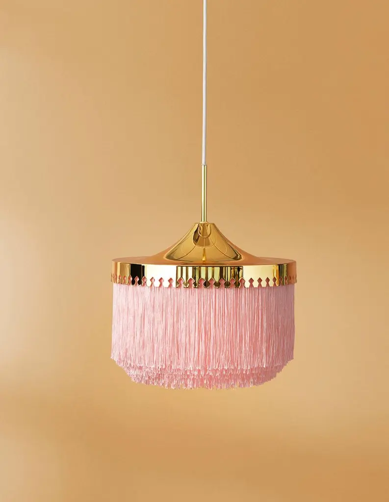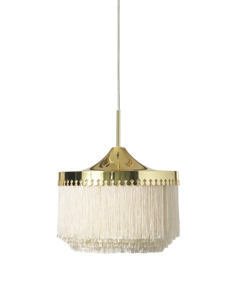 Fringe cream white large pendant by Warm NordicDimensions: D 30 x H 28 cmMaterial: Brass plated steel, Viscose fringesWeight: 1 kgAlso available in different colours and dimensions.An iconic pendant lamp with sophisticated fringes, created in 1960 by the acclaimed Swedish lighting genius, Hans-Agne Jakobsson. Fringe is a timeless design statement, constructed to create warm, cosy lighting by means of the fringes that conceal the light source beautifully. This exclusive pendant lamp will charm any room in the home with its soft light and graceful appearance. Perfect for an old luxury flat with stucco ceilings, but just as wonderful in a more modern setting, where the pendant will add soul and sensuousness. The Fringe pendant lamp evokes the interiors of the past, but in a simplified design with an eye for contrasts and exclusive materials. The table lamp uses LED light, which has low heat generation and a long service life.Warm Nordic is an ambitious design brand anchored in Nordic design history and with a timeless, aesthetic style that inspires you to appreciate the little things in life. The company is the result of several years’ intense work on developing a new design brand with design history, quality and personality at its core. Warm Nordic boasts a colourful and charming universe of furniture, lamps and accessories full of personality. Our designs encapsulate the Nordic spirit, which in its essence is timeless, inclusive and warm.