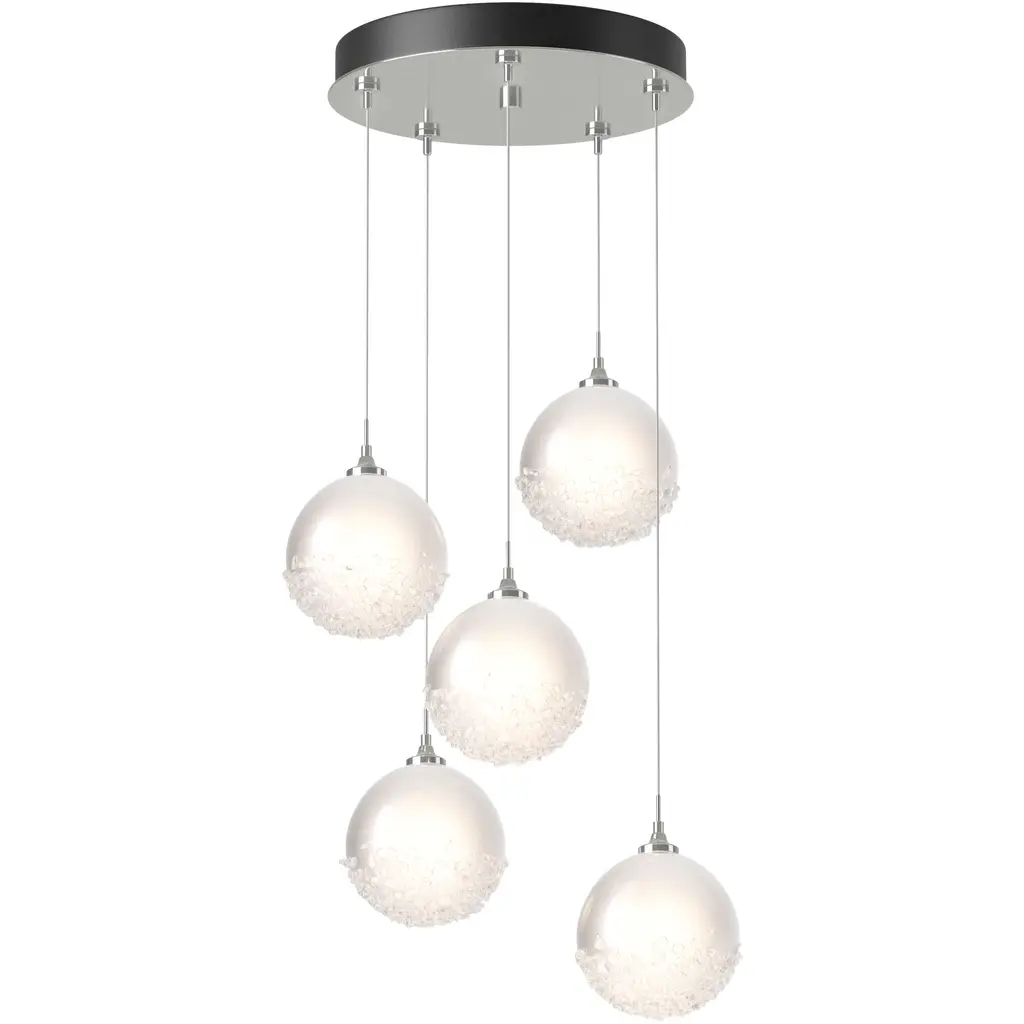 An elegant ceiling fixture, the Fritz Globe 5-Light Pendant is as versatile as it is beautiful. With its smaller round canopy and ability to customize each individual low-voltage cable length, the Fritz 5-Light can be a dramatic semi-flush or a graceful pendant—whatever suits your space! Five spherical glass shades are etched on the inside to provide a diffused light, with the bottom of each outer glossy surface, covered in a heavily-textured fritted glass.