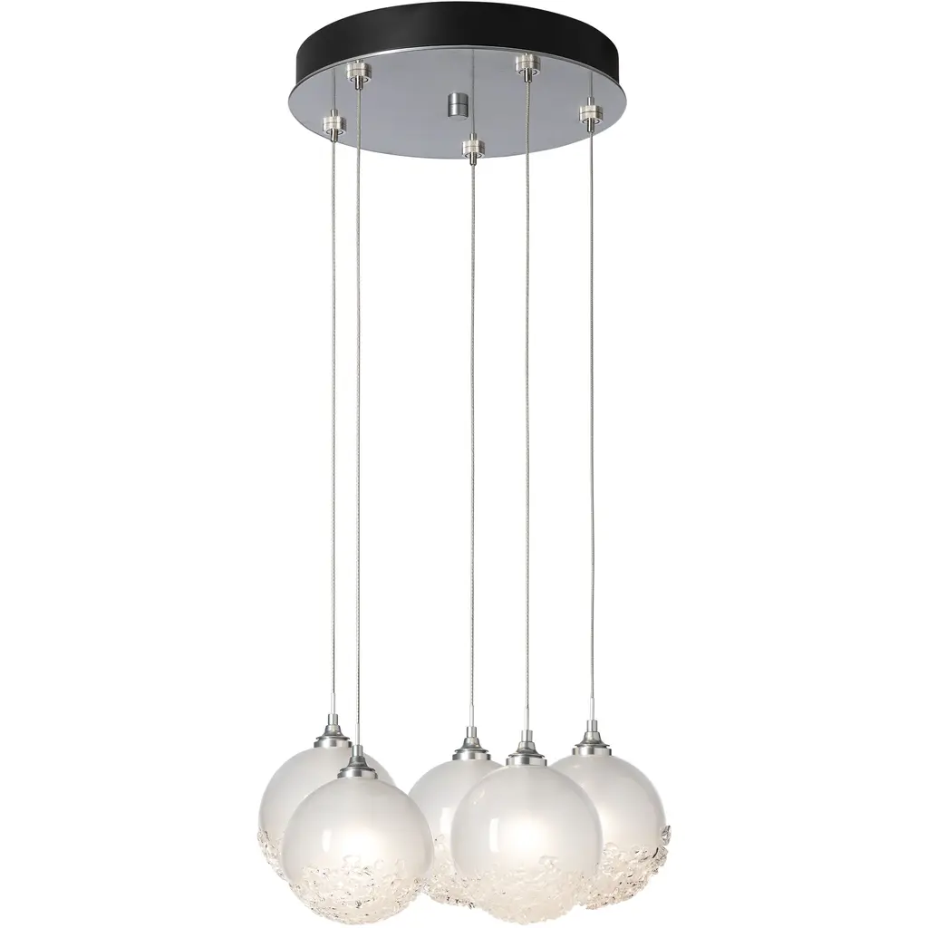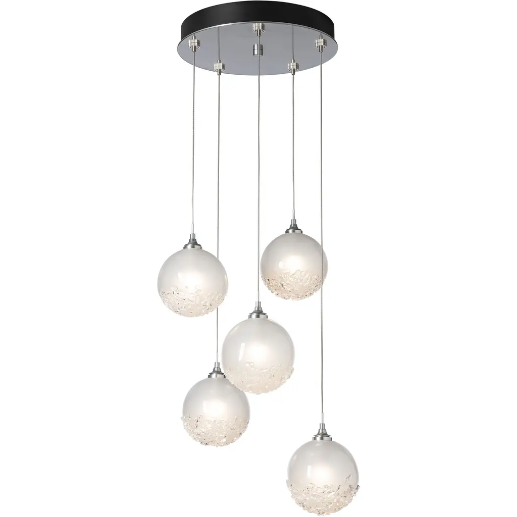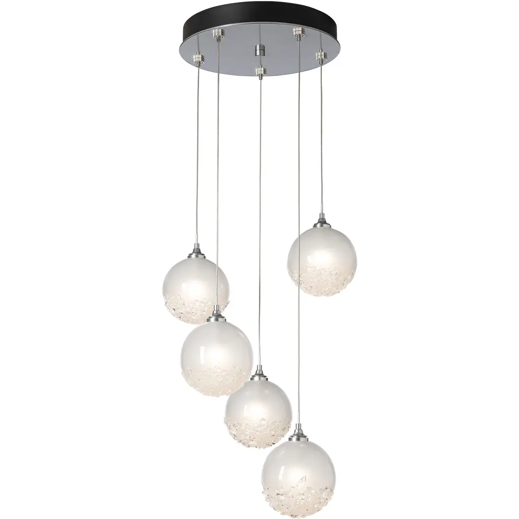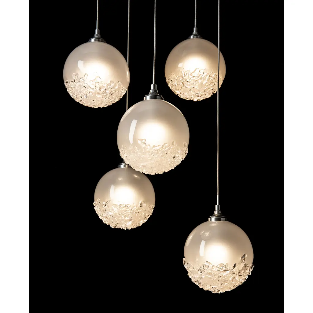 An elegant ceiling fixture, the Fritz Globe 5-Light Pendant is as versatile as it is beautiful. With its smaller round canopy and ability to customize each individual low-voltage cable length, the Fritz 5-Light can be a dramatic semi-flush or a graceful pendant—whatever suits your space! Five spherical glass shades are etched on the inside to provide a diffused light, with the bottom of each outer glossy surface, covered in a heavily-textured fritted glass.