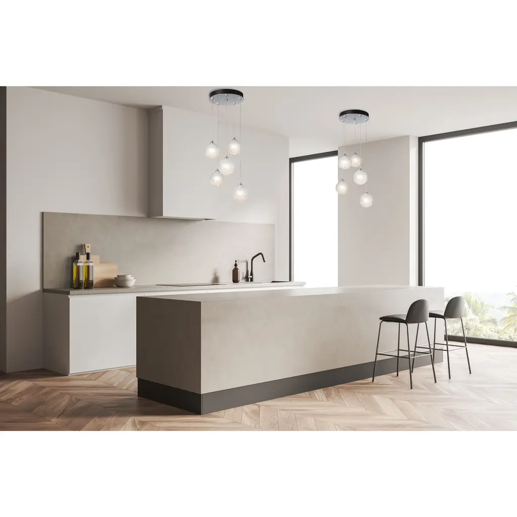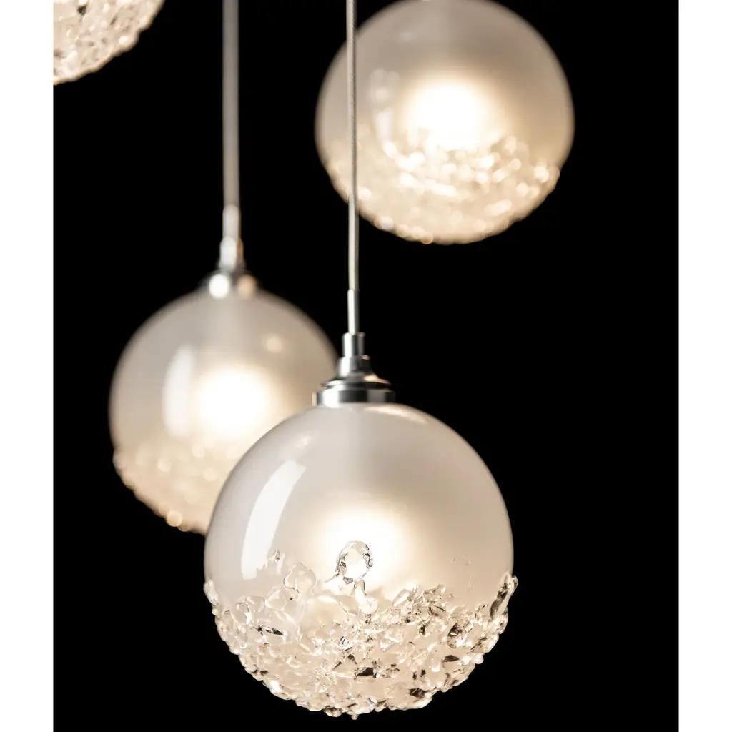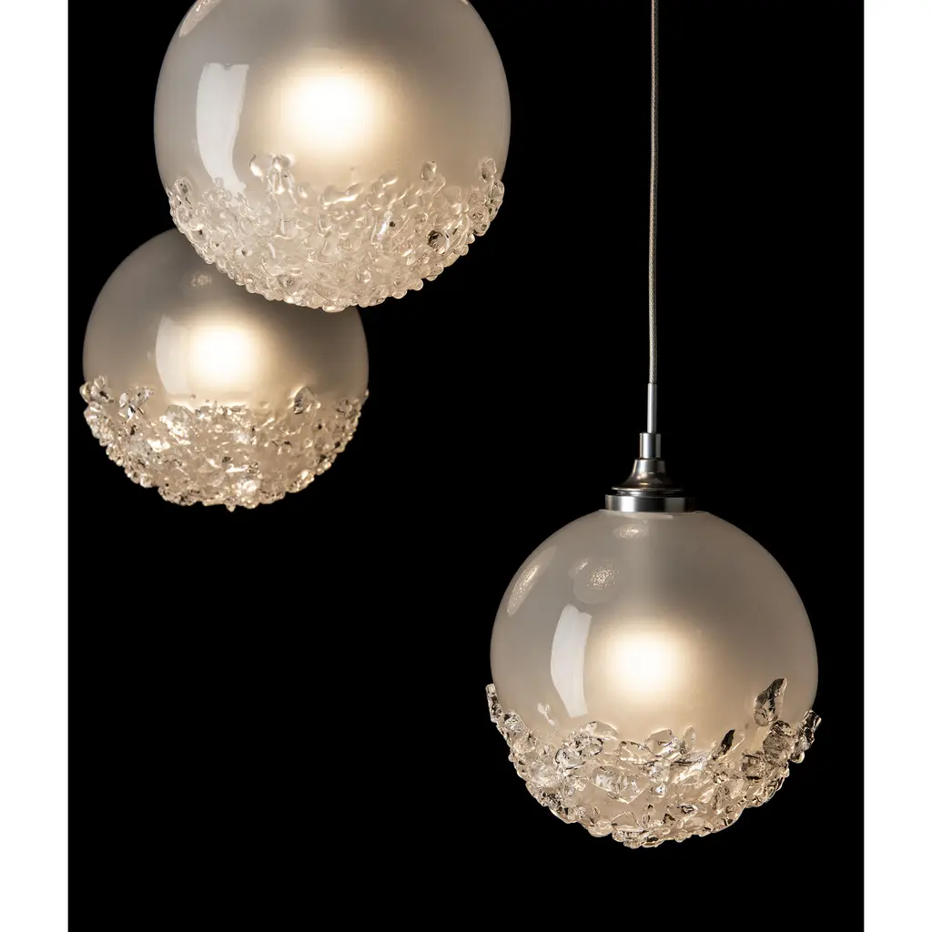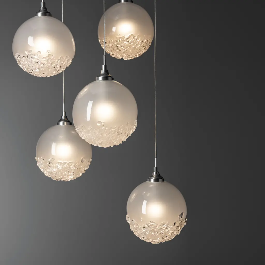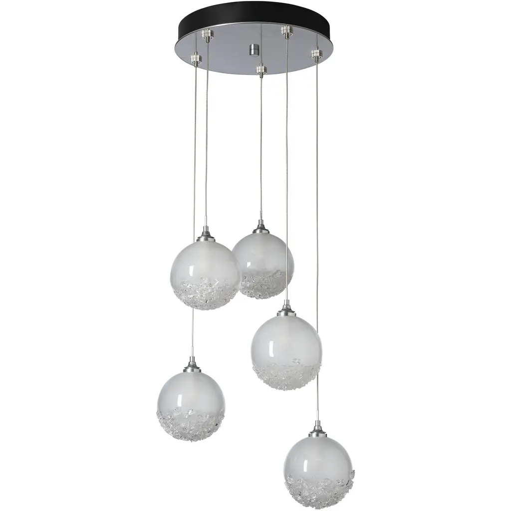 An elegant ceiling fixture, the Fritz Globe 5-Light Pendant is as versatile as it is beautiful. With its smaller round canopy and ability to customize each individual low-voltage cable length, the Fritz 5-Light can be a dramatic semi-flush or a graceful pendant—whatever suits your space! Five spherical glass shades are etched on the inside to provide a diffused light, with the bottom of each outer glossy surface, covered in a heavily-textured fritted glass.