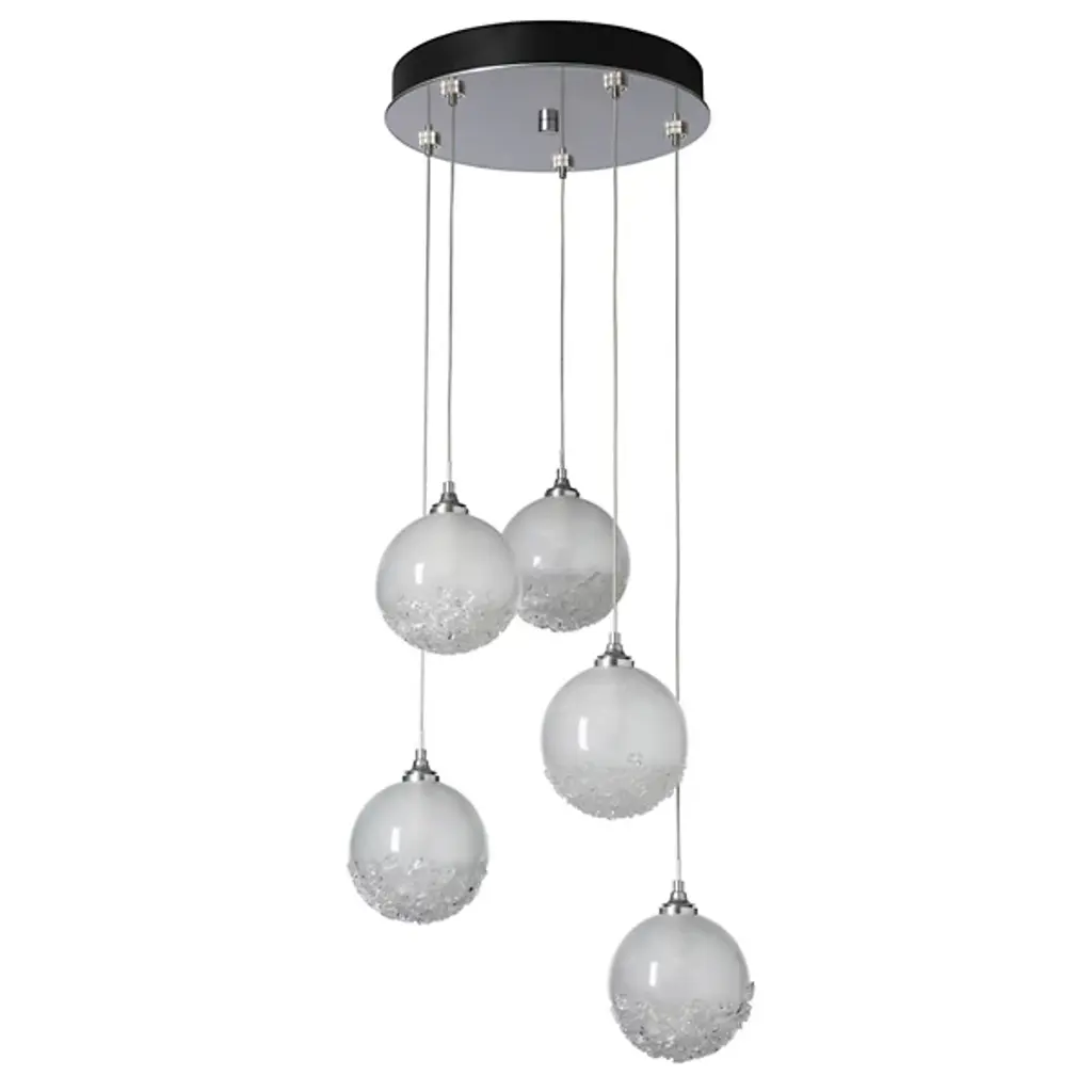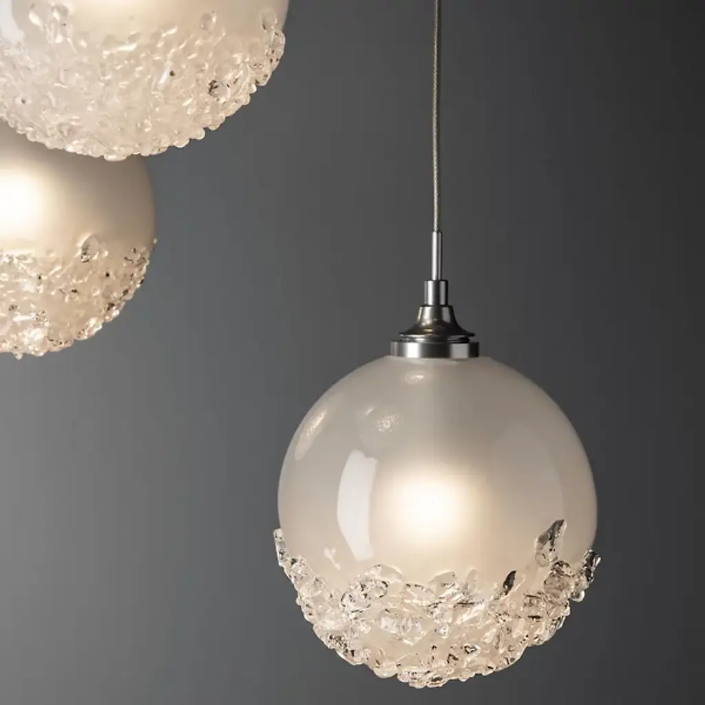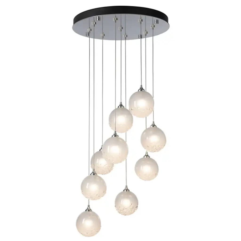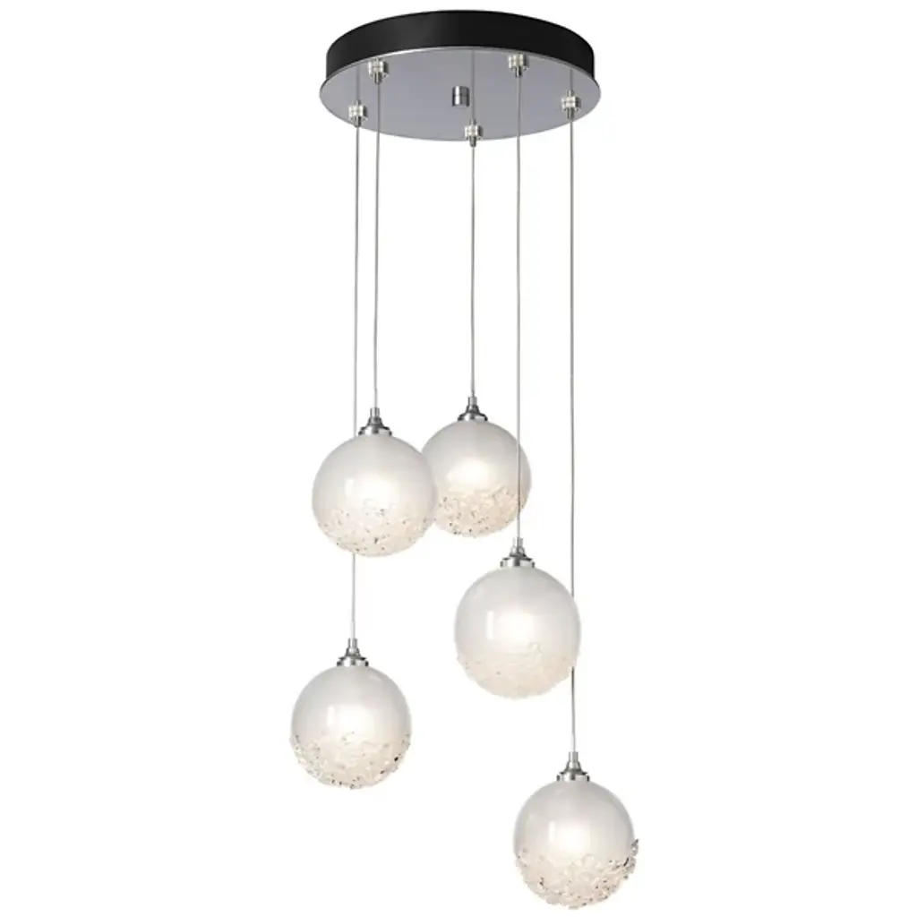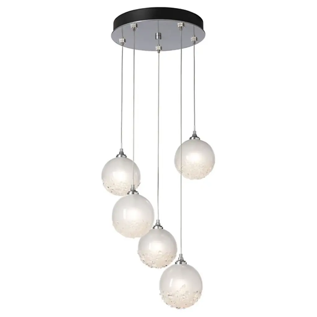 Fantastically frosty and fritted lighting design. The Fritz Globe Multi-Light Pendant by Hubbardton Forge features several glass globes sharing a single canopy, making it a great option for tall and narrow spaces like foyers or stairwells. These soft-looking spheres are given a sugary sweet and edgy look with the application of textural glass frit on the bottom. In addition to giving each pendant light its distinctive texture, the frit also enhances the quality of light diffused through the shade with its subtle sparkle.