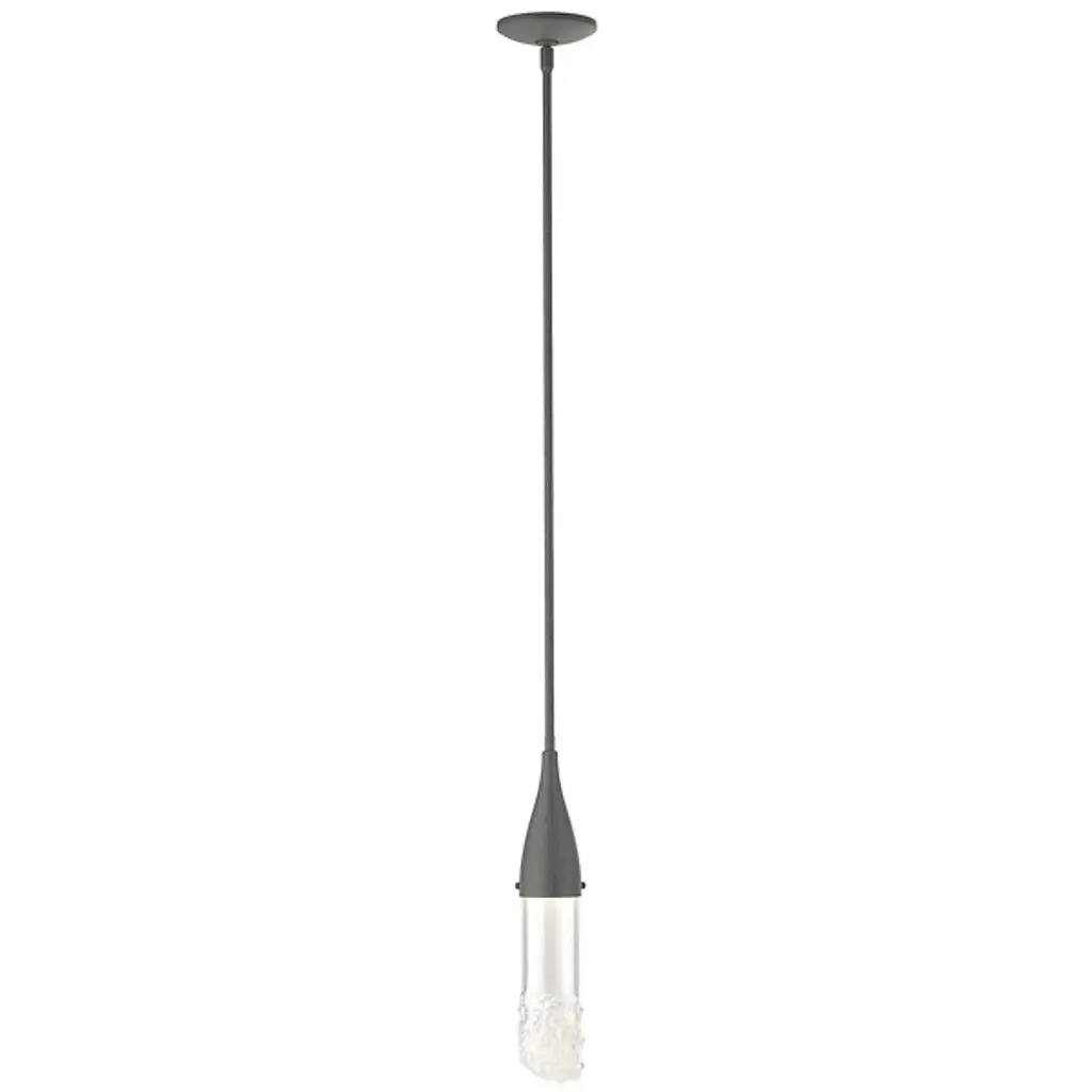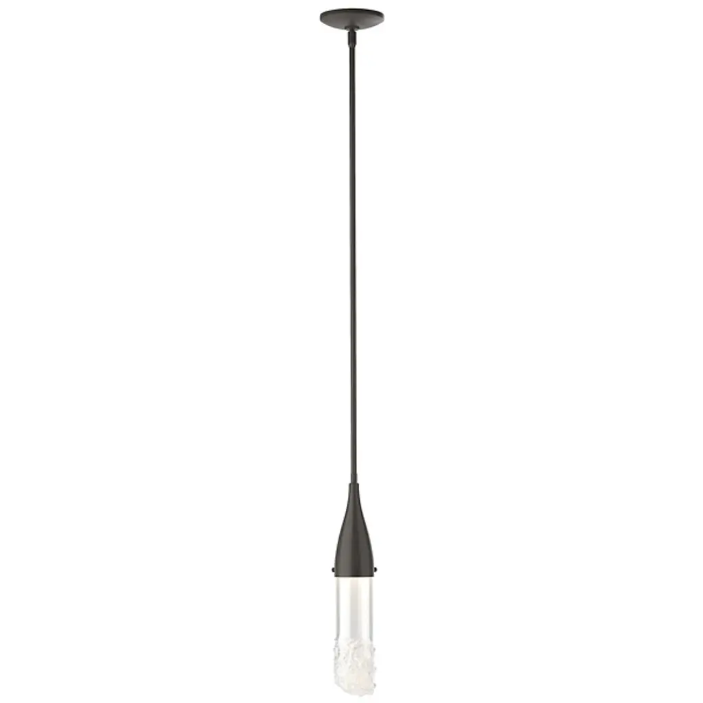 The Fritz Mini Pendant from Hubbardton Forge will add a stimulating aspect to any living space. Whether modern, traditional, or somewhere in between, this pendant blends beautifully with a variety of spaces, but is able to hold its own as a design piece. The thin elongated top connects to the glass shade which is fused with glass fragments to create a sparkling effect. This piece is made to order by skilled artisans in the US. Looks great when used as an accent light, decorative light, or in multiples for island lighting.
