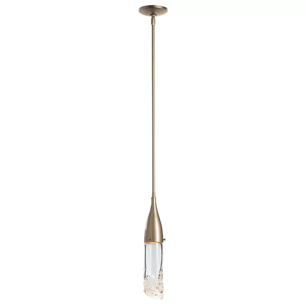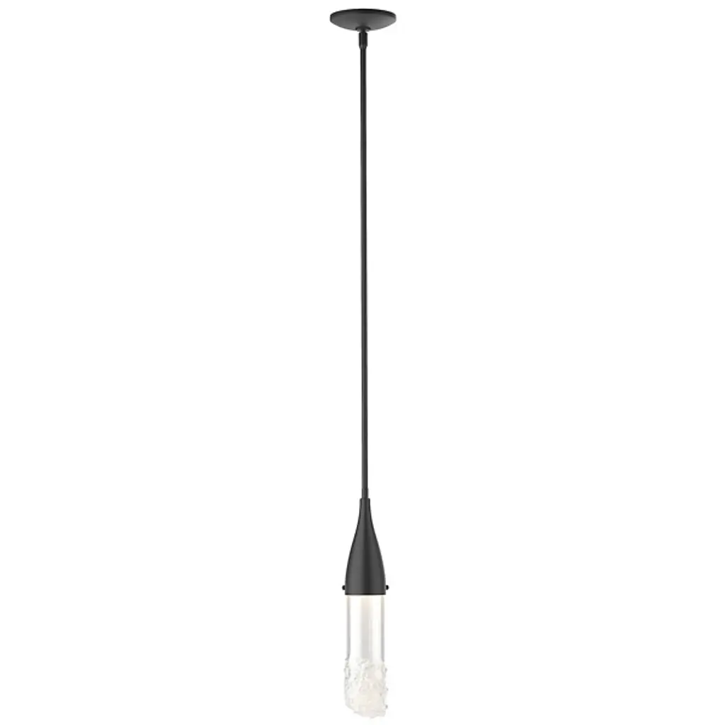 The Fritz Mini Pendant from Hubbardton Forge will add a stimulating aspect to any living space. Whether modern, traditional, or somewhere in between, this pendant blends beautifully with a variety of spaces, but is able to hold its own as a design piece. The thin elongated top connects to the glass shade which is fused with glass fragments to create a sparkling effect. This piece is made to order by skilled artisans in the US. Looks great when used as an accent light, decorative light, or in multiples for island lighting.