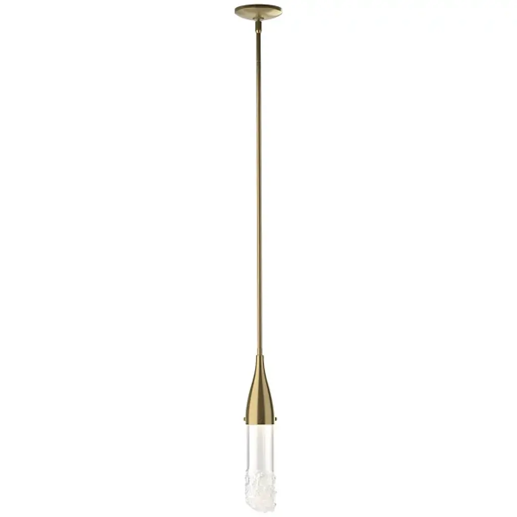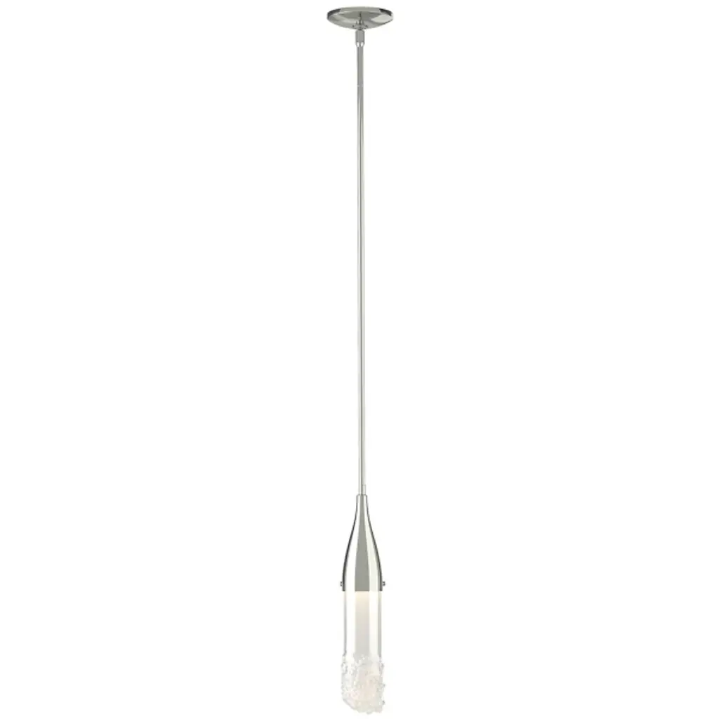 The Fritz Mini Pendant from Hubbardton Forge will add a stimulating aspect to any living space. Whether modern, traditional, or somewhere in between, this pendant blends beautifully with a variety of spaces, but is able to hold its own as a design piece. The thin elongated top connects to the glass shade which is fused with glass fragments to create a sparkling effect. This piece is made to order by skilled artisans in the US. Looks great when used as an accent light, decorative light, or in multiples for island lighting.
