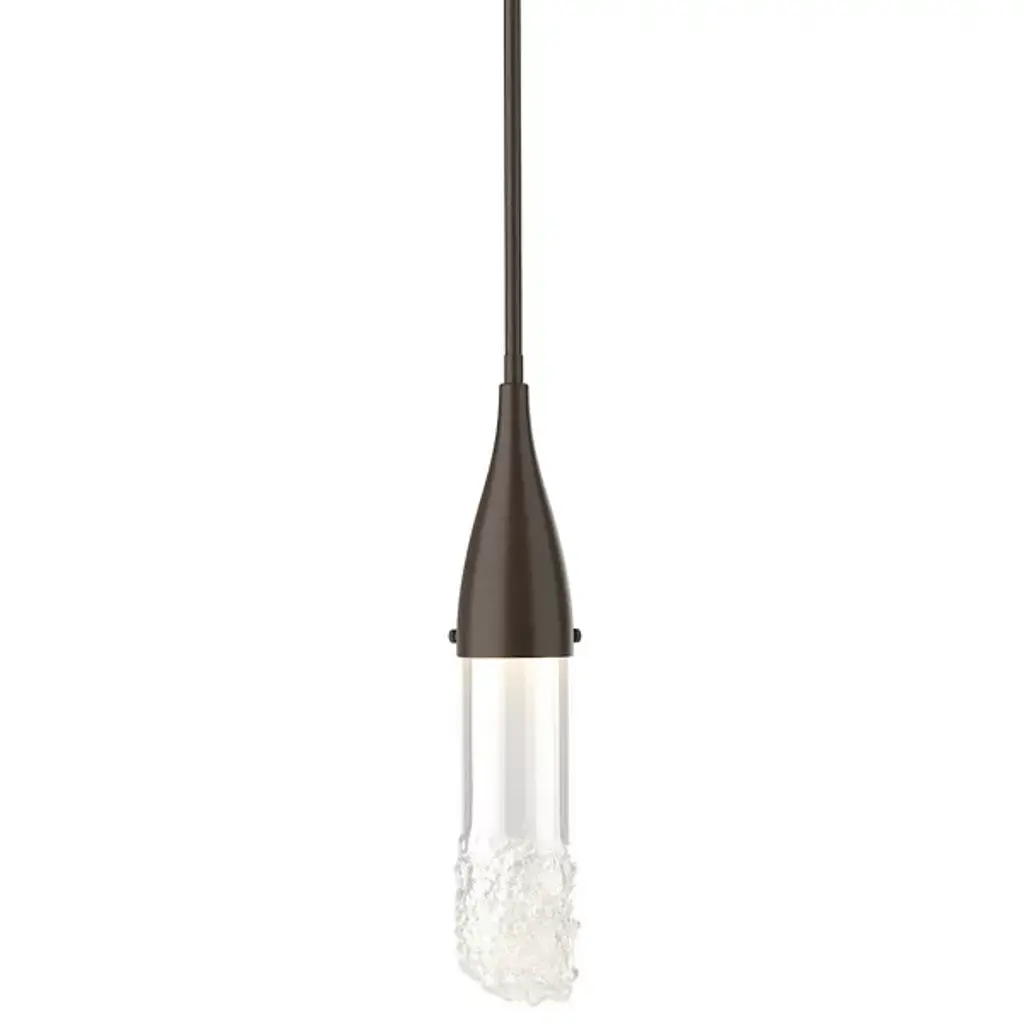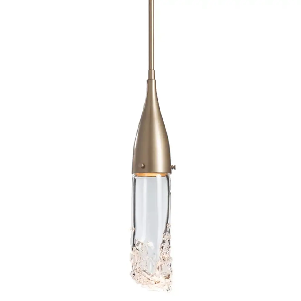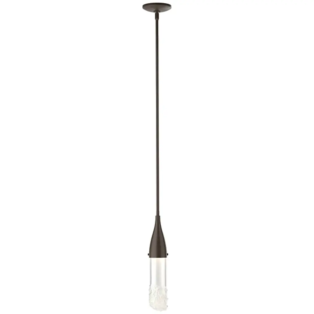 The Fritz Mini Pendant from Hubbardton Forge will add a stimulating aspect to any living space. Whether modern, traditional, or somewhere in between, this pendant blends beautifully with a variety of spaces, but is able to hold its own as a design piece. The thin elongated top connects to the glass shade which is fused with glass fragments to create a sparkling effect. This piece is made to order by skilled artisans in the US. Looks great when used as an accent light, decorative light, or in multiples for island lighting.