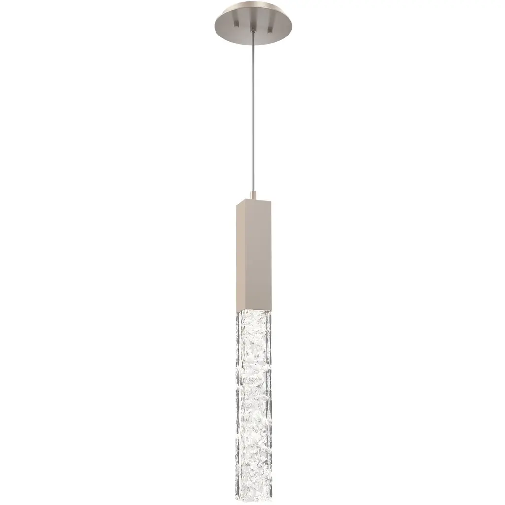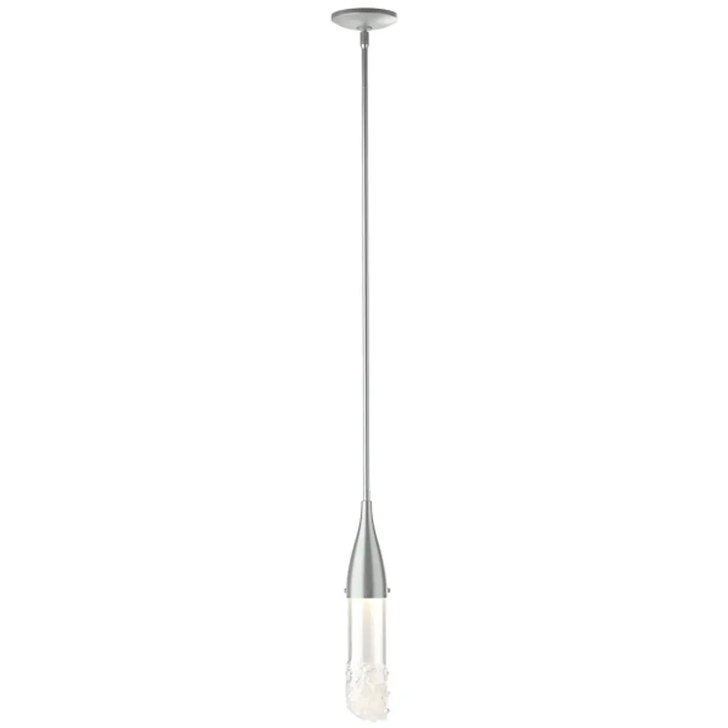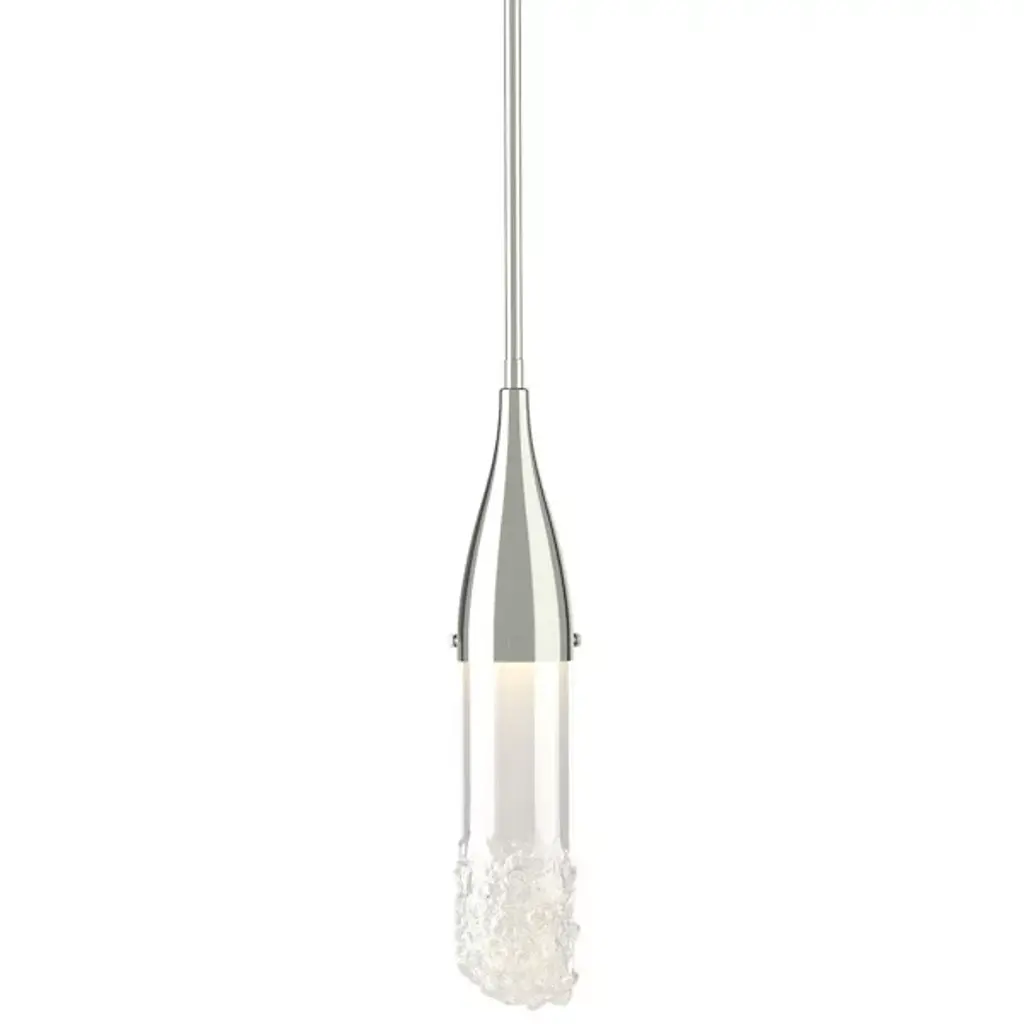 The Fritz Mini Pendant from Hubbardton Forge will add a stimulating aspect to any living space. Whether modern, traditional, or somewhere in between, this pendant blends beautifully with a variety of spaces, but is able to hold its own as a design piece. The thin elongated top connects to the glass shade which is fused with glass fragments to create a sparkling effect. This piece is made to order by skilled artisans in the US. Looks great when used as an accent light, decorative light, or in multiples for island lighting.