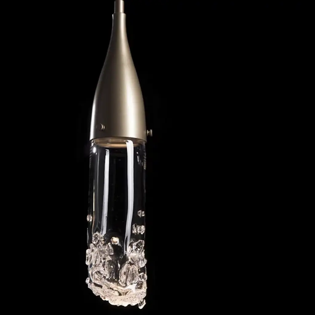 The Fritz Mini Pendant from Hubbardton Forge will add a stimulating aspect to any living space. Whether modern, traditional, or somewhere in between, this pendant blends beautifully with a variety of spaces, but is able to hold its own as a design piece. The thin elongated top connects to the glass shade which is fused with glass fragments to create a sparkling effect. This piece is made to order by skilled artisans in the US. Looks great when used as an accent light, decorative light, or in multiples for island lighting.
