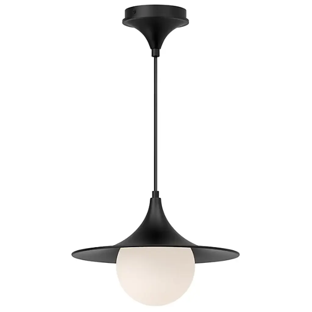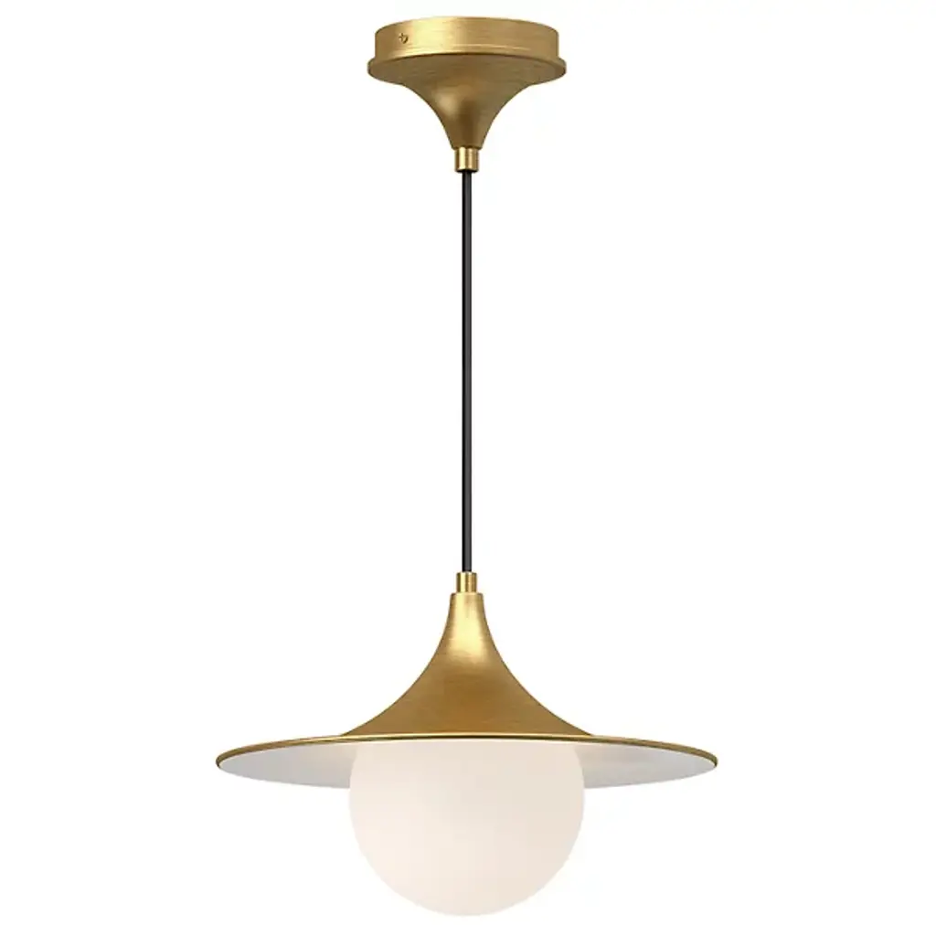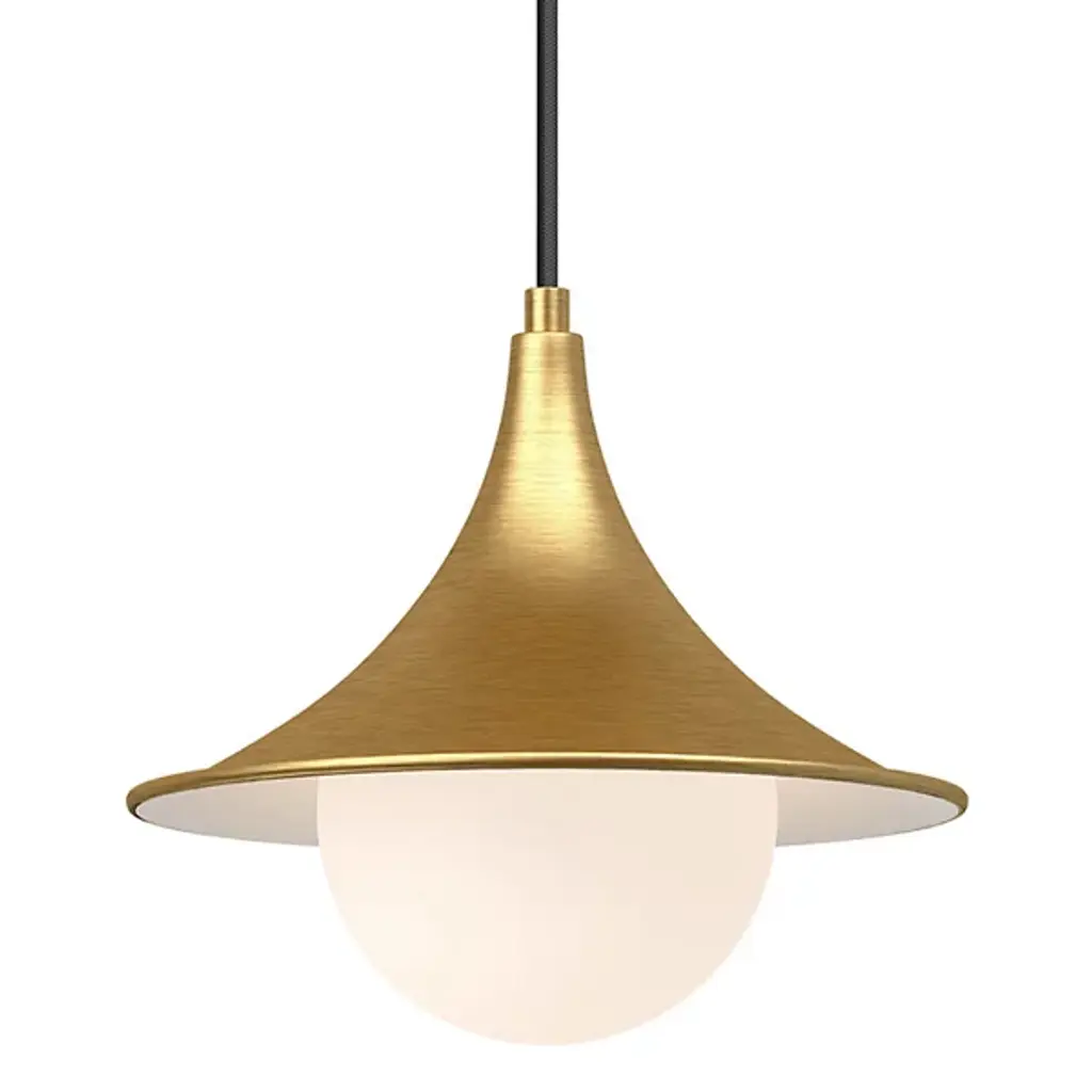 The Fuji Pendant by Alora Mood was inspired by historical art representations of Mount Fuji, earning it both its name and sweeping silhouette. A tapered canopy mirrors the sleek, flared shade suspended below it, matching both form and finish to give this design a balanced composition. Tucked under this shade is a smooth, spherical, opal glass globe that lends a softly diffused layer of illumination to its surroundings, completing the serene nature of this design.