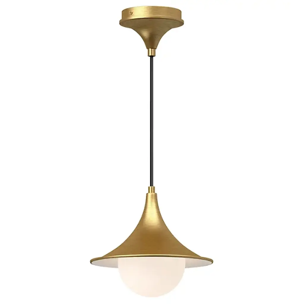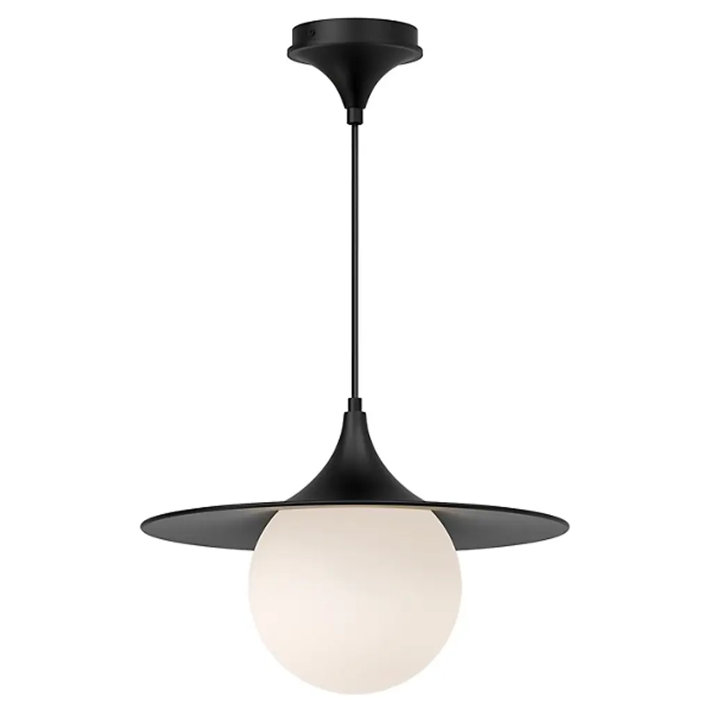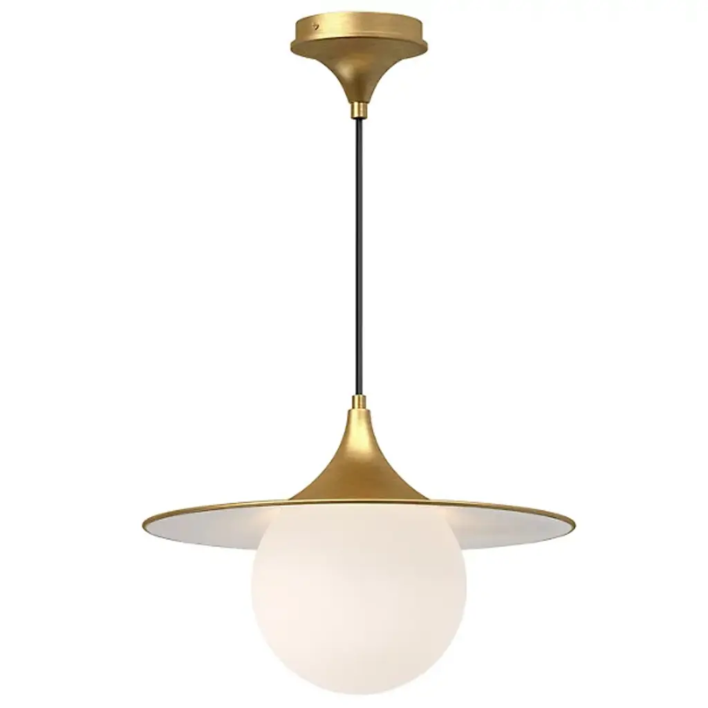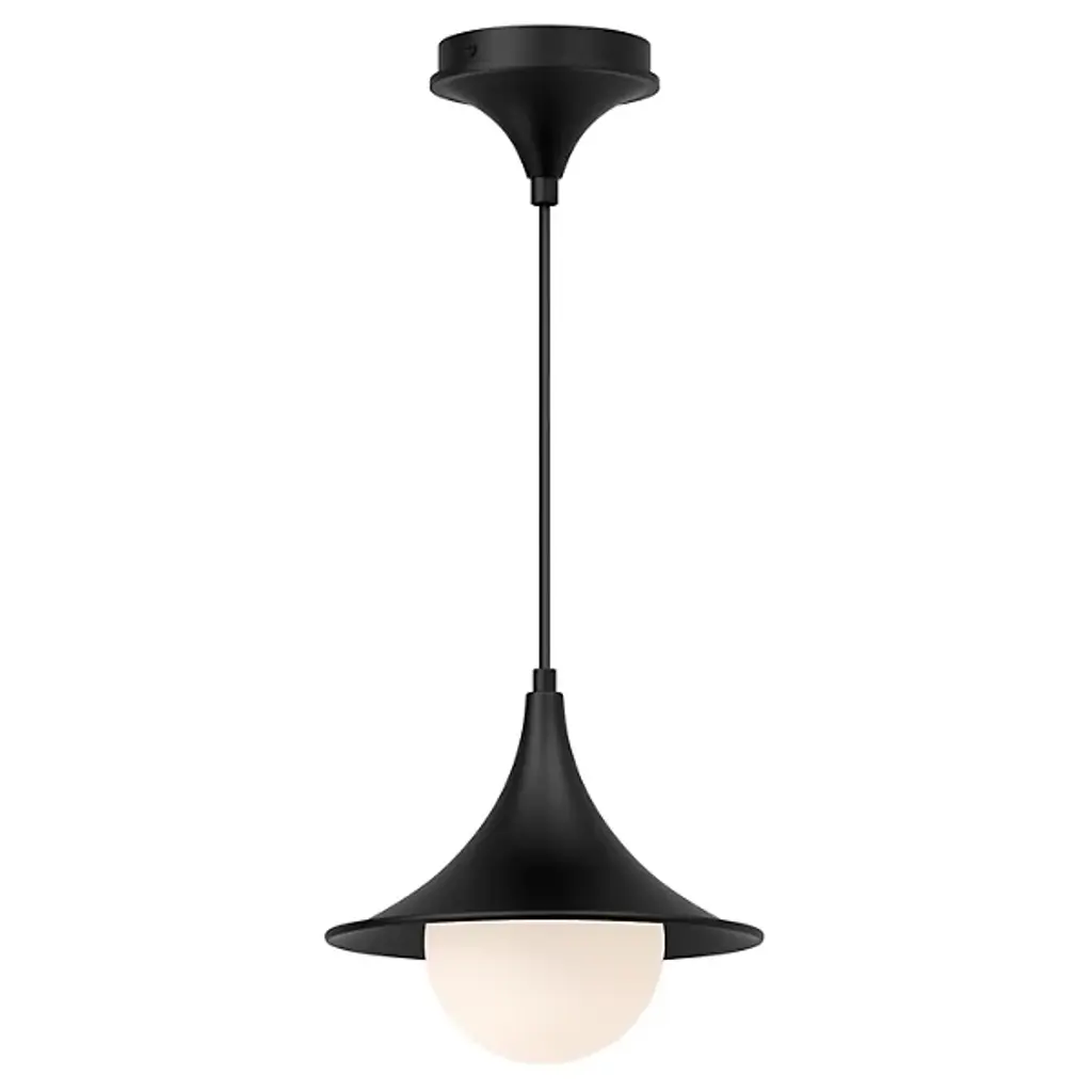 The Fuji Pendant by Alora Mood was inspired by historical art representations of Mount Fuji, earning it both its name and sweeping silhouette. A tapered canopy mirrors the sleek, flared shade suspended below it, matching both form and finish to give this design a balanced composition. Tucked under this shade is a smooth, spherical, opal glass globe that lends a softly diffused layer of illumination to its surroundings, completing the serene nature of this design.