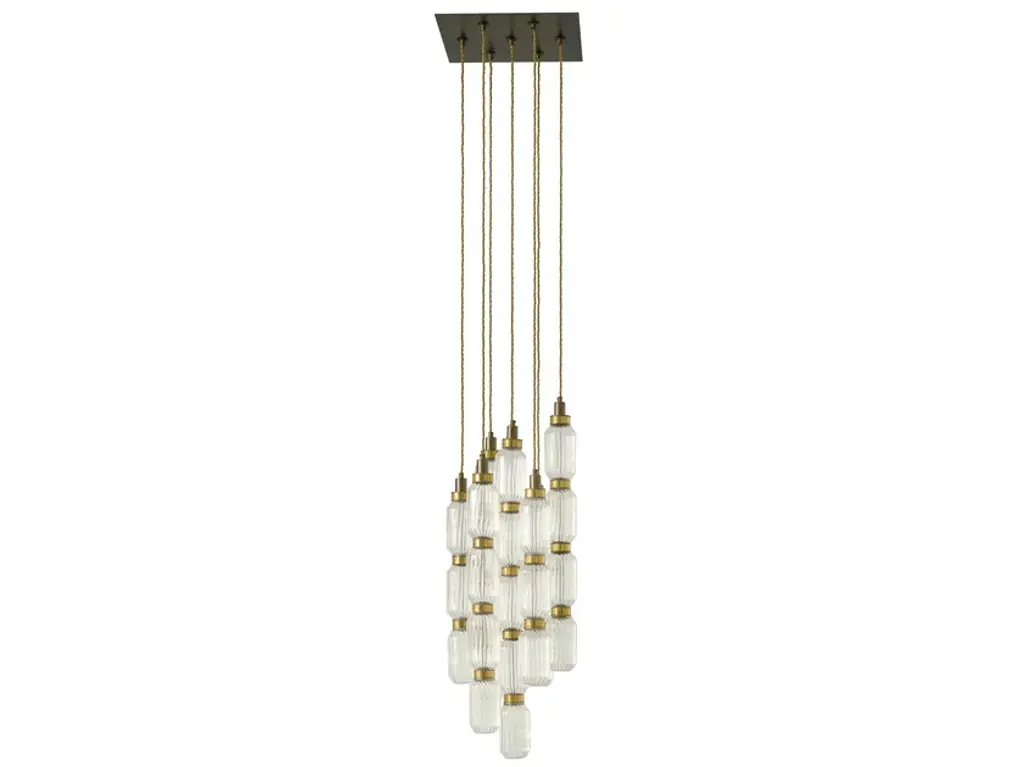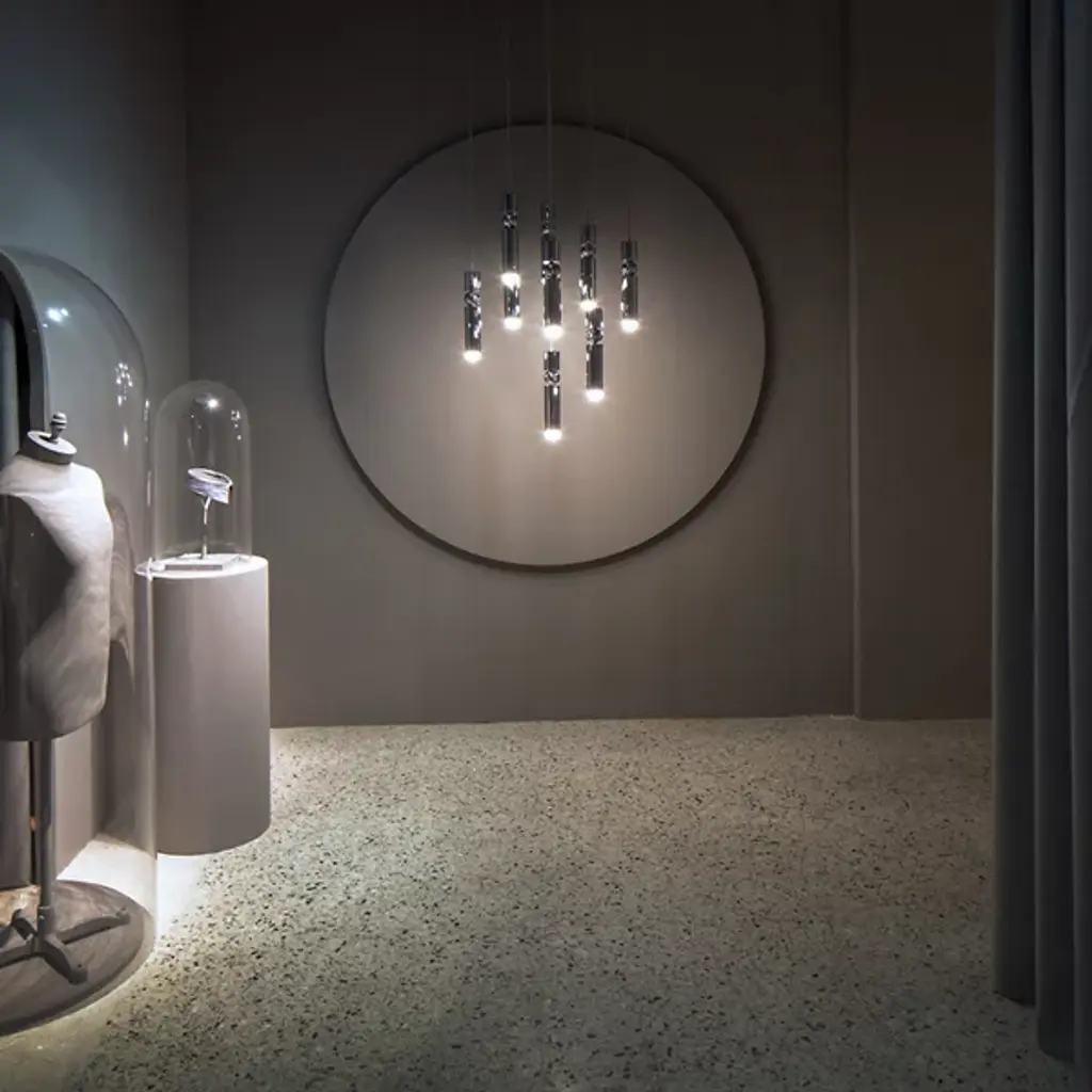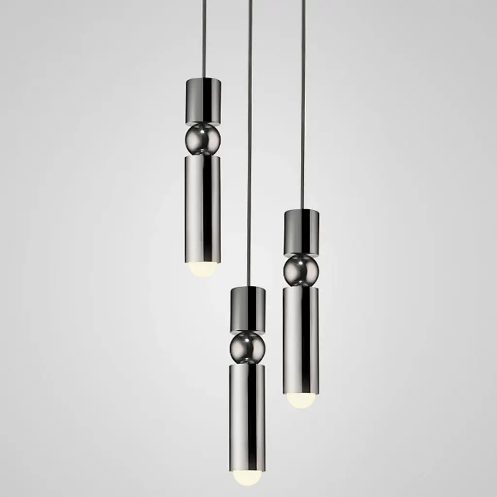 The Fulcrum LED Multi-Light Pendant by Lee Broom features 5 opulent Fulcrum pendants hung at various lengths from a single canopy. Each fixture is stunningly reflective with an off-center spherical “fulcrum” that divides its otherwise cylindrical body. A naked bulb fits into an opening at each base and remains partially exposed for additional light coverage and a capped-off look that is aesthetically pleasing to the eye. Ideal for kitchens, restaurants, and commercial displays.