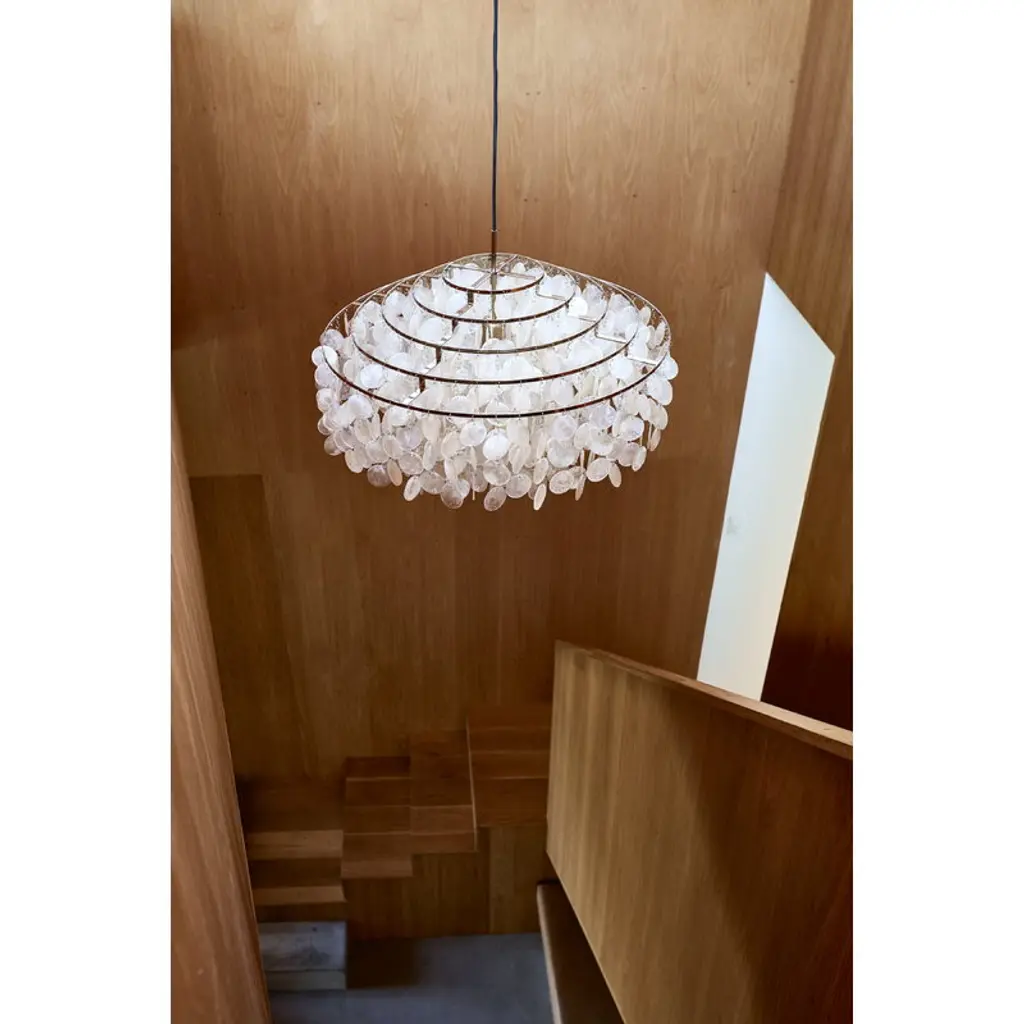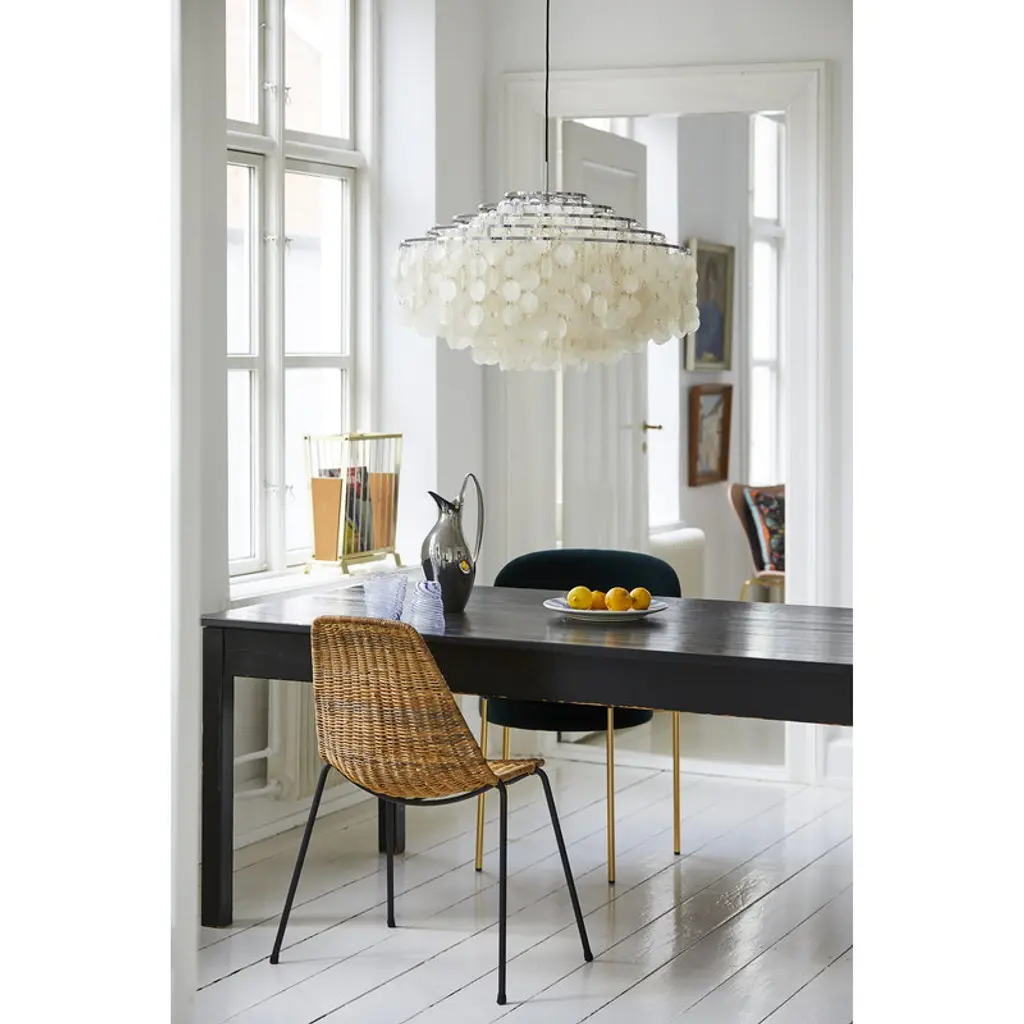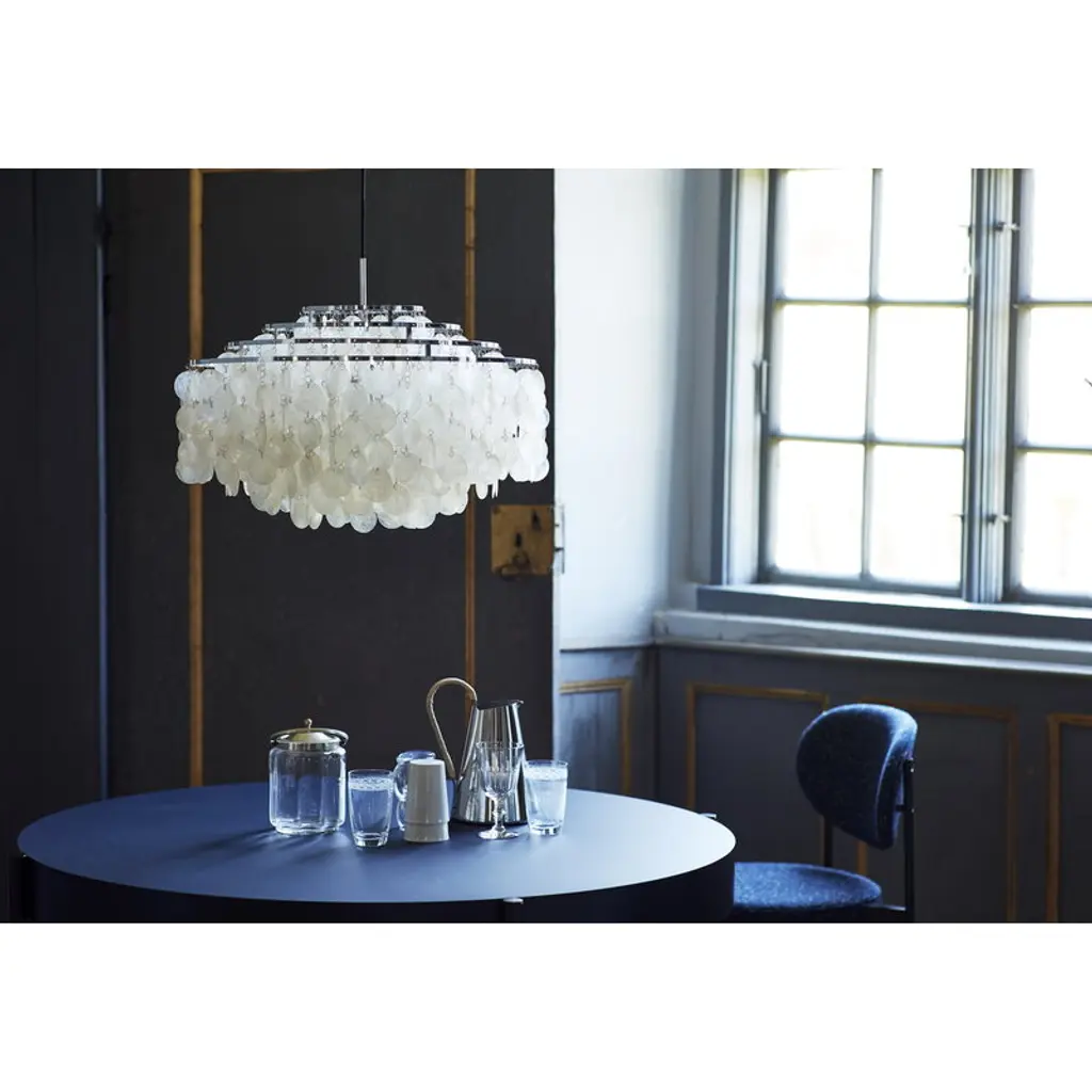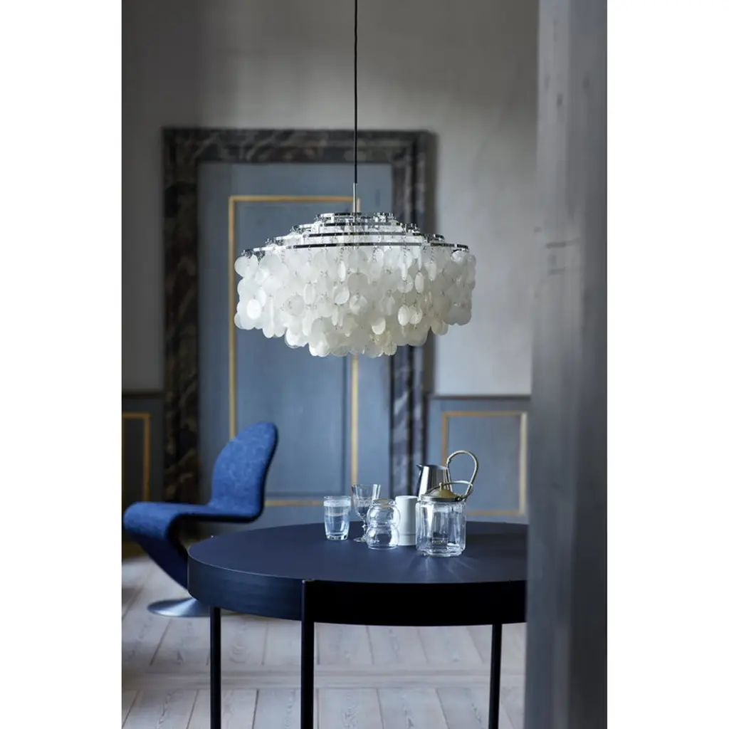 Verpan’s Fun 10DM pendant, designed by Verner Panton, is an elegant design classic inspired by nature. The lamp’s beautiful reflective disks, made of mother-of-pearl, cascade from a metal frame, spreading light in a soft, unique manner. Designed to be more than just lighting, the Fun 10DM pendant is a striking, sculptural design that will add a splash of elegance and splendor to any interior, be it in private homes or public spaces.