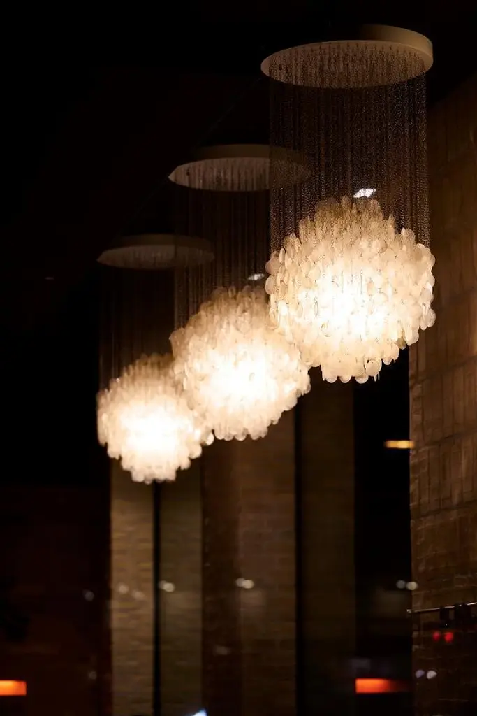 Hanging lamp with one cluster of discs attached by chains of small rings. Mounted on a white wooden ceiling plate. Assembly instructions available here .
