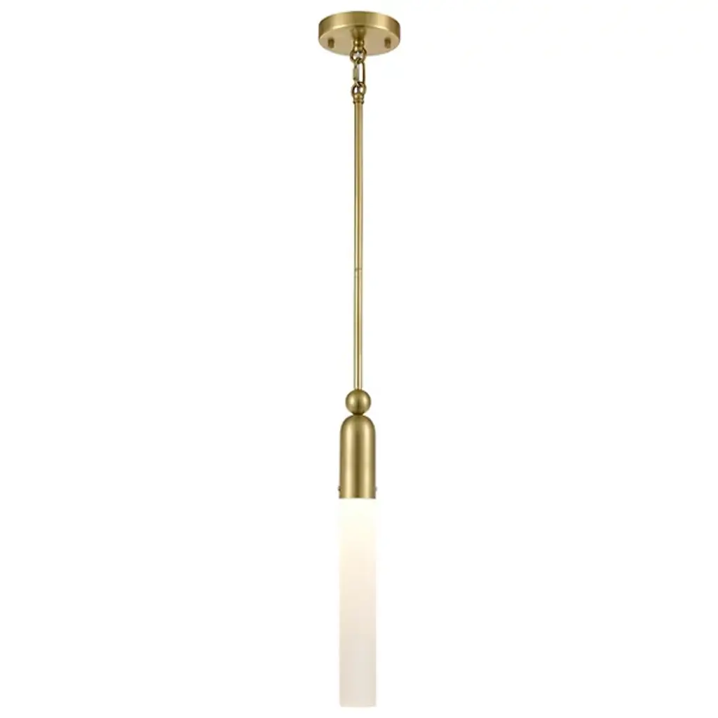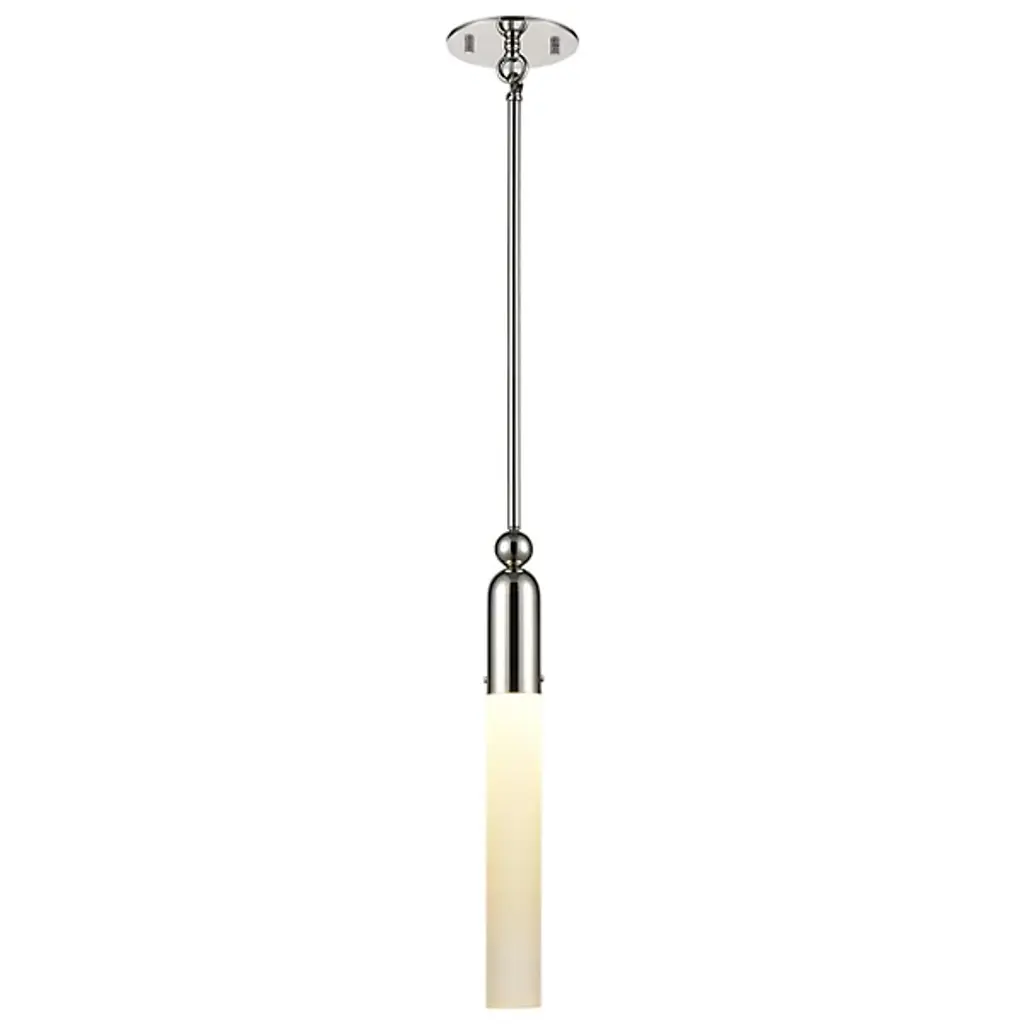 The Fusion Mini Pendant from Zeev Lighting accents the room all alone or as a multiple with an attention to detail. The modern piece features a slim profile for versatile placement. Its slender rod, canopy, and lamp holder share a reflective finish that draws the eye at any time of day. The round features of the lamp holder pop against the milky acrylic diffuser. This diffuser sends down a smooth cast light below.