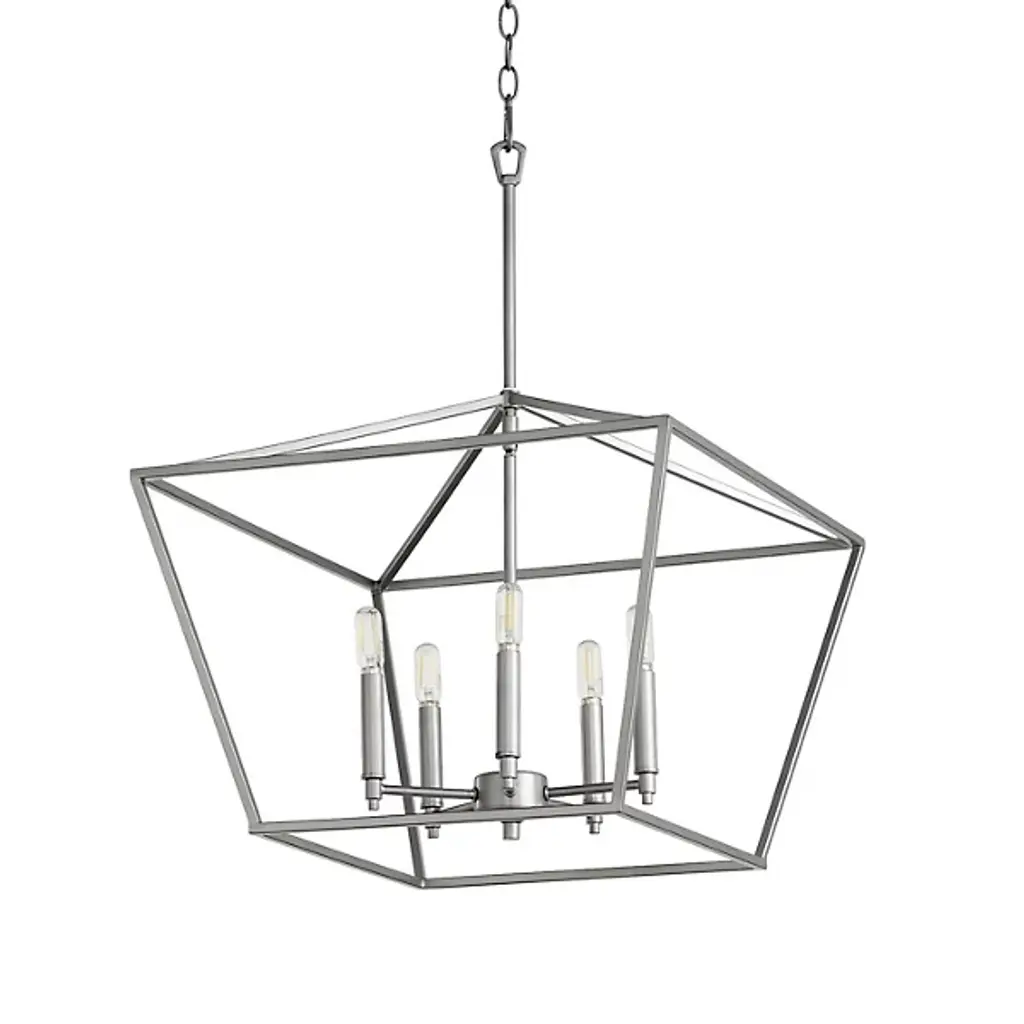 Add a touch of the geometric to your ceilings with the Gabriel Pendant by Quorum International. It’s a traditional design that matches a conical canopy with a chain and stem arrangement descending to a central hub set under an open prism structure of flat metal rods. Upward-facing candelabra-style lamping branches out evenly via shorter spokes, best used with retro bulbs that shining out from above, bringing a clean, bright presence to its surroundings.