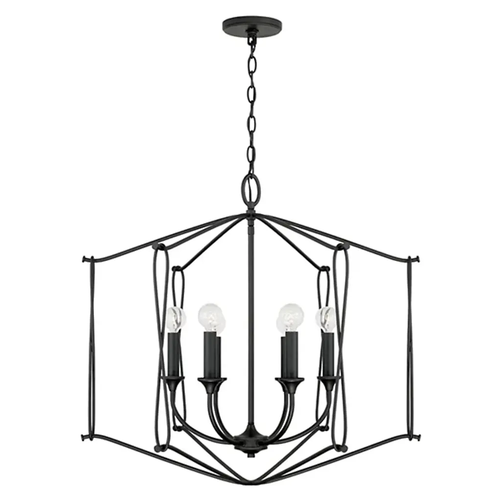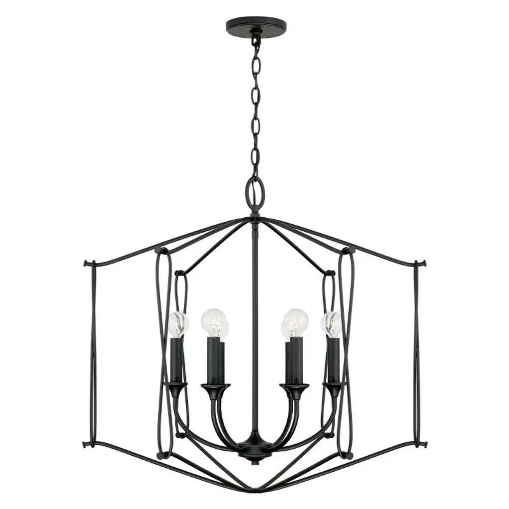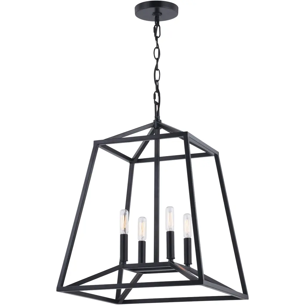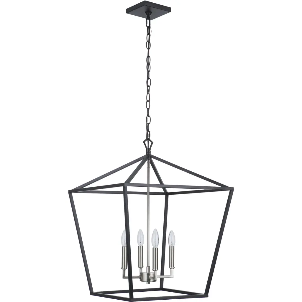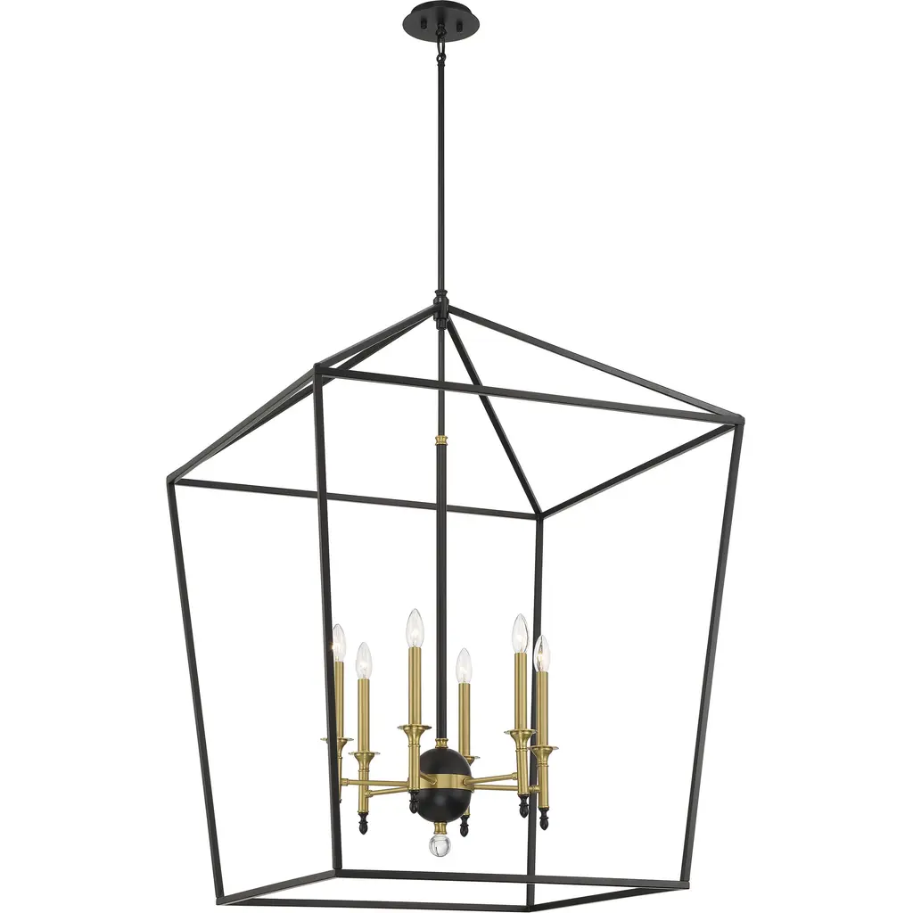 Add a touch of the geometric to your ceilings with the Gabriel Pendant by Quorum International. It’s a traditional design that matches a conical canopy with a chain and stem arrangement descending to a central hub set under an open prism structure of flat metal rods. Upward-facing candelabra-style lamping branches out evenly via shorter spokes, best used with retro bulbs that shining out from above, bringing a clean, bright presence to its surroundings.