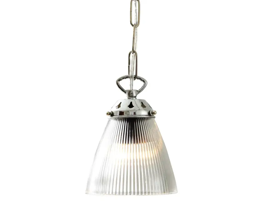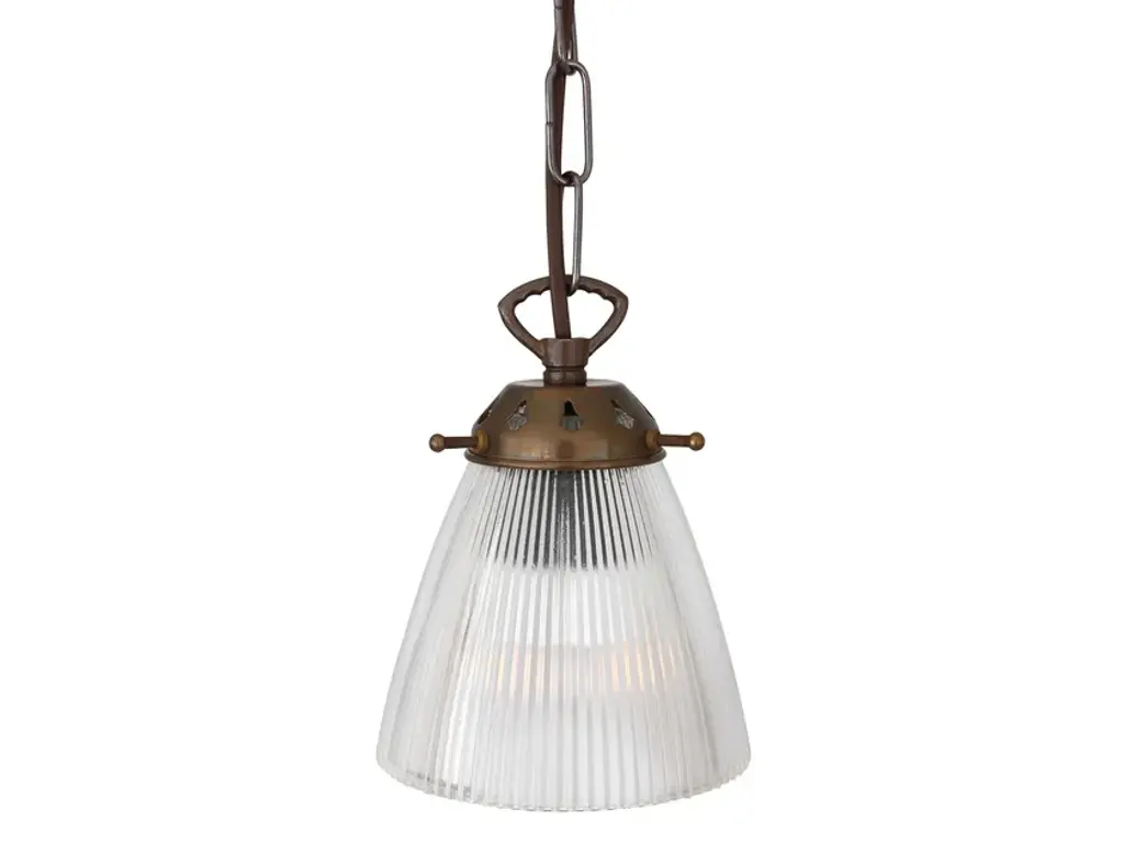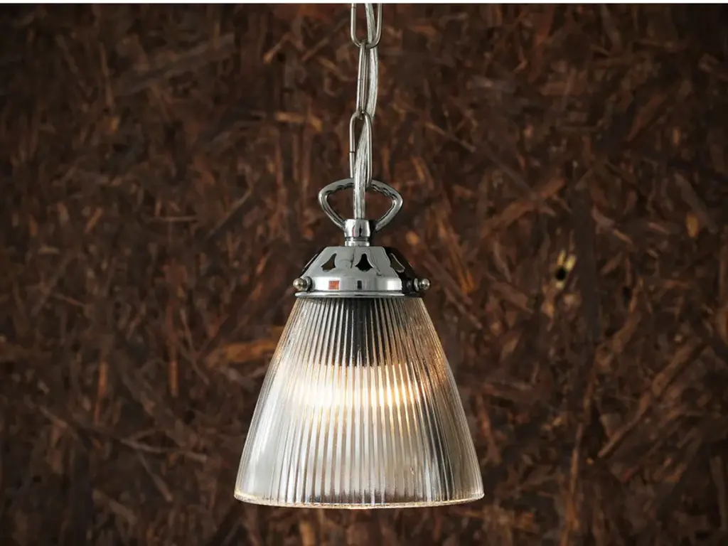 This industrial pendant light with a holophane glass prismatic adds a warm light to any room.Material Brass | Steel | GlassFlex/Chain Length 100cm | 40”Weight 0.740kgMax Wattage 40wVoltage 220/240vLampholder E14 | Plastic | SES | Small Edison ScrewIP Rating IP20Glass Code GL117