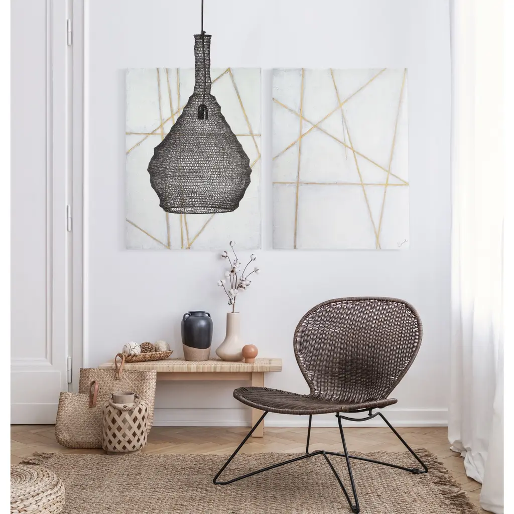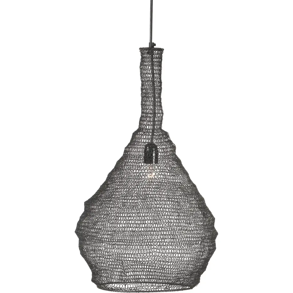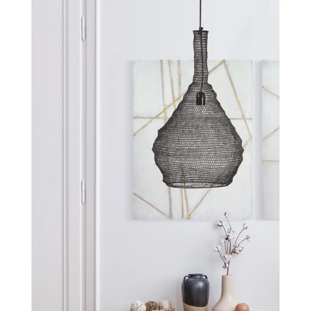 Edgy in construction, yet elegant in design, this ceiling fixture makes a bold impact in the industrial kitchen. Composed of black iron, it becomes all the more radiant when lit.