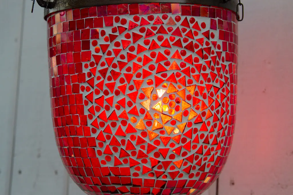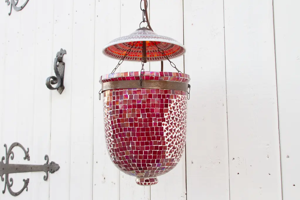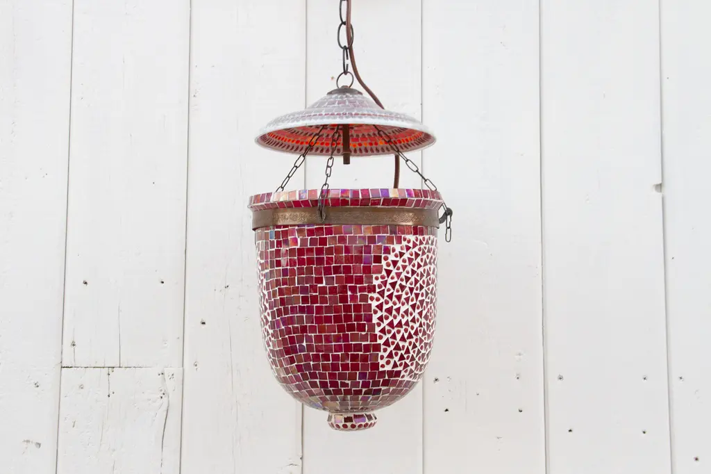 Lively and colorful, these hand-crafted mosaic lanterns are made with hand-cut pieces of hued glass in tribal geometric patterns. This lantern is two pieces with a canopy top that is chain-linked to the bottom hanging lamp. Please Note: Lantern does not come wired, light kit and bulb are not included.