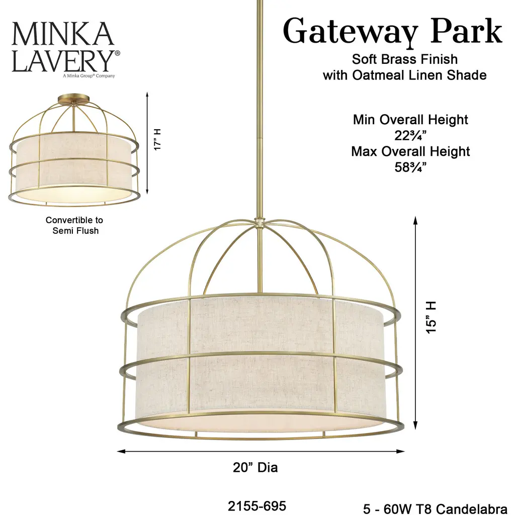 This 5 light Convertible Pendant / Semi Flush from the Gateway Park collection by Minka-Lavery will enhance your home with a perfect mix of form and function. The features include a Soft Brass finish applied by experts. This item qualifies for free shipping!