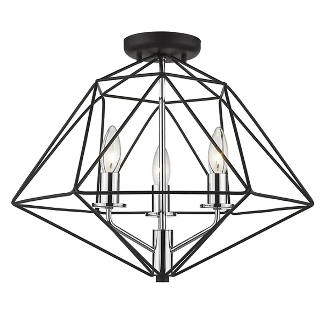 The Geary Semi-Flushmount from Alder & Ore will revitalize your modern living or dining space with dynamic energy. Its sleek geometric silhouette exudes sophistication and contemporary verve, making it the perfect addition to your interior decor. The open cage-like frame, crafted from two-tone finish metal in Matte Black and Chrome, follows enticing angles, adding an intriguing and lively element to your design scheme. Illuminate your space with style and flair, creating a captivating, energetic, and elegant ambiance.