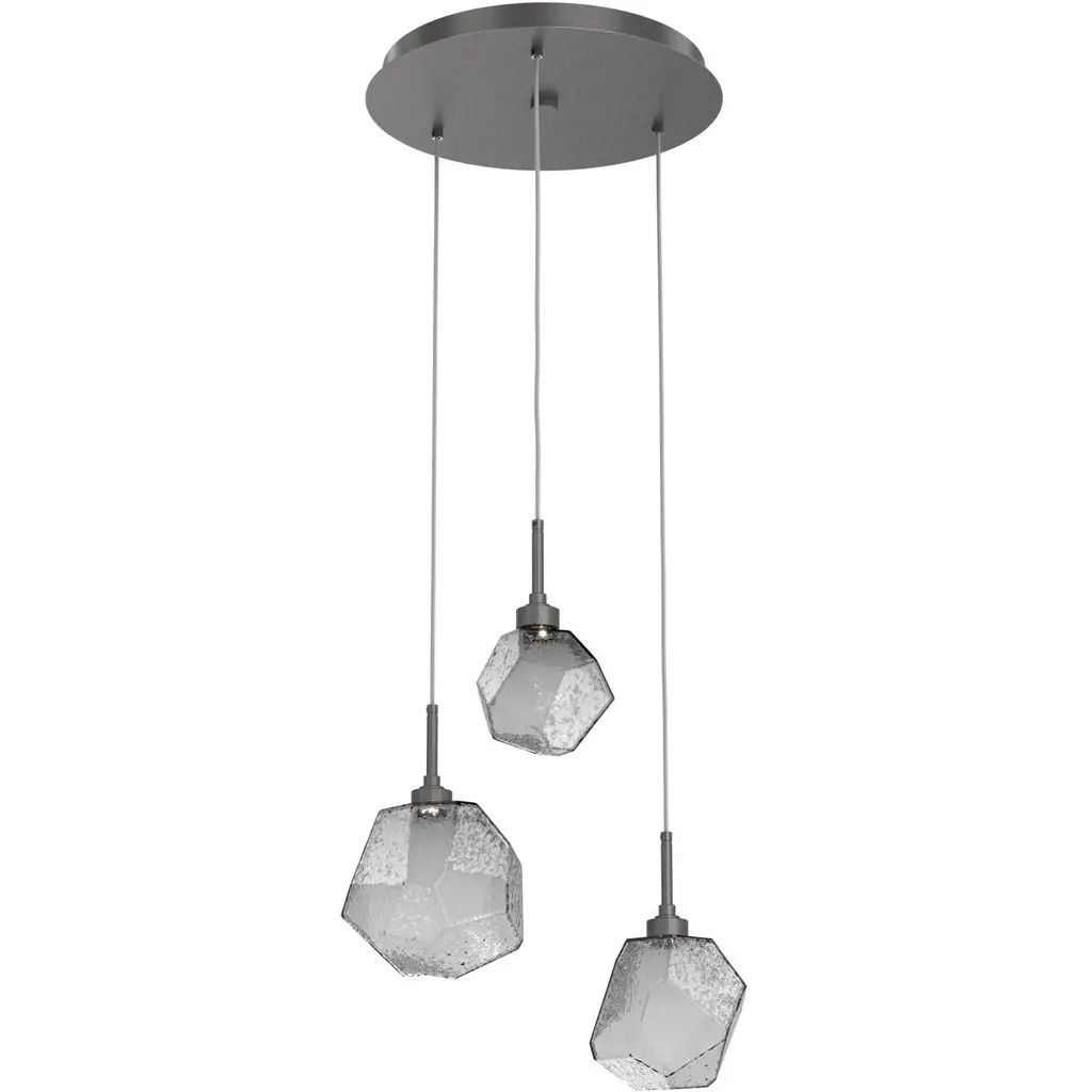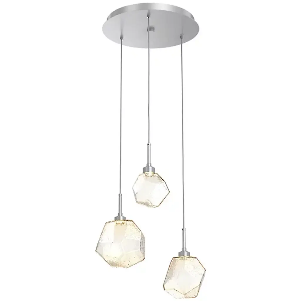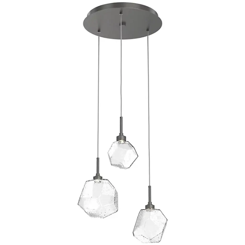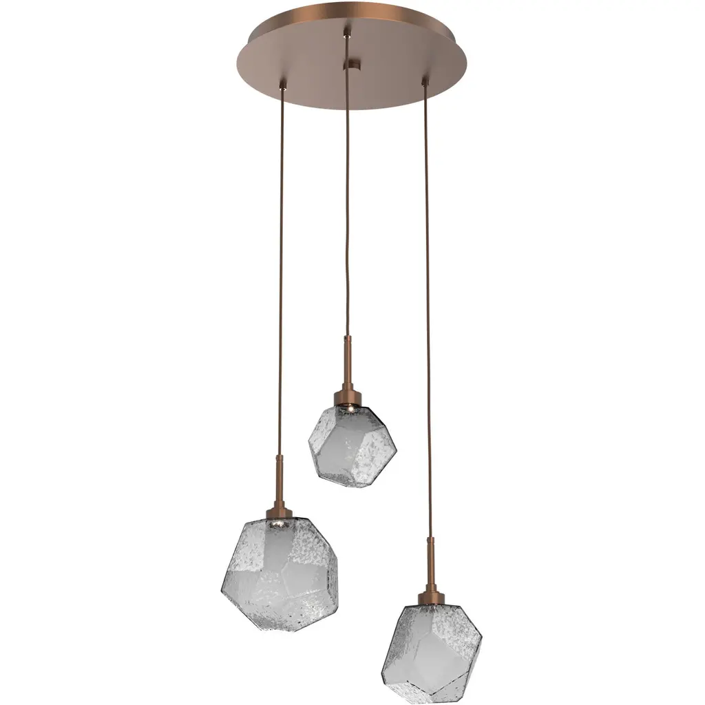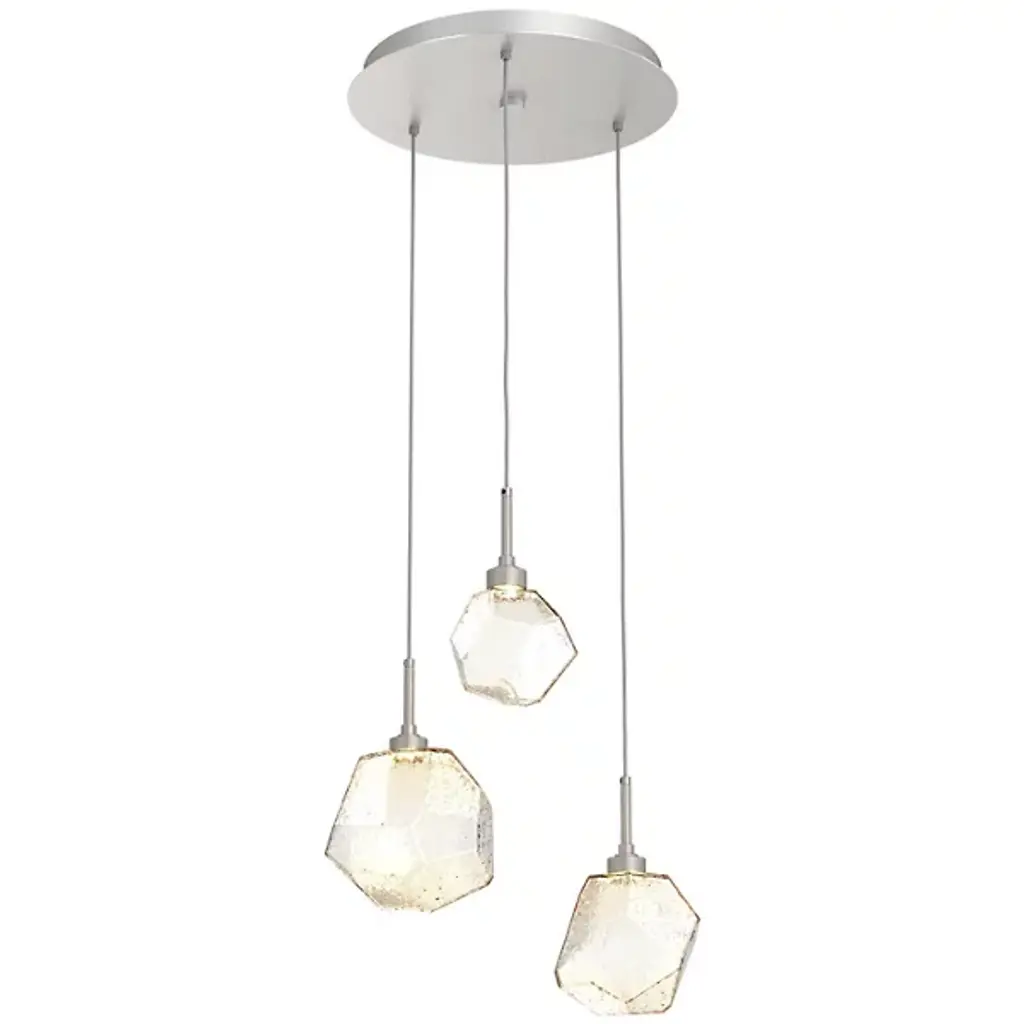Adorn your home or business with the illustrious Gem Round LED Multi-Light Pendant by Hammerton Studio. Handcrafted in America by skilled artisans, this piece adopts the appearance of hanging gemstones with its coarsely cut, blown glass shades. Each shade is held in place by a finished metal socket holder which contains an integrated LED light that shines through the glass for a dynamic, ambient effect.