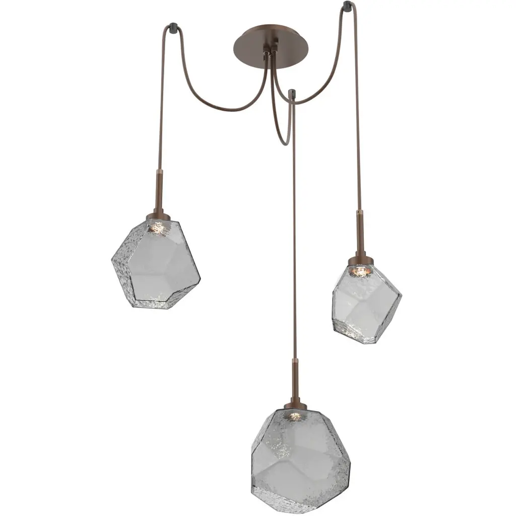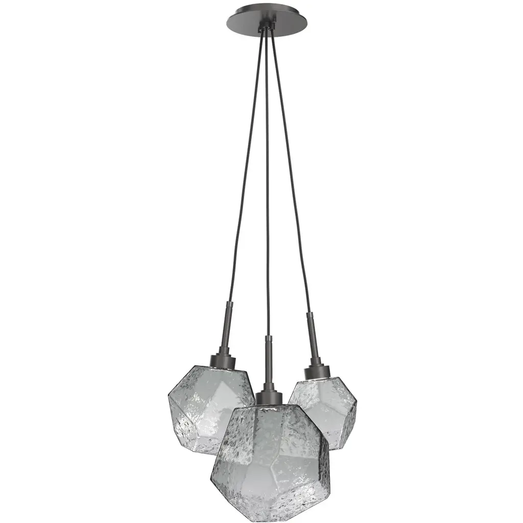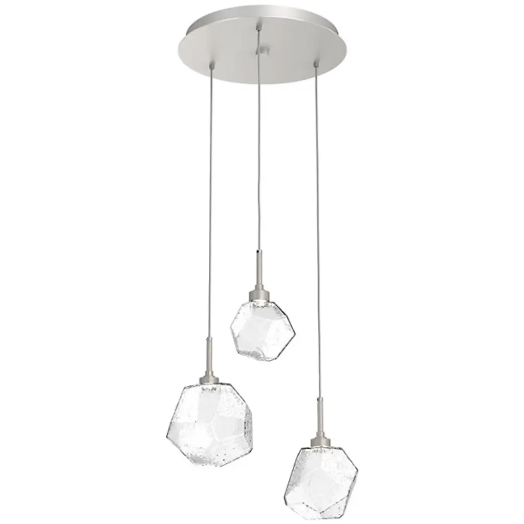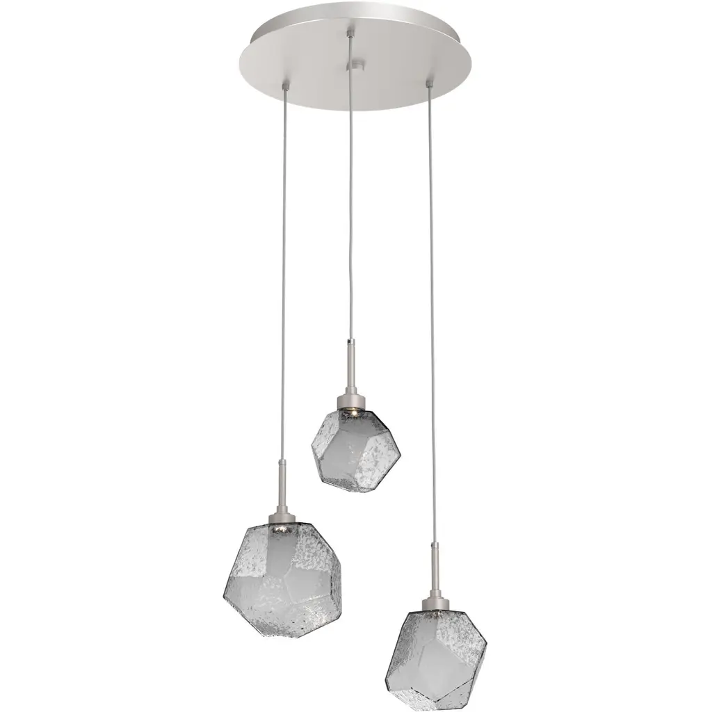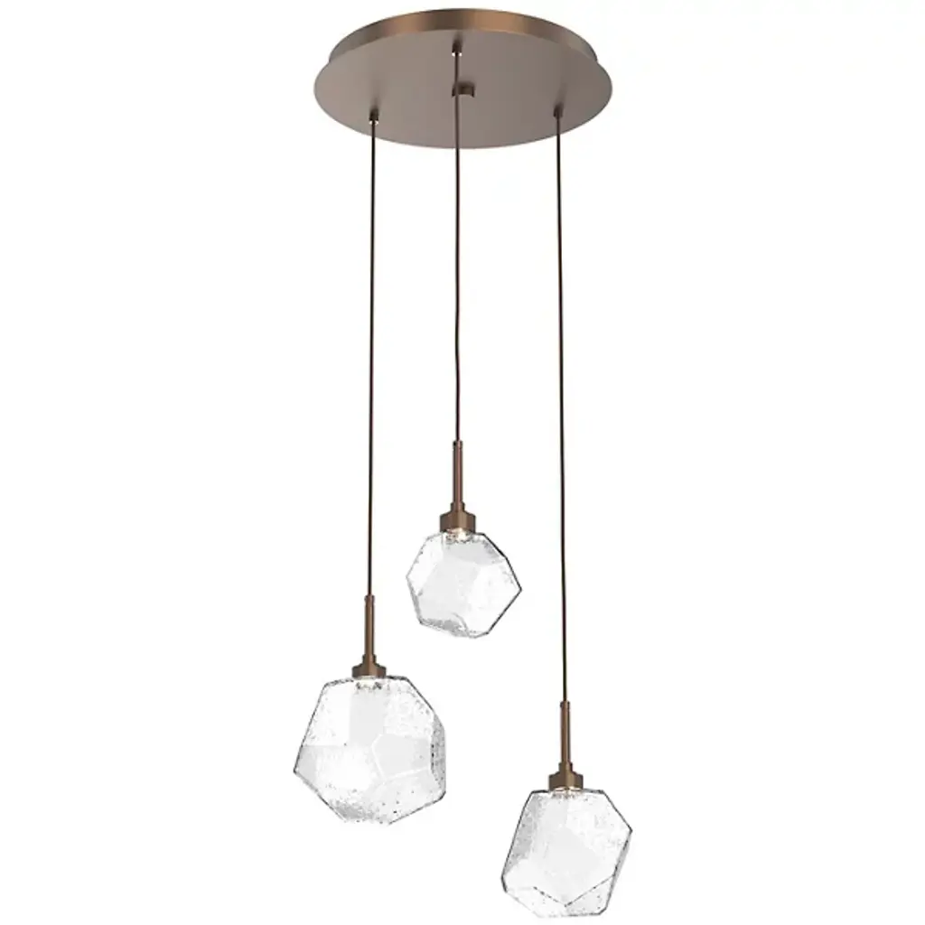 Adorn your home or business with the illustrious Gem Round LED Multi-Light Pendant by Hammerton Studio. Handcrafted in America by skilled artisans, this piece adopts the appearance of hanging gemstones with its coarsely cut, blown glass shades. Each shade is held in place by a finished metal socket holder which contains an integrated LED light that shines through the glass for a dynamic, ambient effect.