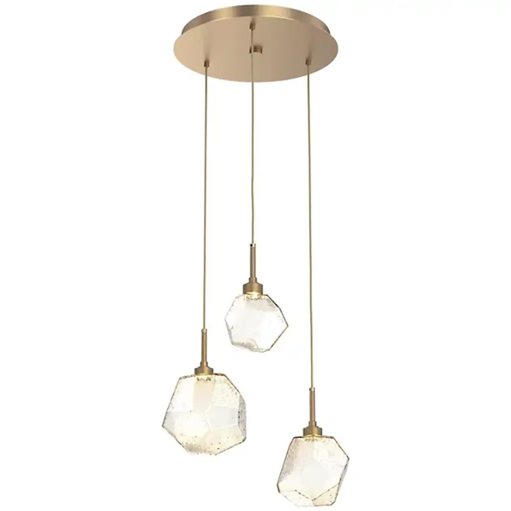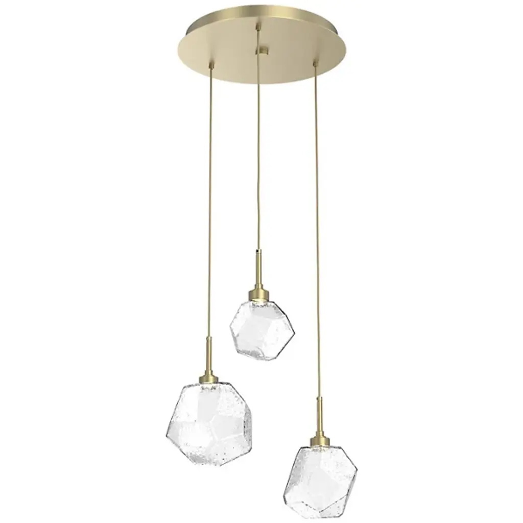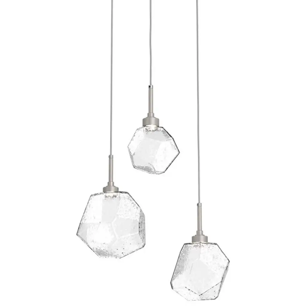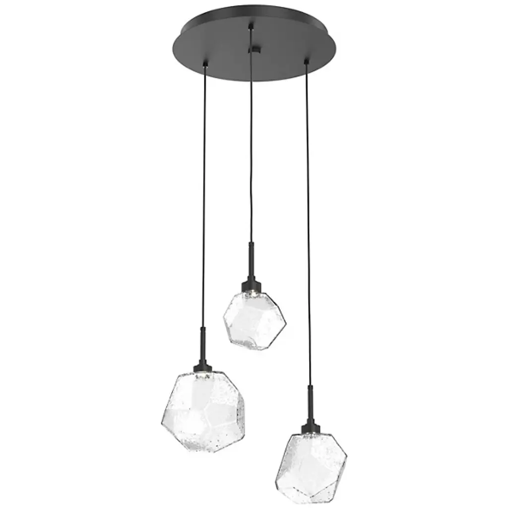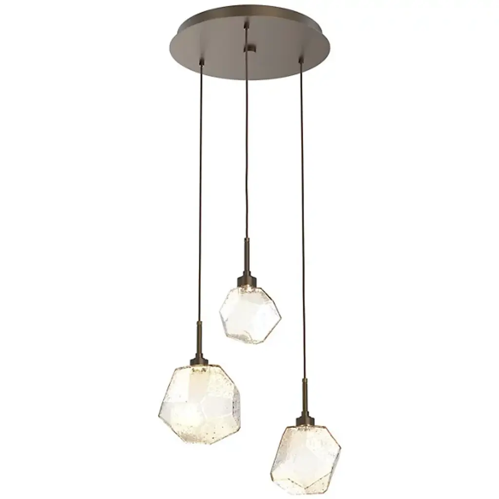 Adorn your home or business with the illustrious Gem Round LED Multi-Light Pendant by Hammerton Studio. Handcrafted in America by skilled artisans, this piece adopts the appearance of hanging gemstones with its coarsely cut, blown glass shades. Each shade is held in place by a finished metal socket holder which contains an integrated LED light that shines through the glass for a dynamic, ambient effect.