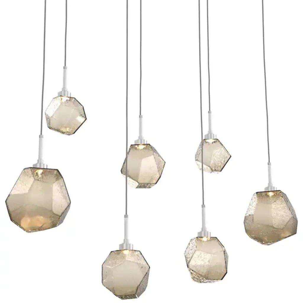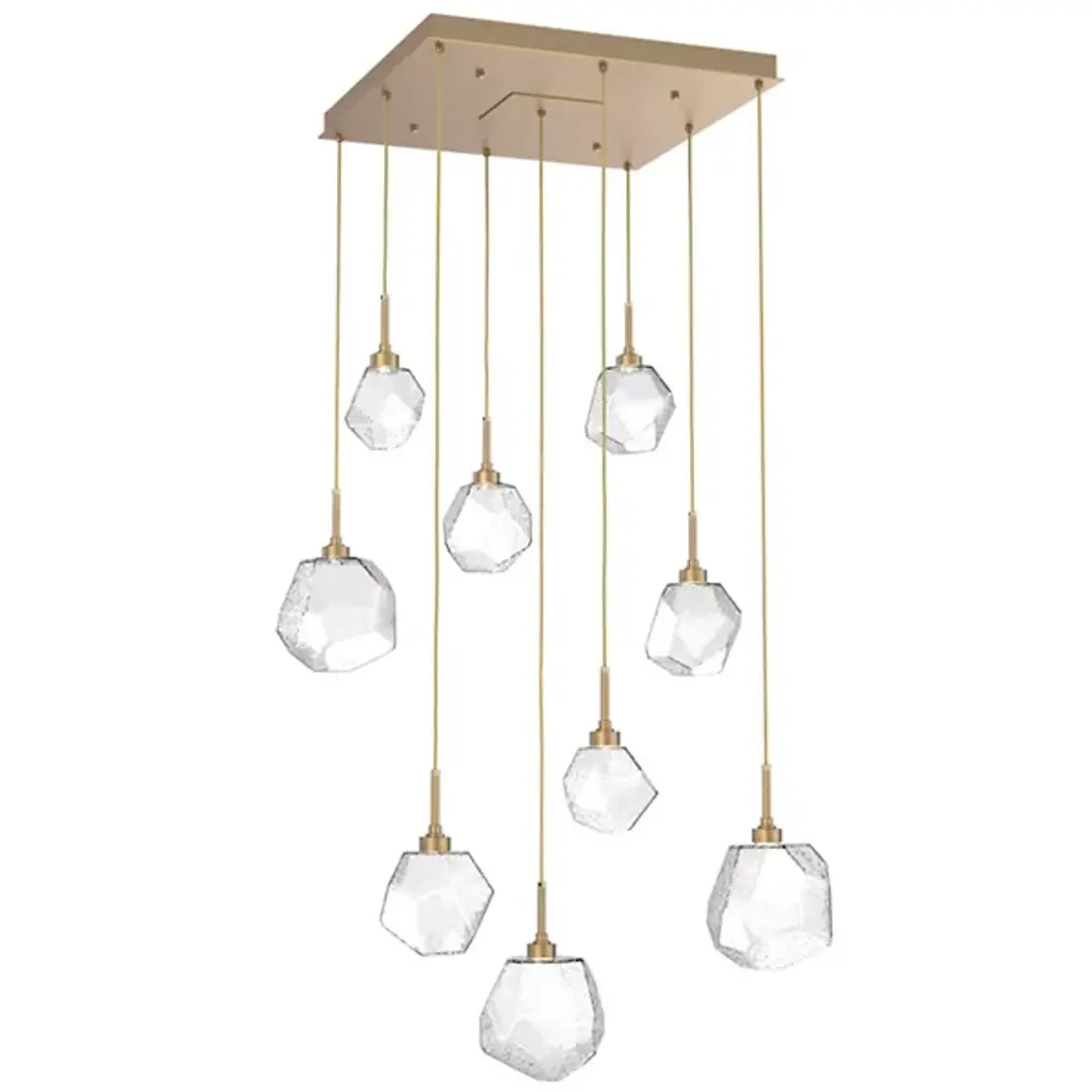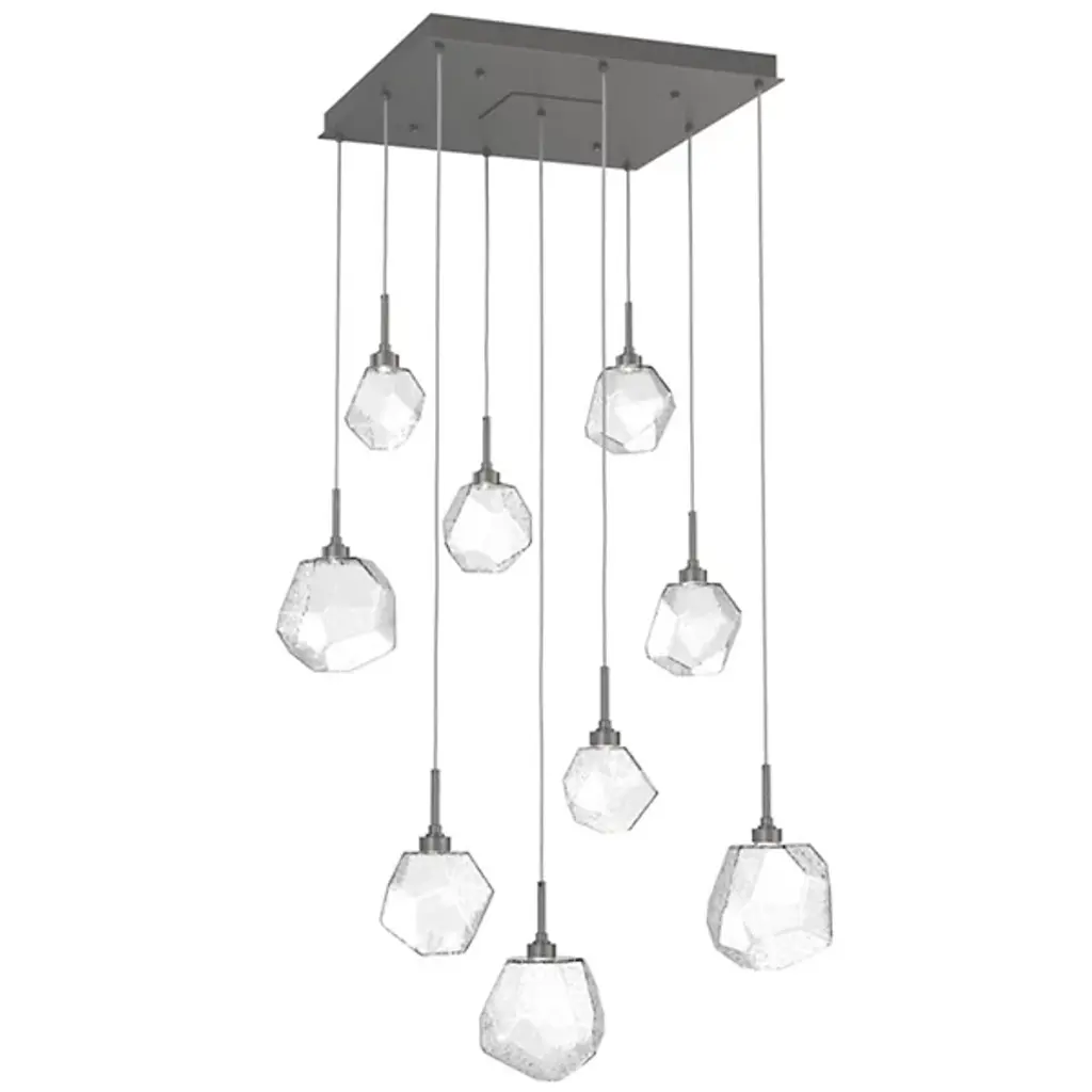 Adorn your home or business with the illustrious Gem Square LED Multi-Light Pendant by Hammerton Studio. Handcrafted in America by skilled artisans, this piece adopts the appearance of hanging gemstones with its coarsely cut, blown glass shades. Each shade is held in place by a finished metal socket holder which contains an integrated LED light that shines through the glass for a dynamic, ambient effect.