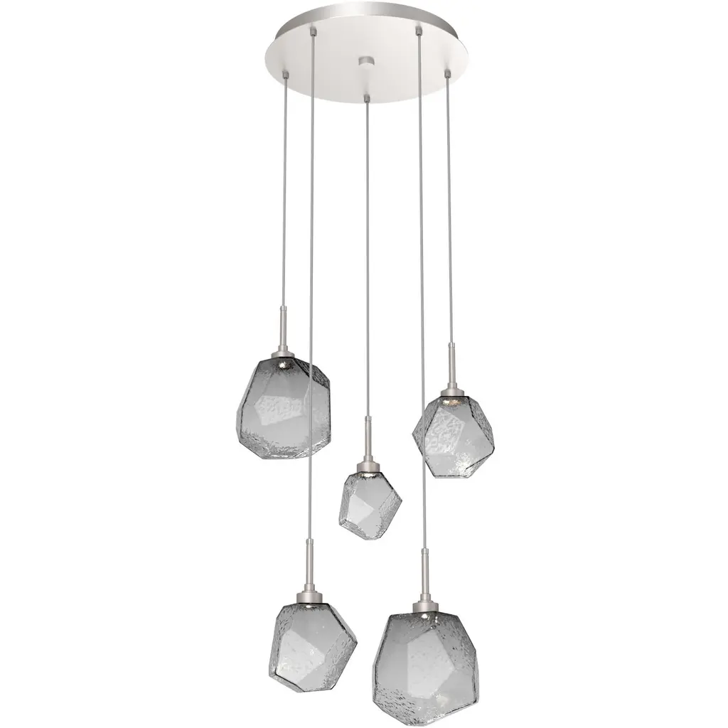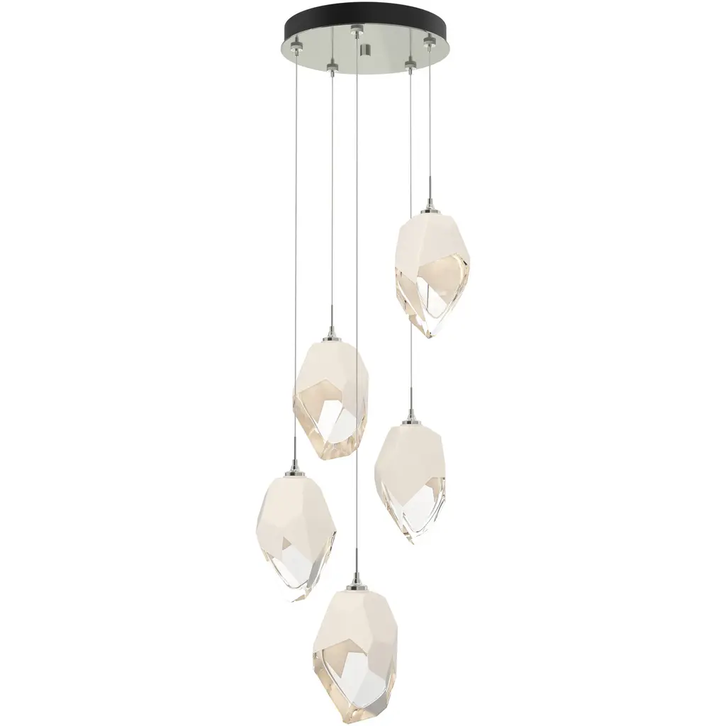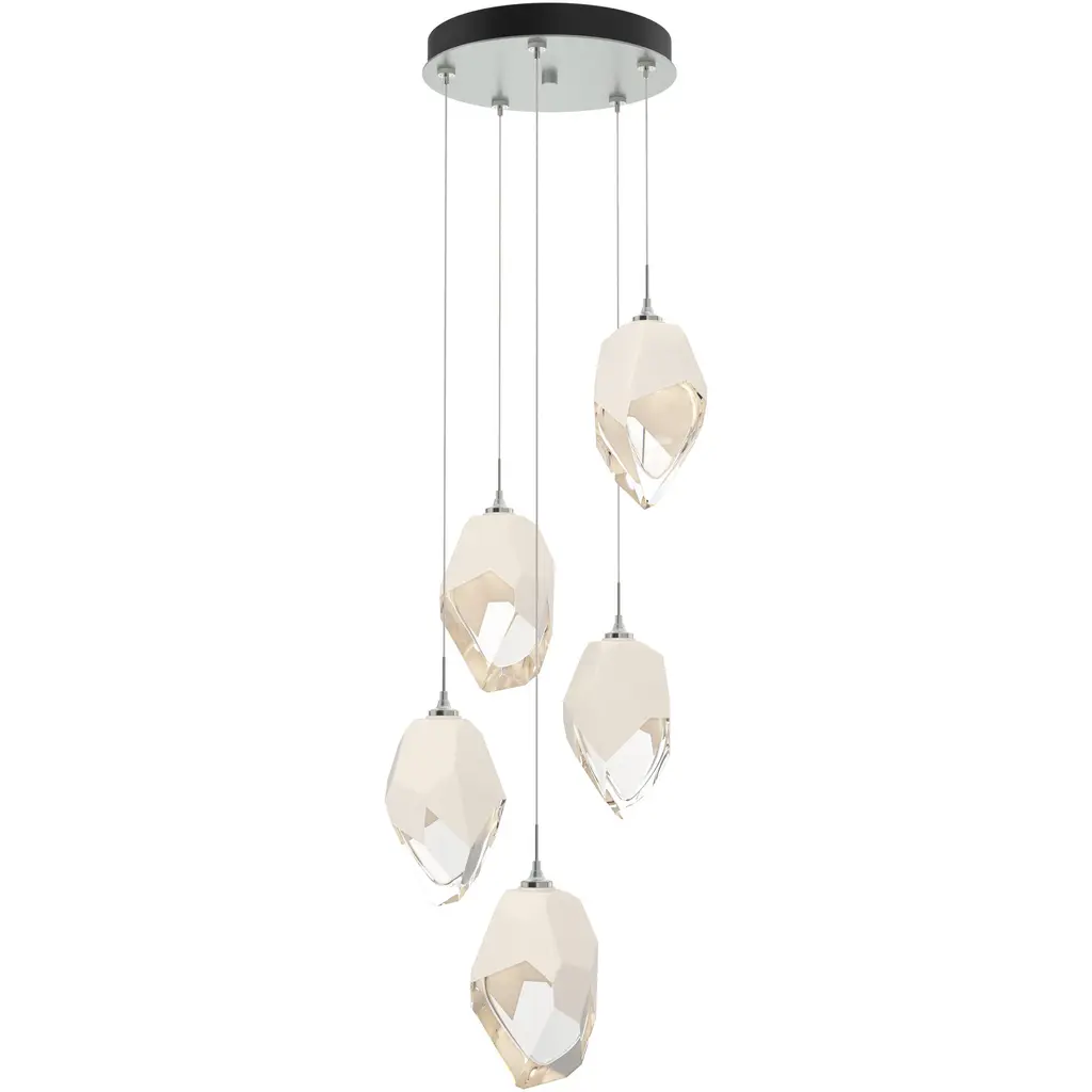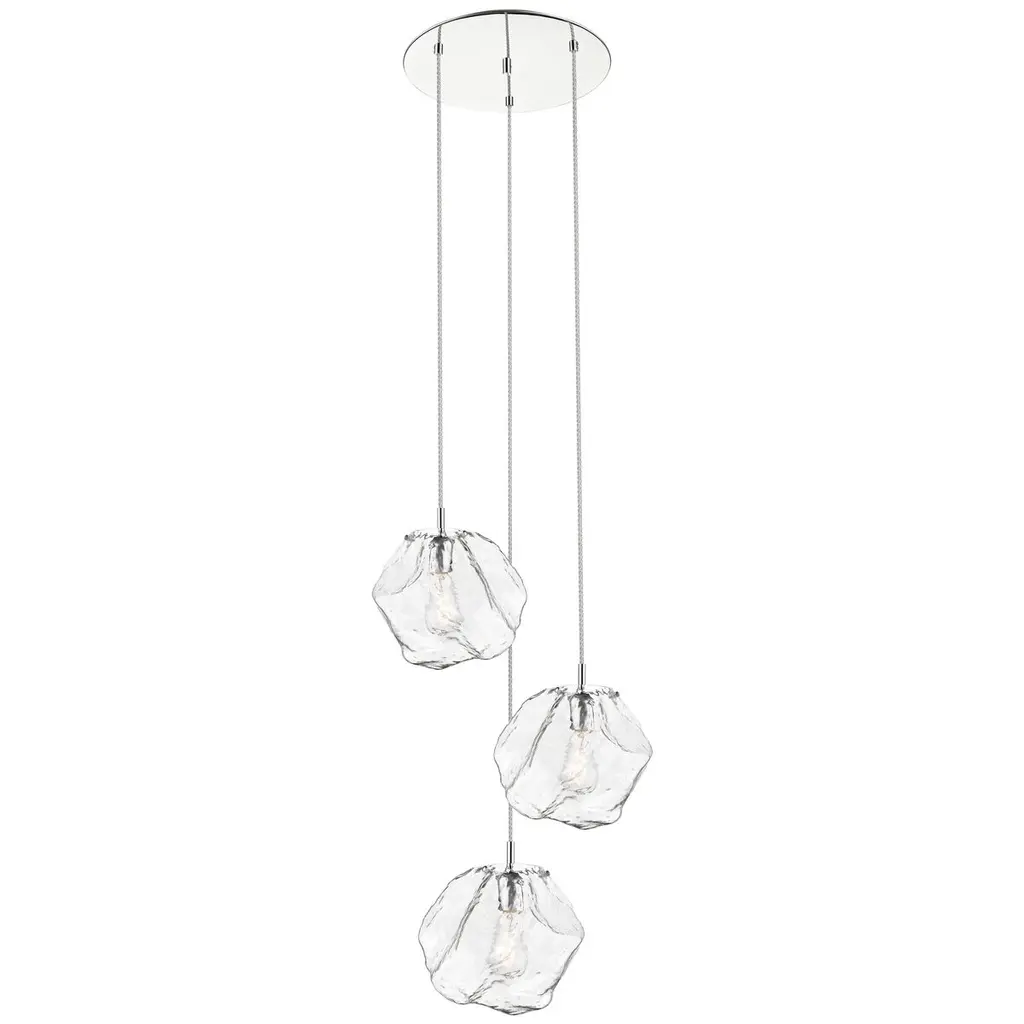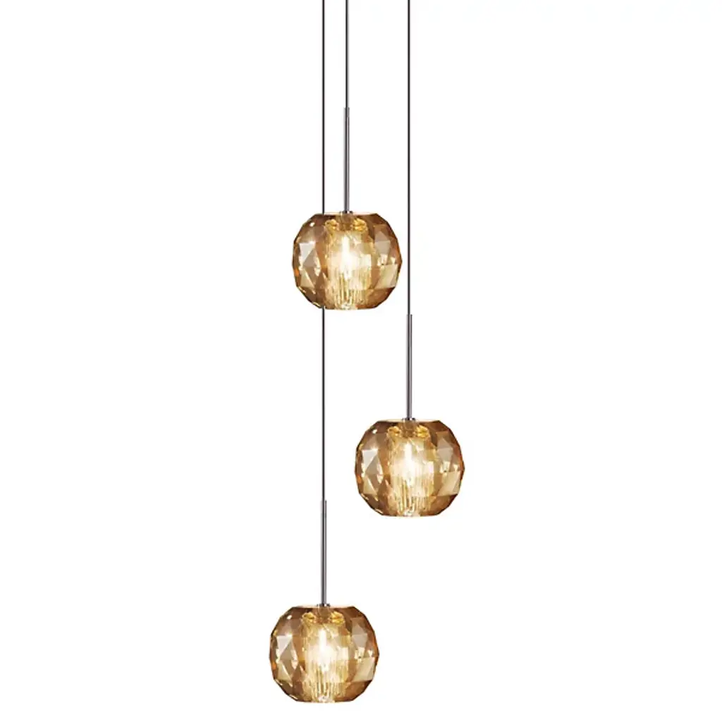 The Gemma 3-Light Multi-Light Pendant from Viso enhances indoor living areas with a simple, eye-catching style. Retained from above by a stepped, low-profile ceiling mount, it sends thin but strong cables designed by Viso engineers down to small, strong lamps set inside round shades with exteriors precision-shaped into small, even facets. This translucent layer obscures bright glare from all sides, extending a warm layer of light around each lamp accented by a sparkling spread of small spots extending in all directions.